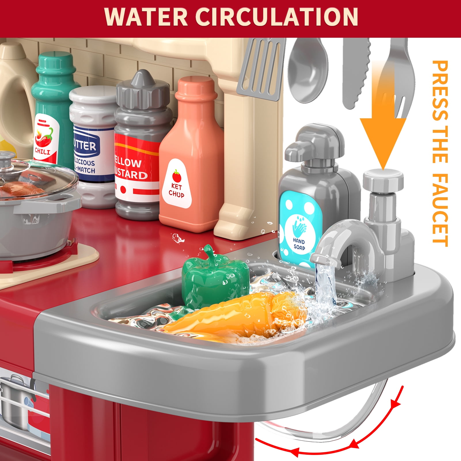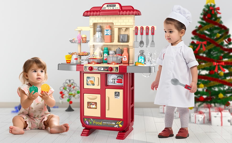 Kids can remove the knife and fork from the hanging hook, and wash the vegetables with the sink and faucet. Turn on the play kitchen stove button and you are ready to start cooking. When the toy kitchen sets sizzle sound come out , the food is almost cooked. Don’t forget to add some seasoning to make food more delicious. Toy kitchen sets requires 3 “AA” batteries. (Not Included) Kids kitchen playset is designed with water circulation which more environmentally friendly. Kids can wash vegetables, fruits, tableware in the sink. Compared to other toy kitchen sets, our kitchen playset have more storage space. You don’t have to worry about clutter and missing accessoriesKids, the kitchen playset all the cabinets can be opened and stored accessories. Kids kitchen playset is made of high quality ABS eco-friendly plastic, the edges are smooth and burr-free, which is safe for children. Our toy kitchen sets is passed physical and chemical safety tests far beyond the U.S ASTMF-963 and EU EN-71 standards. Perfect for kids role play, educational toy, early development for toddlers, kids intelligent learning toys. This kids kitchen playset comes with stickers and instructions, easy to assemble. Toy kitchen sets provides a whole lot of fun and skill during playtime. Kids can role-play with friends or parents and exercise their language & social skills. A never go wrong as a gift/toys which is perfect for birthday party, Christmas, holiday, festival, daily life, and cute nursery.