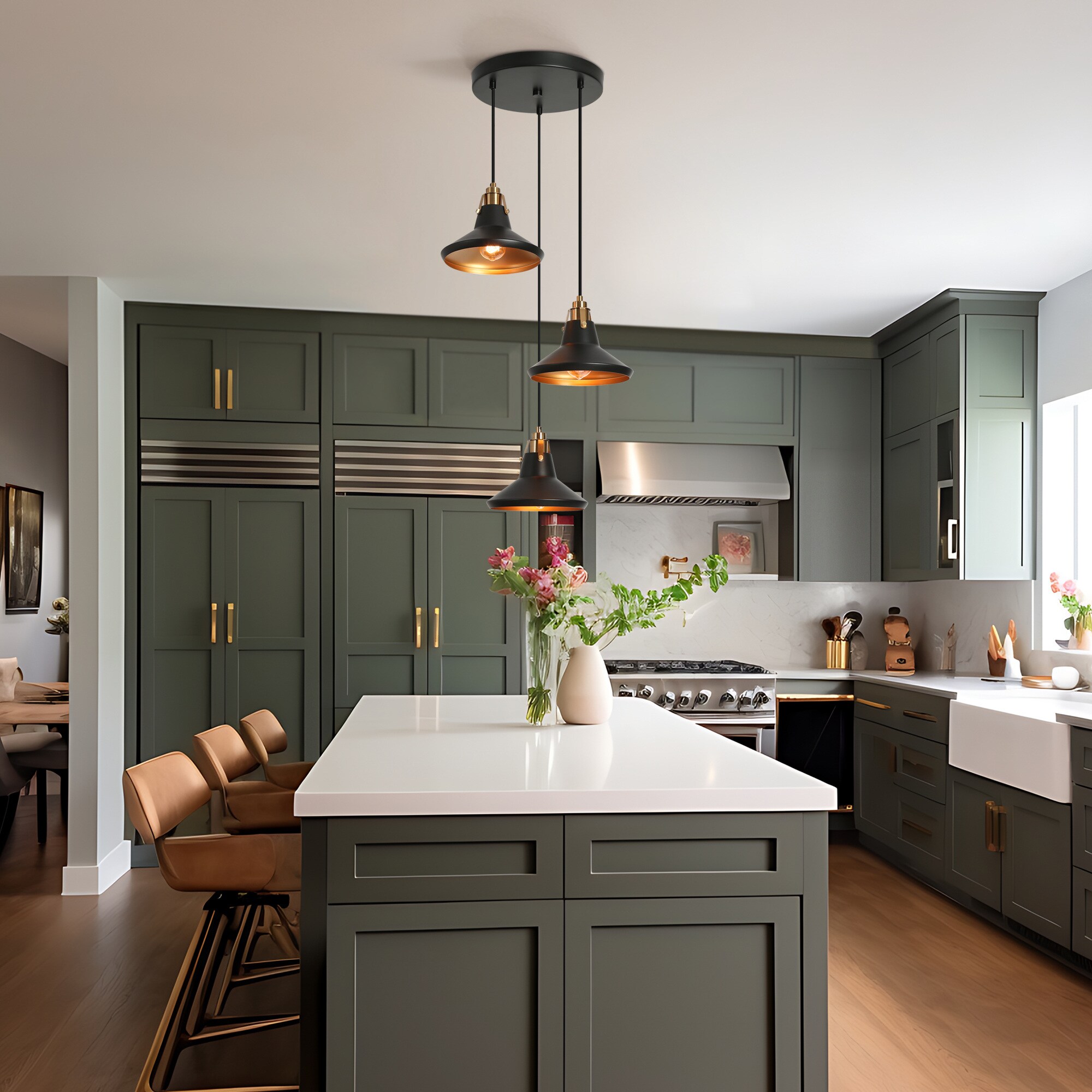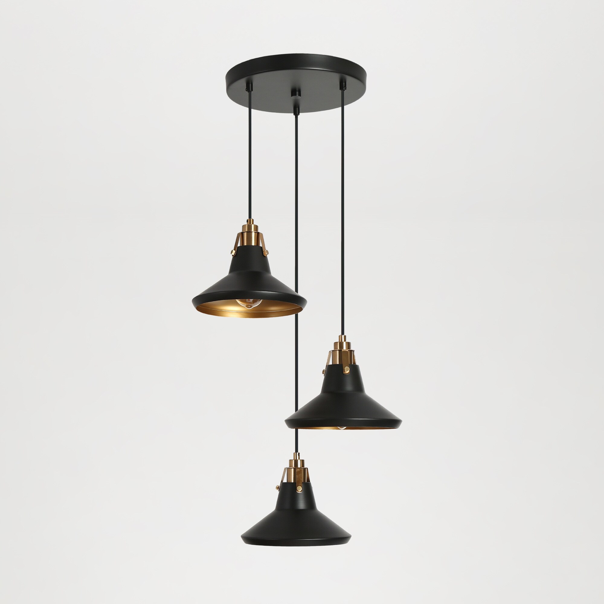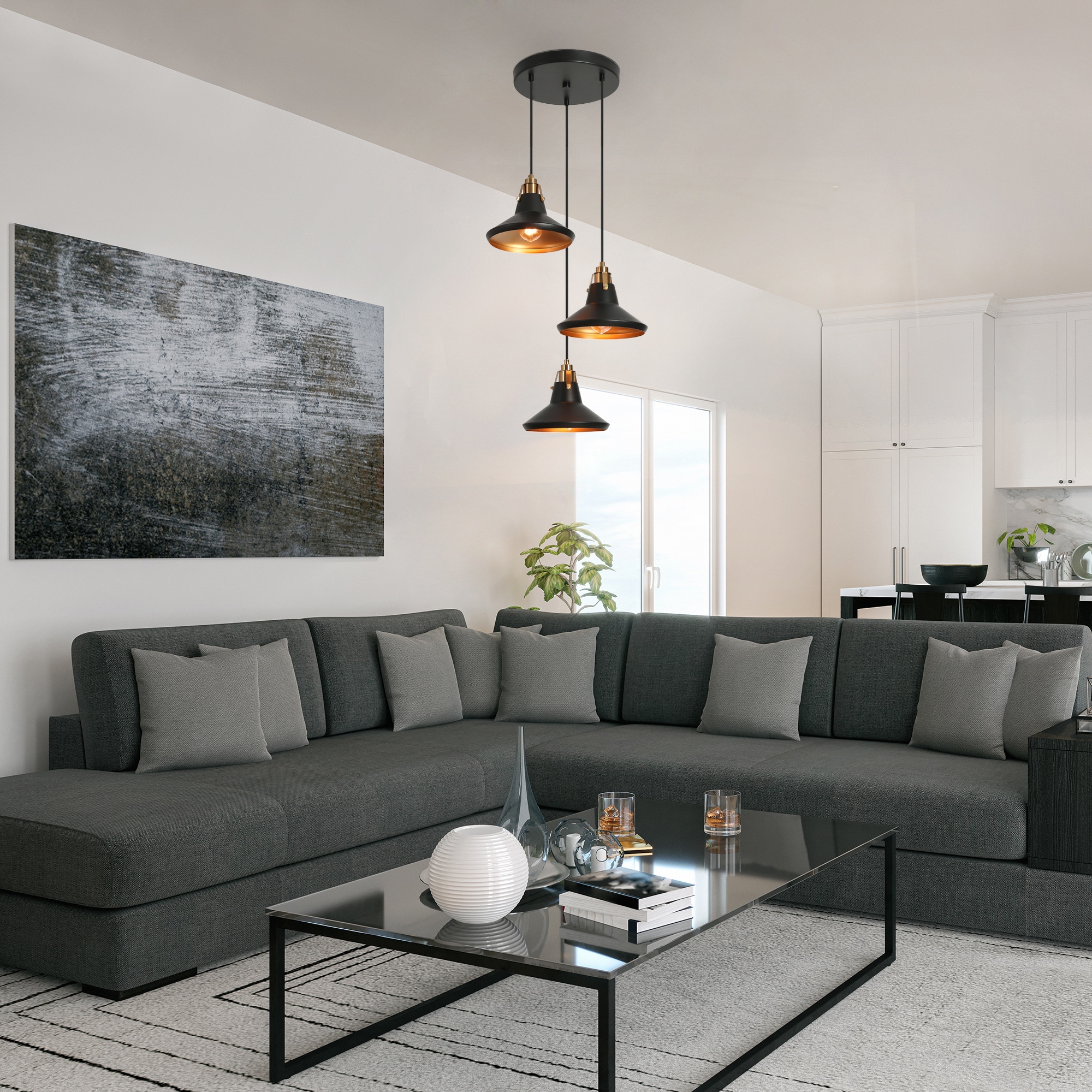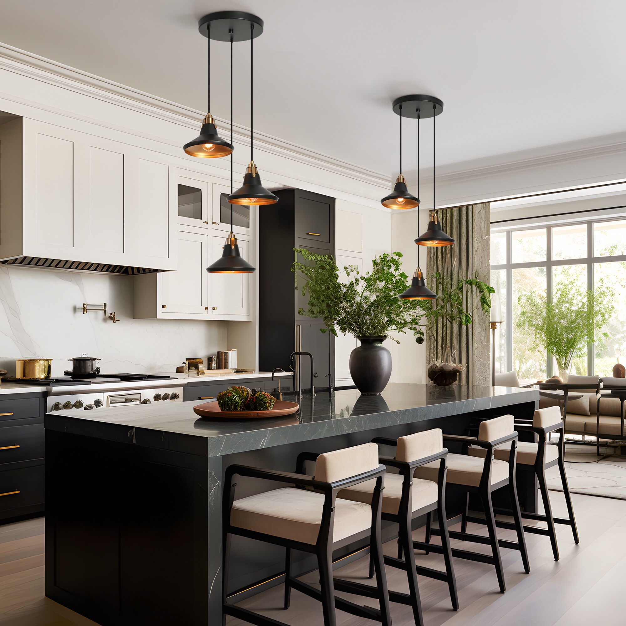 This triple pendant light fixture is perfect for modern farmhouse and industrial-style decor. The matte black finish with brass gold accents creates a bold, sleek look that complements kitchen islands or dining areas. The staggered height design adds depth and dimension, while the metallic inner shades give a warm glow. Its minimalist yet sophisticated design makes it a versatile lighting choice for contemporary spaces, enhancing the overall ambiance without overpowering the decor.