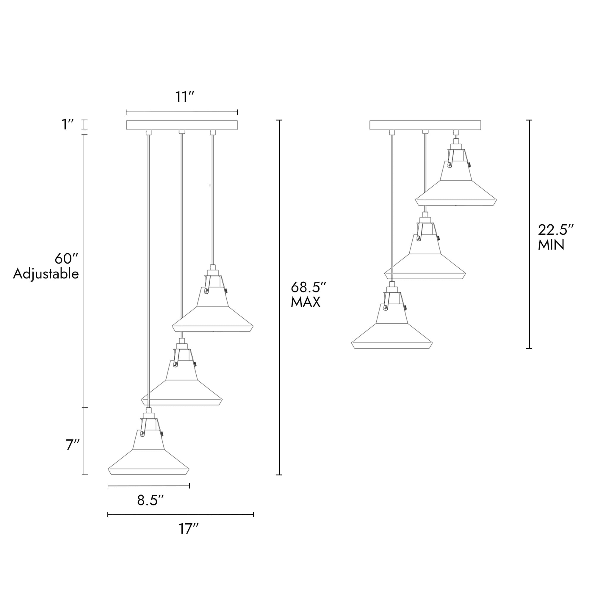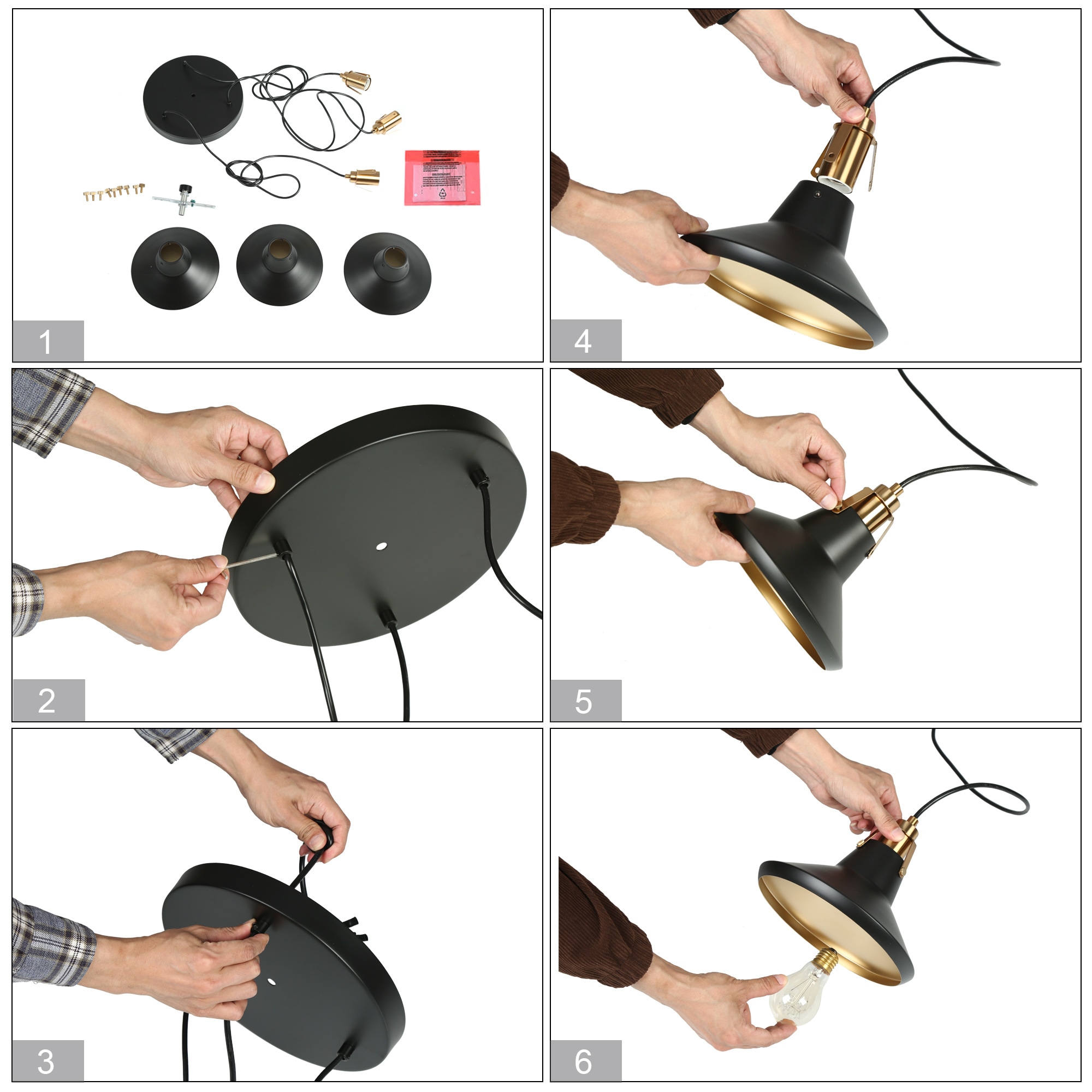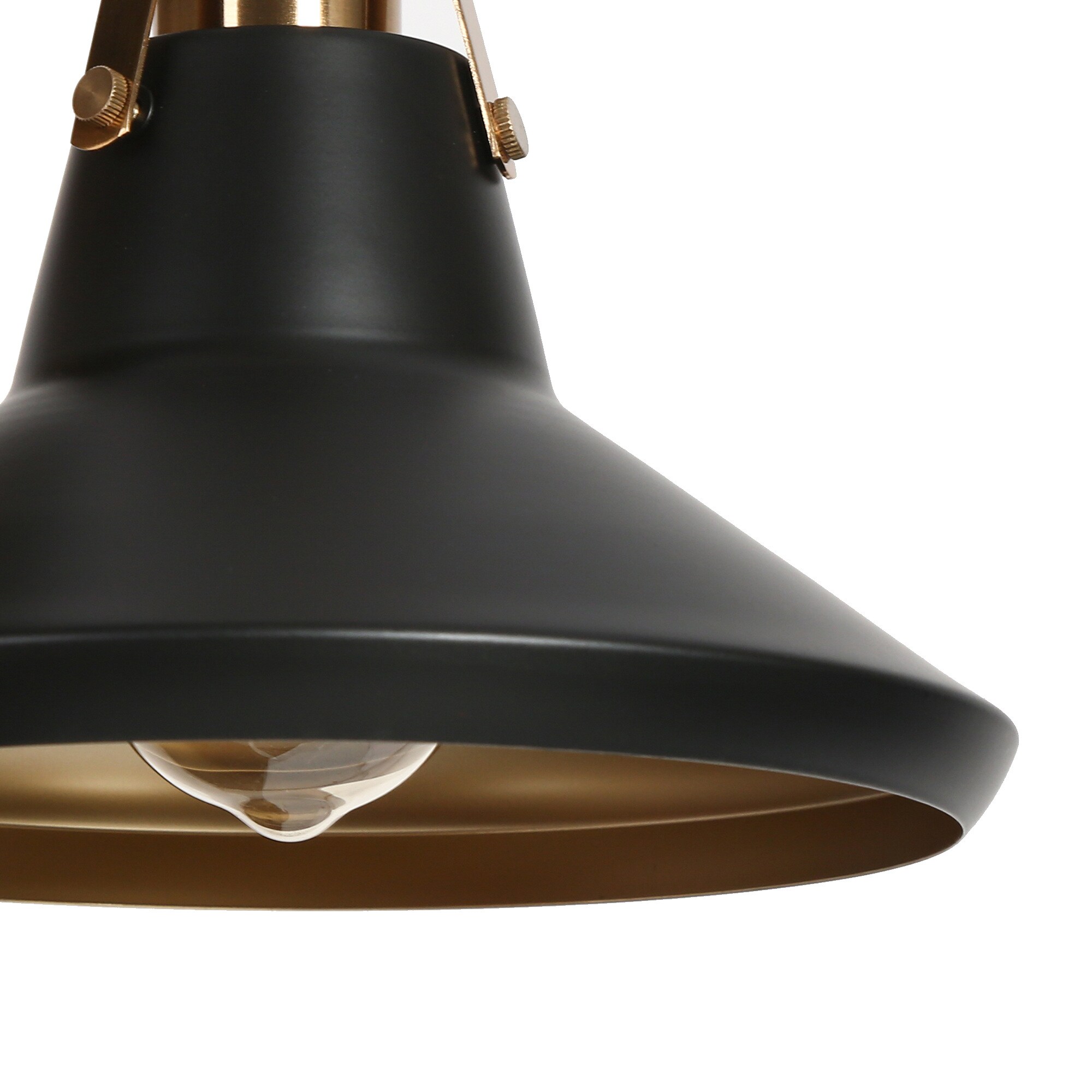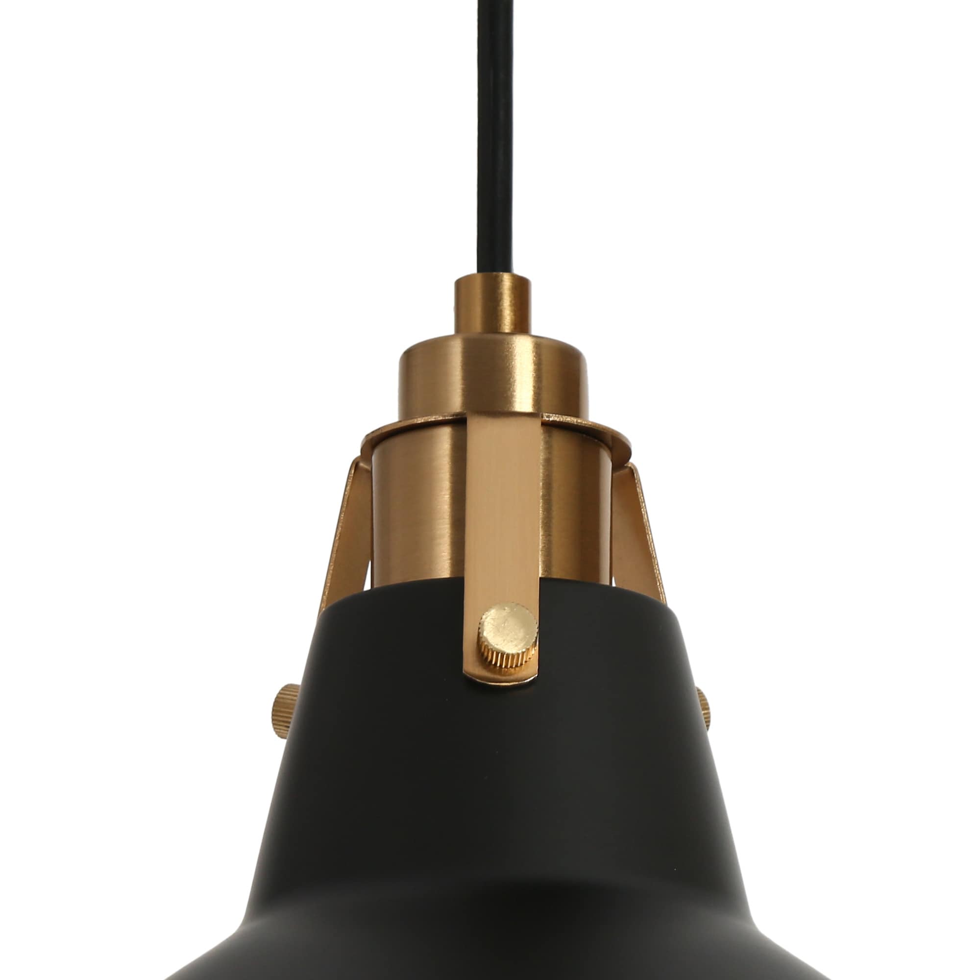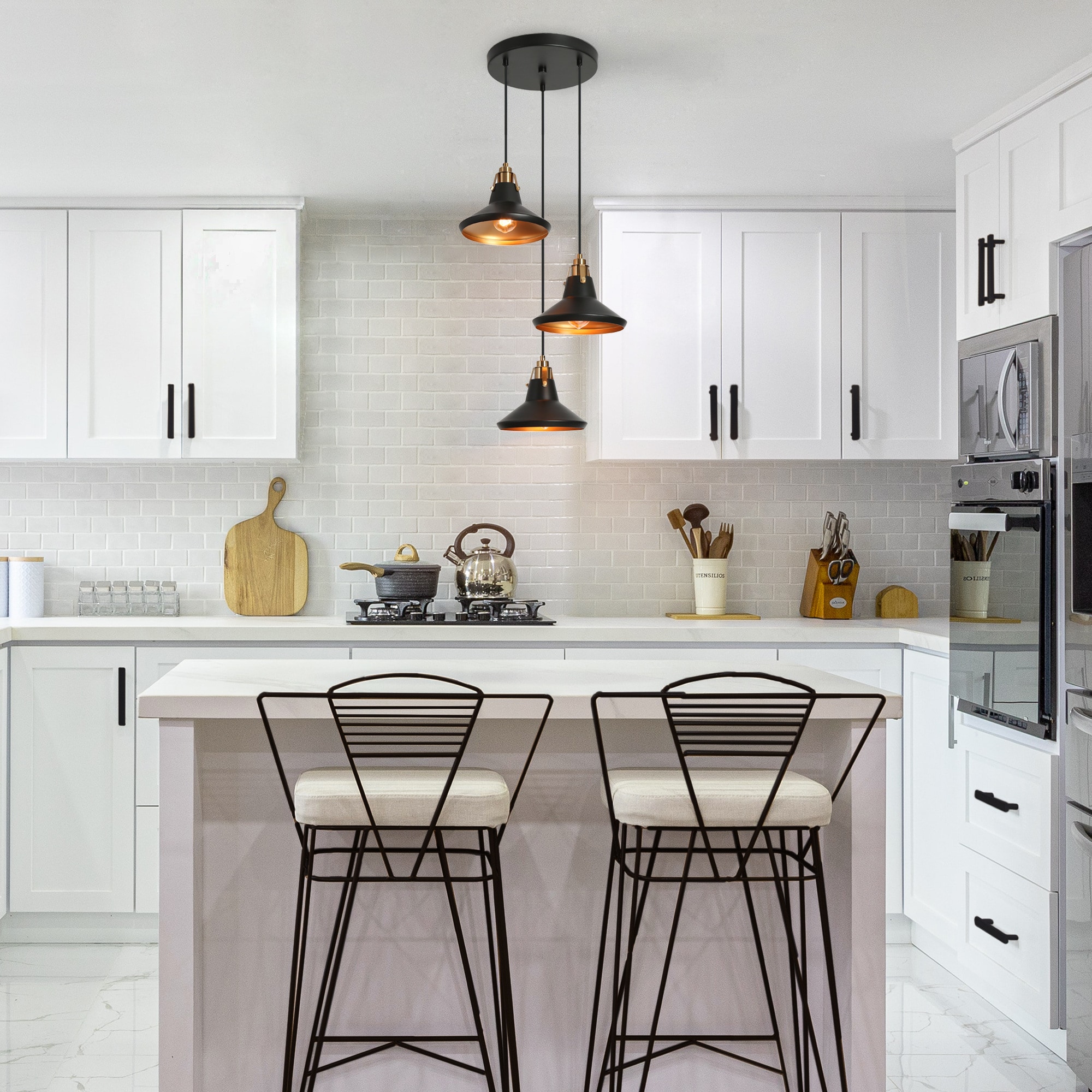 This triple pendant light fixture is perfect for modern farmhouse and industrial-style decor. The matte black finish with brass gold accents creates a bold, sleek look that complements kitchen islands or dining areas. The staggered height design adds depth and dimension, while the metallic inner shades give a warm glow. Its minimalist yet sophisticated design makes it a versatile lighting choice for contemporary spaces, enhancing the overall ambiance without overpowering the decor.