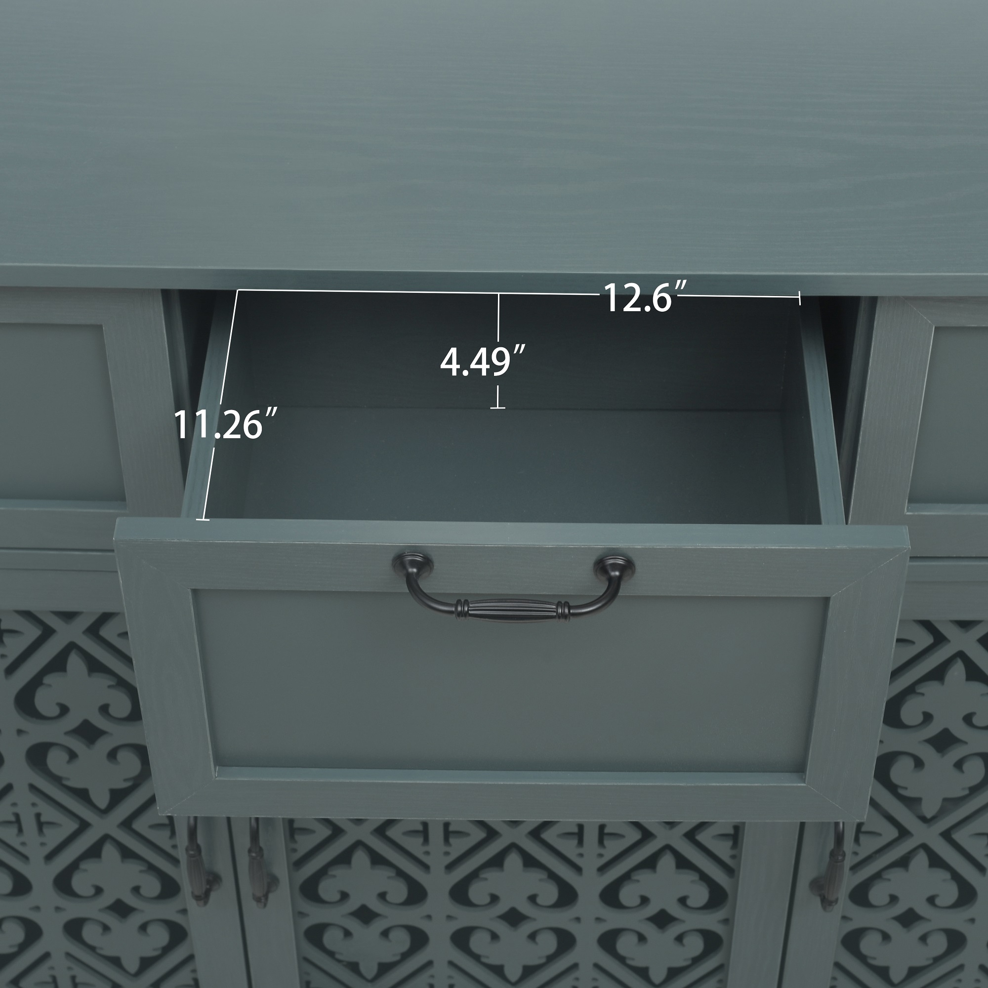Infuse retro and romantic touch into your home environment Elevate your home decor with this elegant sideboard buffet cabinet, designed to blend style and functionality seamlessly. Featuring a sophisticated hollow-carved design, this cabinet includes 3 drawers and 3 doors, each adorned with black metal handles that add a touch of refinement. Its modern aesthetic makes it a versatile addition to any room, from the dining area to the hallway, living room, or office. The cabinet offers ample storage space with adjustable shelves and a spacious top surface, ideal for organizing and displaying your essentials. Built from durable particle board and supported by solid wood legs, this piece combines stability with an eye-catching design. Easy to assemble, it comes with all necessary parts and instructions to ensure a straightforward setup. Lunale 47.24″ Retro Hollow-Carved 3 Door 3 Drawer Cabinet, Storage Sideboard Buffet Accent Cabinet for Living Room, Dark Green