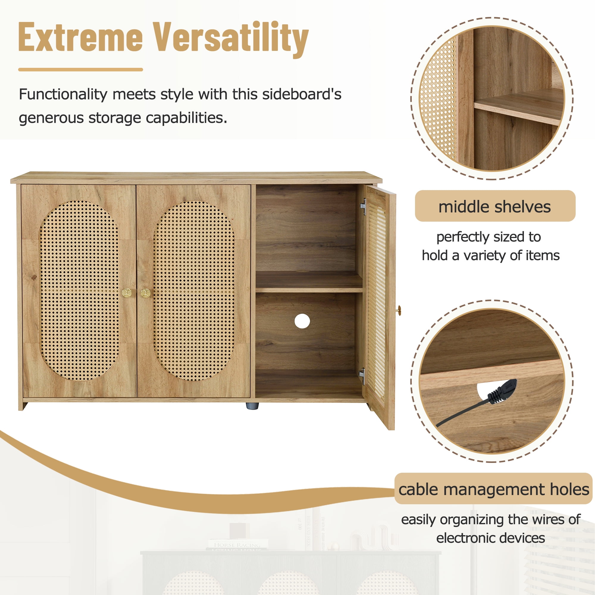 Lunale 48.8″ Retro 3-Door Storage Sideboard Cabinet with Artificial Rattan Doors for Living Room and Hallway [Vintage-Inspired Design] Combines classic charm with functionality, featuring artificial rattan door panels and metal electroplated handles for a retro aesthetic. [Generous Storage] Equipped with two middle shelves on either side, it offers ample space for dinnerware, multimedia devices, and more. Cable management holes keep wires organized. [Premium Quality] Built with durable PB and metal components, the sideboard resists warping and wear. It includes robust plastic support legs for added stability. [High Weight Capacity] Top panel supports up to 342 lbs, while the middle and bottom panels hold up to 177 lbs each, ensuring study and reliable performance. [Versatile Colors] Available in four colors—brown, white, natural wood, and antique black—to seamlessly fit various home decor styles. Full assembly required with detailed instructions provided. Product Information Main Color: Natural Main Material: Particle Board+MDF Use Case: Primary Living Space Product Dimensions: 48.8″*15.7″*32.3″ Package Contents: 1 x Cabinet 1 x Assembly Kit 1 x Instruction