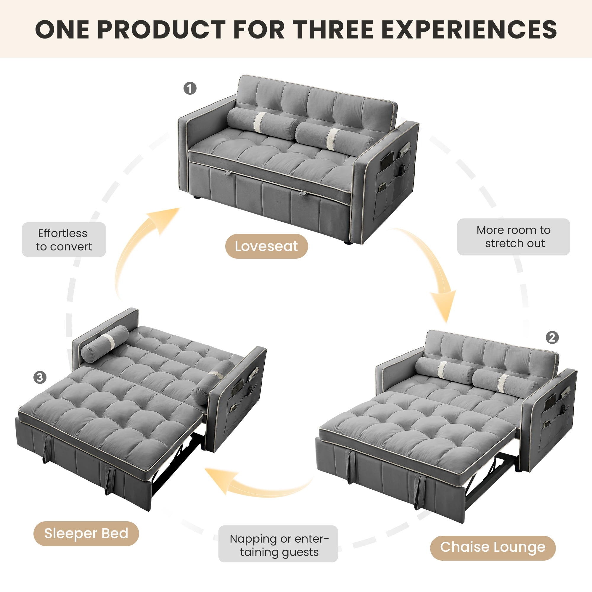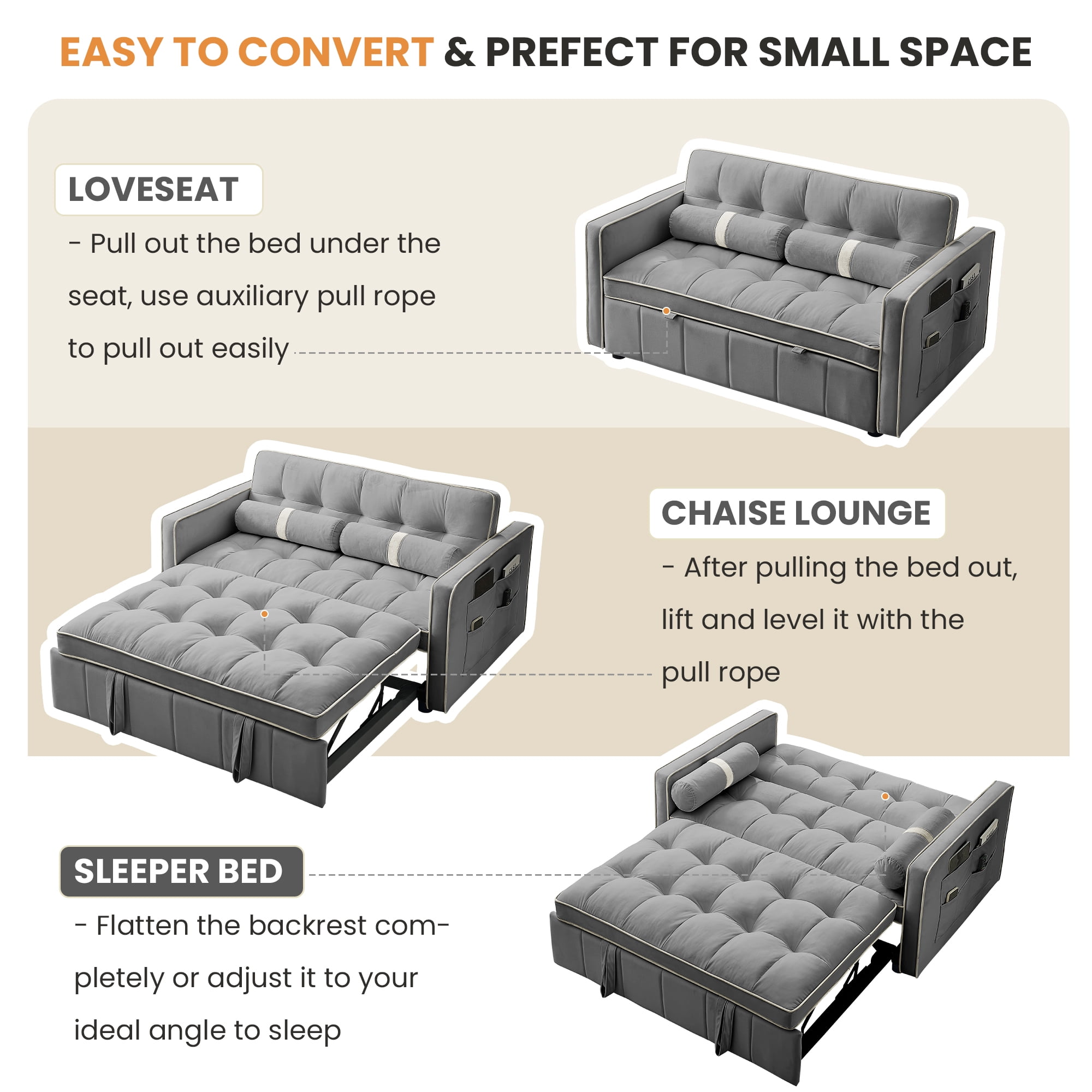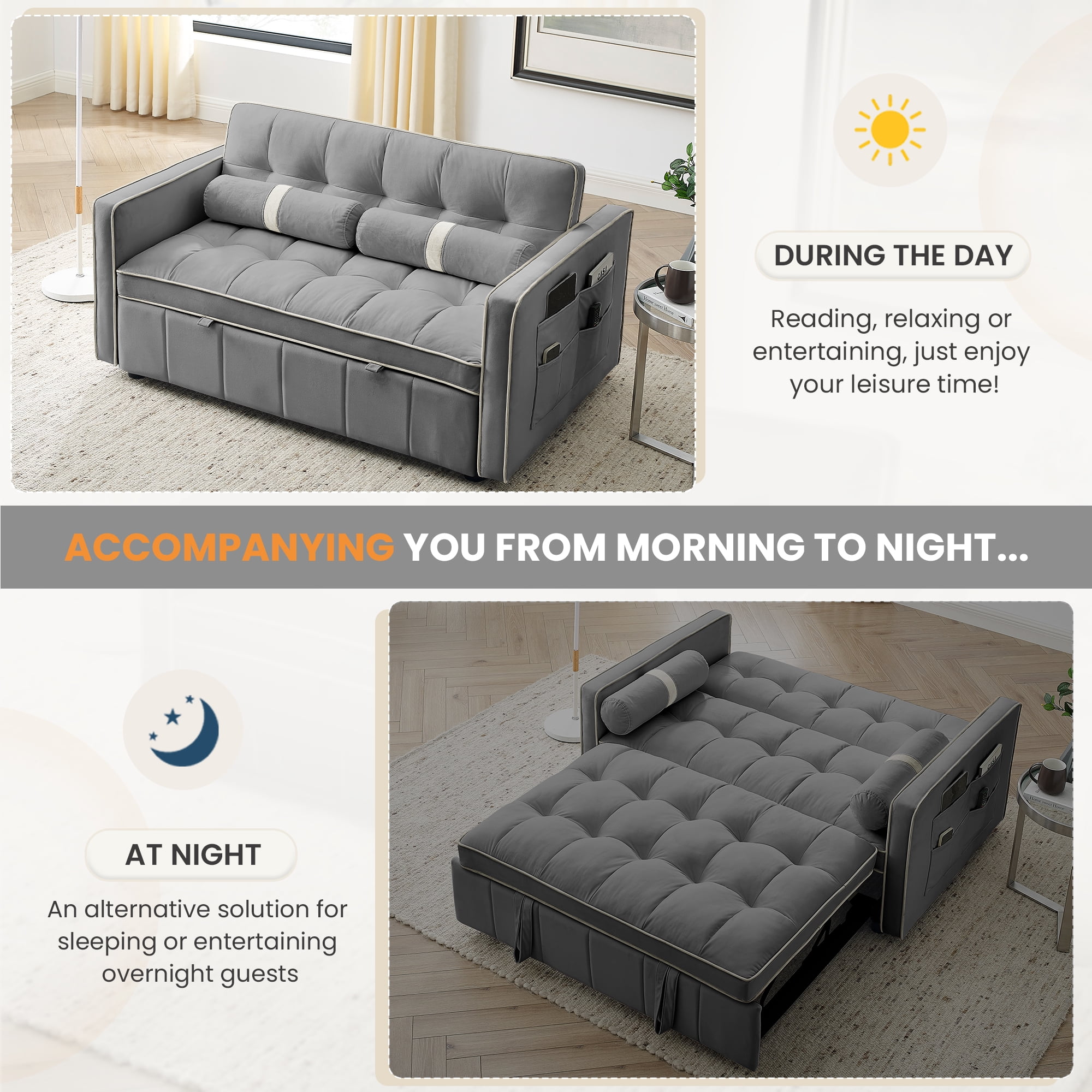 Lunale 55″ Convertible Futon Sofa Bed, Tufted Sleeper Loveseat for Living Room, Gray Velvet