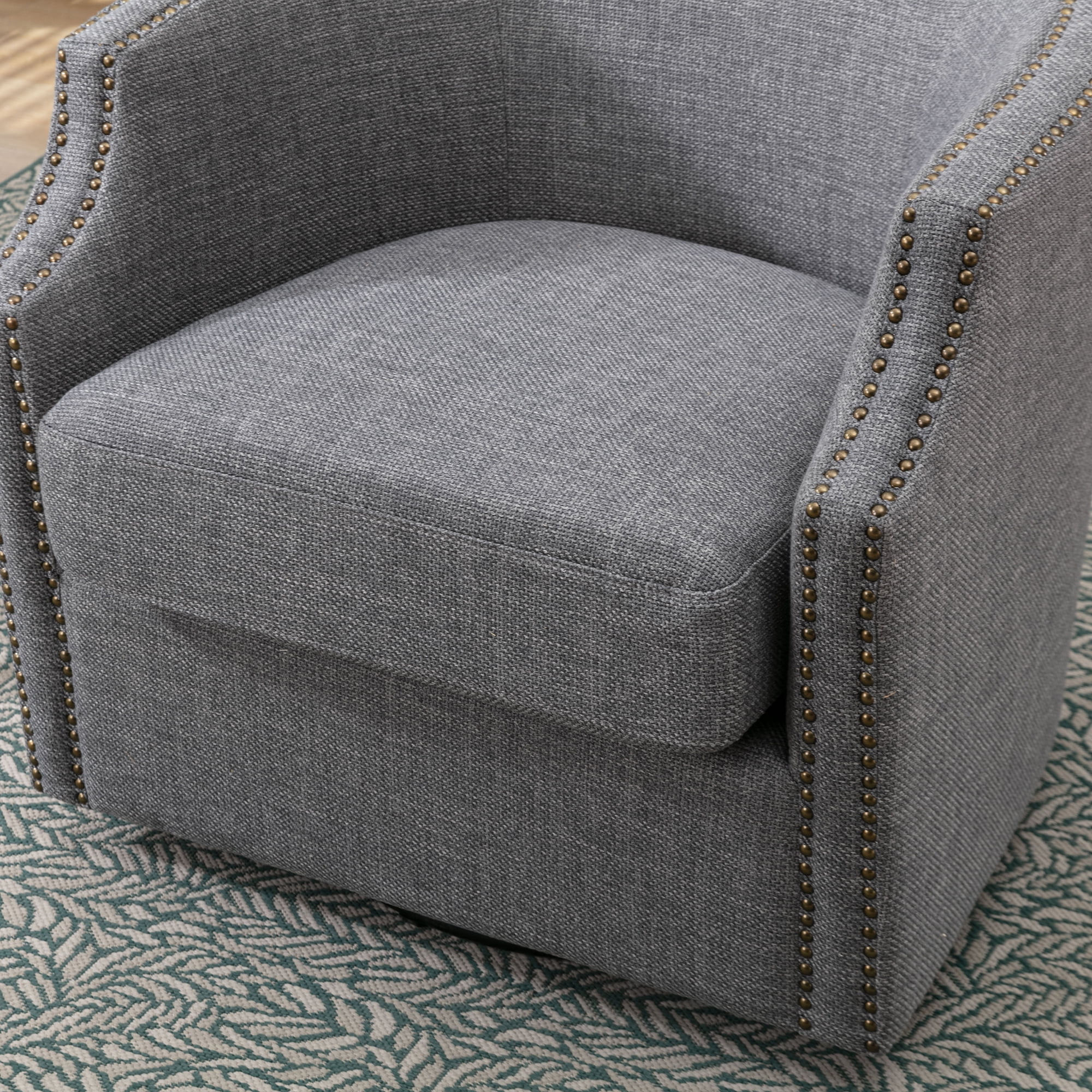 The swivel barrel chair will make a great addition to any room. This mid-century style swivel chair features a smooth 360° swivel and gentle rocking function, providing great flexibility and convenience for your living life. The seat cushion is padded with high quality fabric and high rebound foam for both beauty and comfort. The sturdy metal base supports swivel and glider functions, and the armrests are elegantly curved and adorned with nailheads, which are not only aesthetically pleasing but also relaxing for your arms. In addition, it is an impressive centerpiece for professional venues such as business meeting rooms, creating a comfortable environment for conversation.