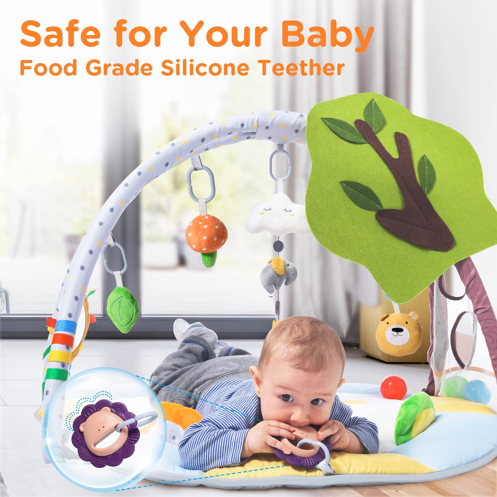 ✨Special Tree Design and Ball Pit: Our lion baby play mat is specially designed with a green tree, and brown branch and comes with a ball pit and 4 colorful balls, which can attract your baby well and you can have fun with your baby to enhance the parent-child relationship. ✨All-Round Early Development: 9 removable toys, fully meet the baby’s growth needs of Visual, Hearing, and Touch, Cognitive and Physical coordination. Baby safe mirror for self-discovery; Sound toy bear, lion’s ears, green leaves, and cloud for hearing; Colorful balls and cloud for baby’s touching, 2 soothing BPA free teethers for teething, and the cards for graphics and colors cognitive. ✨Soft, Thick, and Washable: The baby gym play mat is made from high-quality fabrics, thick with fine and smooth touch. It is safe and comfortable for baby skin. It is washable, easy to clean, and keep hygienic. Besides, we effectively balance the flatness and softness of the gym mat, so that the baby can sit or stand more stably. ✨Large and Multifunctional: Our baby gym play mats give babies plenty of space for happy tummy activities and games, which can help the baby grow from newborn to an active toddler and allows the baby to experience more fun and new challenges. ✨Easy to Set Up and Take Down: Baby-safe materials and a non-slip bottom. It can be installed or disassembled quickly in one minute, and it is small in size and easy to fold and carry for convenient storage or travel. If any problems, pls feel free to contact us at the official after-sales mailbox.