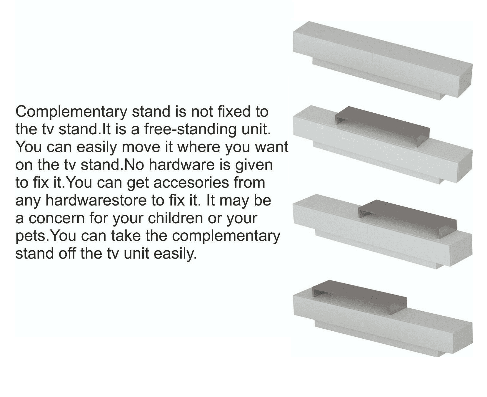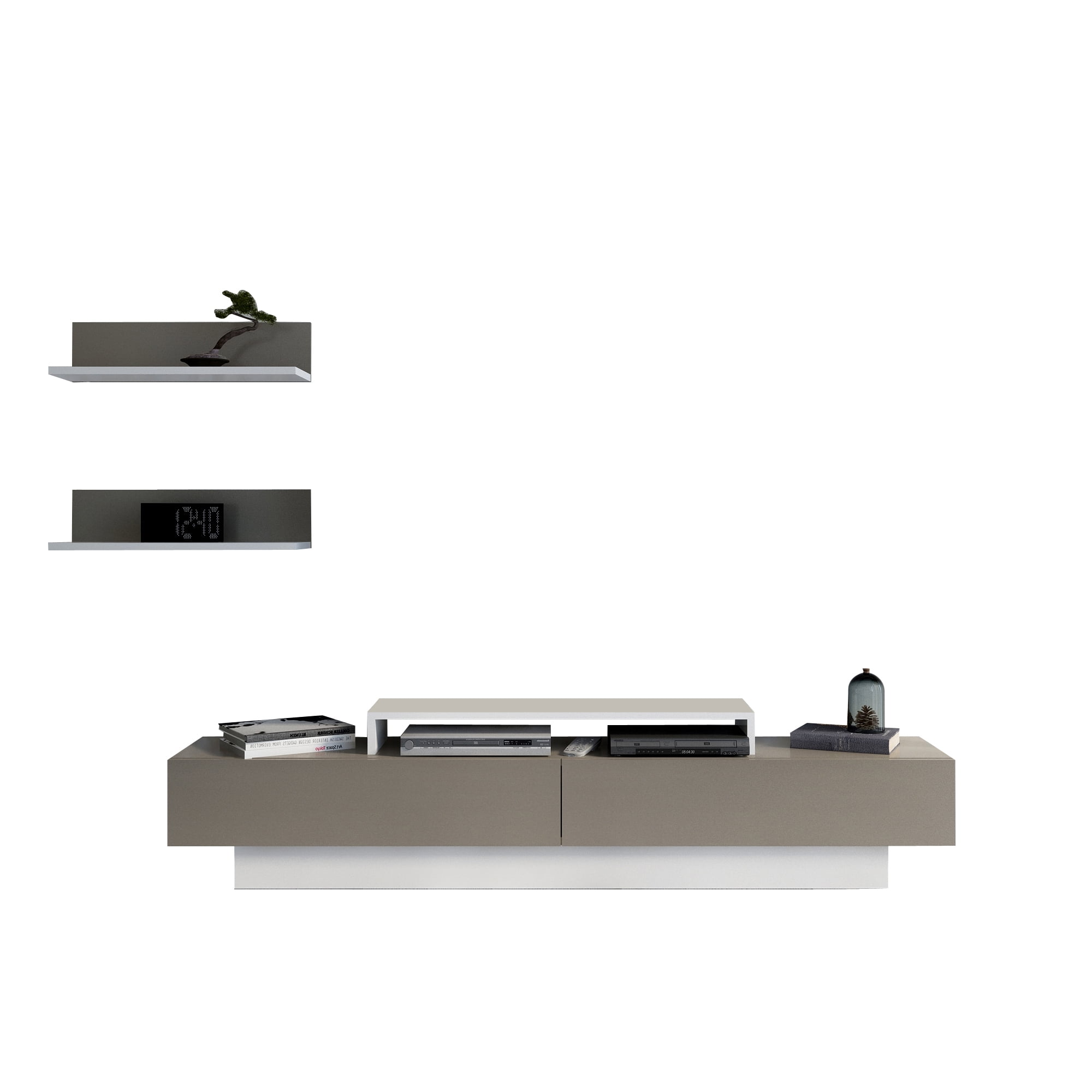 Decorotika Lusi 71″ wide TV stand and media console for TVs up to 80″ will shine in your room while storing your entertainment sets. Wall shelves enhance the contemporary visual in your living room. Note: Atop standalone shelf is not fixed to the unit. It may be a concern for those with children. Check the dimensions (width & depth) of your TV legs and make sure that the TV legs sit on a standalone shelf.