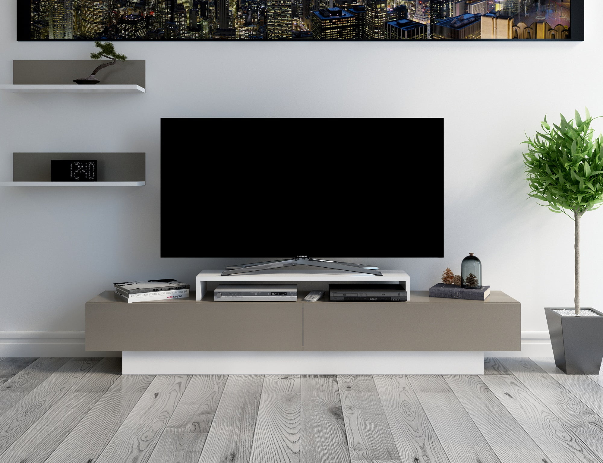 Lusi 71″ Modern Wide Rectangle TV Stand, Wood, Melamine Veneer, White & Coffee