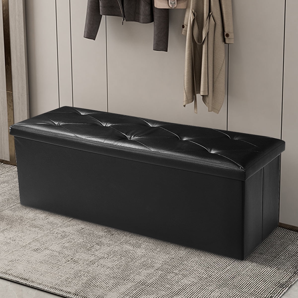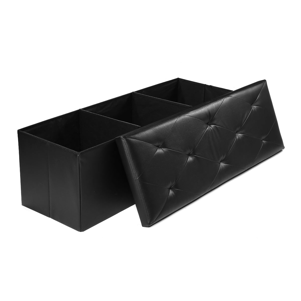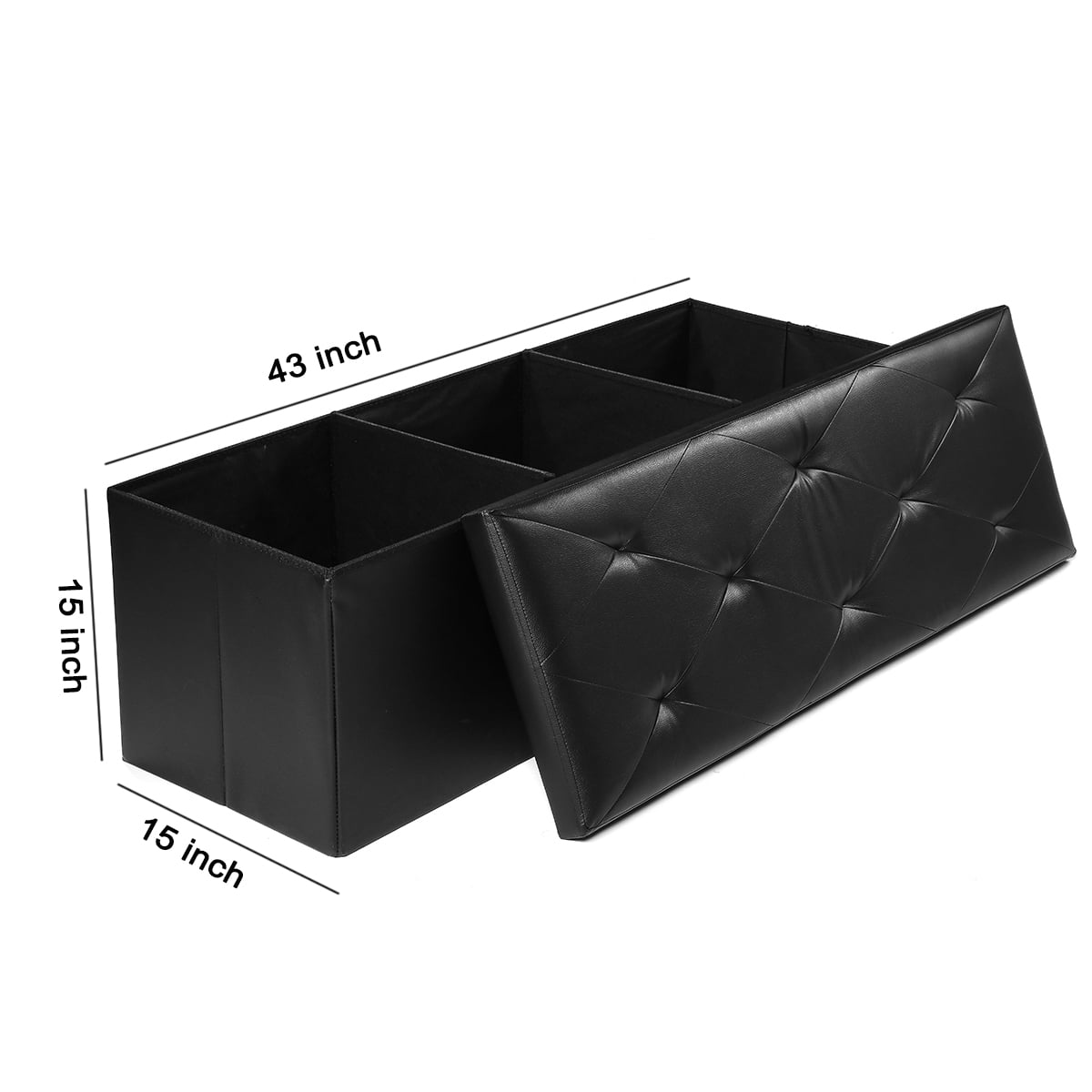 Features: Comfortable & Durable: Filled with high-density foam, the top of this ottoman bench ensures a soft and comfortable cushion experience. Supported by a thick MDF board, it boasts a robust static load capacity of up to 660 lbs. Ample Space with Divider: This black ottoman measures 15”D x 43″W x 15”H (38 x 110 x 38 cm), providing generous storage space of 35 gallons (132L). The removable divider facilitates categorized storage for items like bedding, clothes, toys, books, and snacks, ensuring stronger support for the top. Easy to Set Up & Fold Away: With its unique folding design, this storage bench can be set up in just a few seconds. When not in use, it can be easily folded up to save space in only one minute. Elegant Design: The footstool features a stylish waterproof faux leather with detailed stitching, enhancing its appearance and seamlessly complementing your existing decor. Versatile Design: The Lusimo storage ottoman is a versatile addition to your home. Cleverly designed, it can be used as a shoe bench in the entryway, a end of bed bench, additional seating or footstool in the living room, or a simple storage chest. Specifications Dimension: 43 * 15 * 15 inch (L * W *H) Color: Black Storage Capacity: 132L Load Capacity: 660 lbs Shipping weight: 17 lbs Material: Faux Leather, CARB P2 MDF, Sofa Sponge, Oxford Fabric Package Content: 1 x Folding Storage Bench