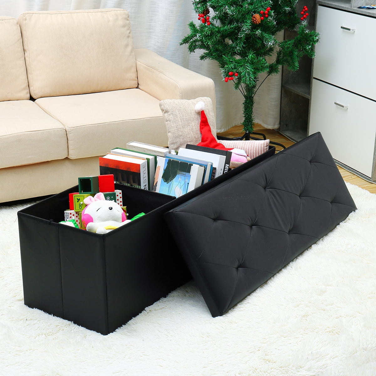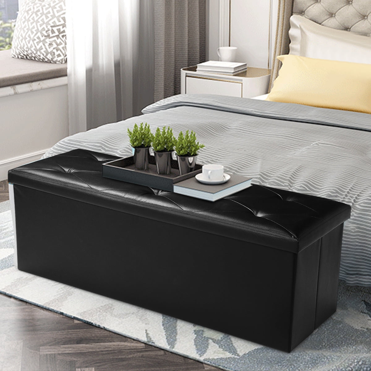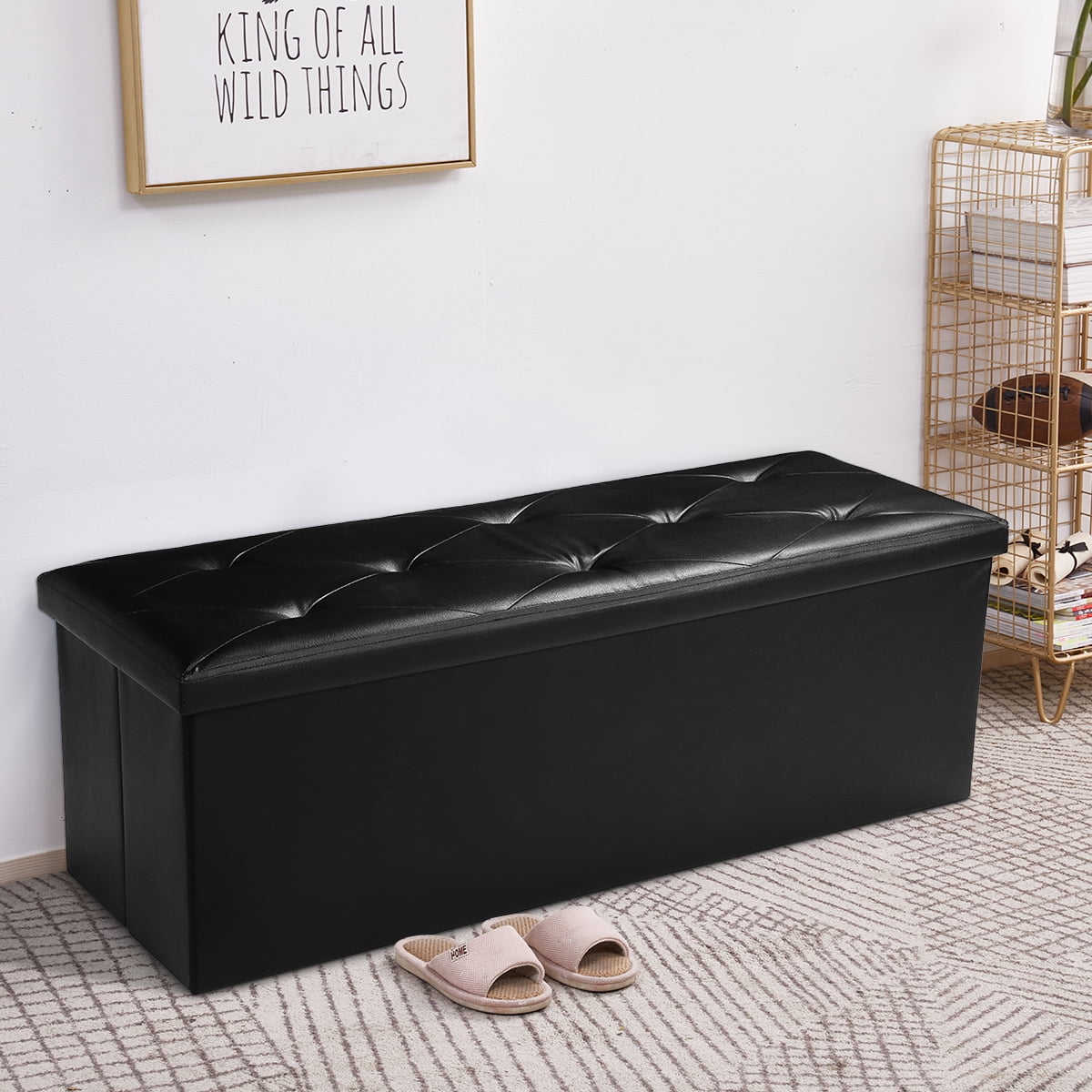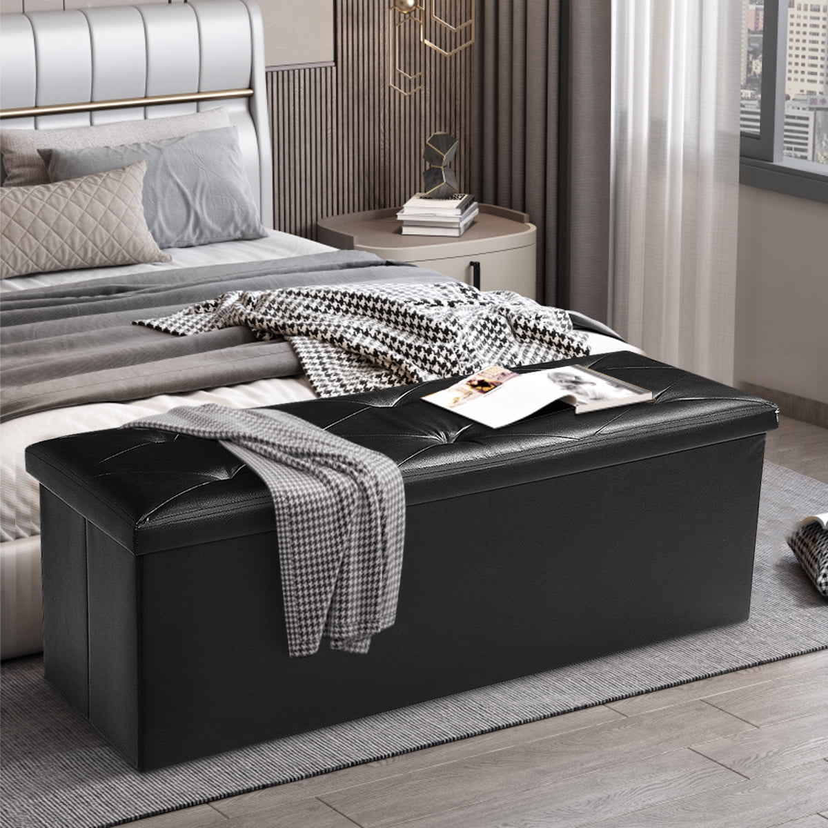 Features: Comfortable & Durable: Filled with high-density foam, the top of this ottoman bench ensures a soft and comfortable cushion experience. Supported by a thick MDF board, it boasts a robust static load capacity of up to 660 lbs. Ample Space with Divider: This black ottoman measures 15”D x 43″W x 15”H (38 x 110 x 38 cm), providing generous storage space of 35 gallons (132L). The removable divider facilitates categorized storage for items like bedding, clothes, toys, books, and snacks, ensuring stronger support for the top. Easy to Set Up & Fold Away: With its unique folding design, this storage bench can be set up in just a few seconds. When not in use, it can be easily folded up to save space in only one minute. Elegant Design: The footstool features a stylish waterproof faux leather with detailed stitching, enhancing its appearance and seamlessly complementing your existing decor. Versatile Design: The Lusimo storage ottoman is a versatile addition to your home. Cleverly designed, it can be used as a shoe bench in the entryway, a end of bed bench, additional seating or footstool in the living room, or a simple storage chest. Specifications Dimension: 43 * 15 * 15 inch (L * W *H) Color: Black Storage Capacity: 132L Load Capacity: 660 lbs Shipping weight: 17 lbs Material: Faux Leather, CARB P2 MDF, Sofa Sponge, Oxford Fabric Package Content: 1 x Folding Storage Bench