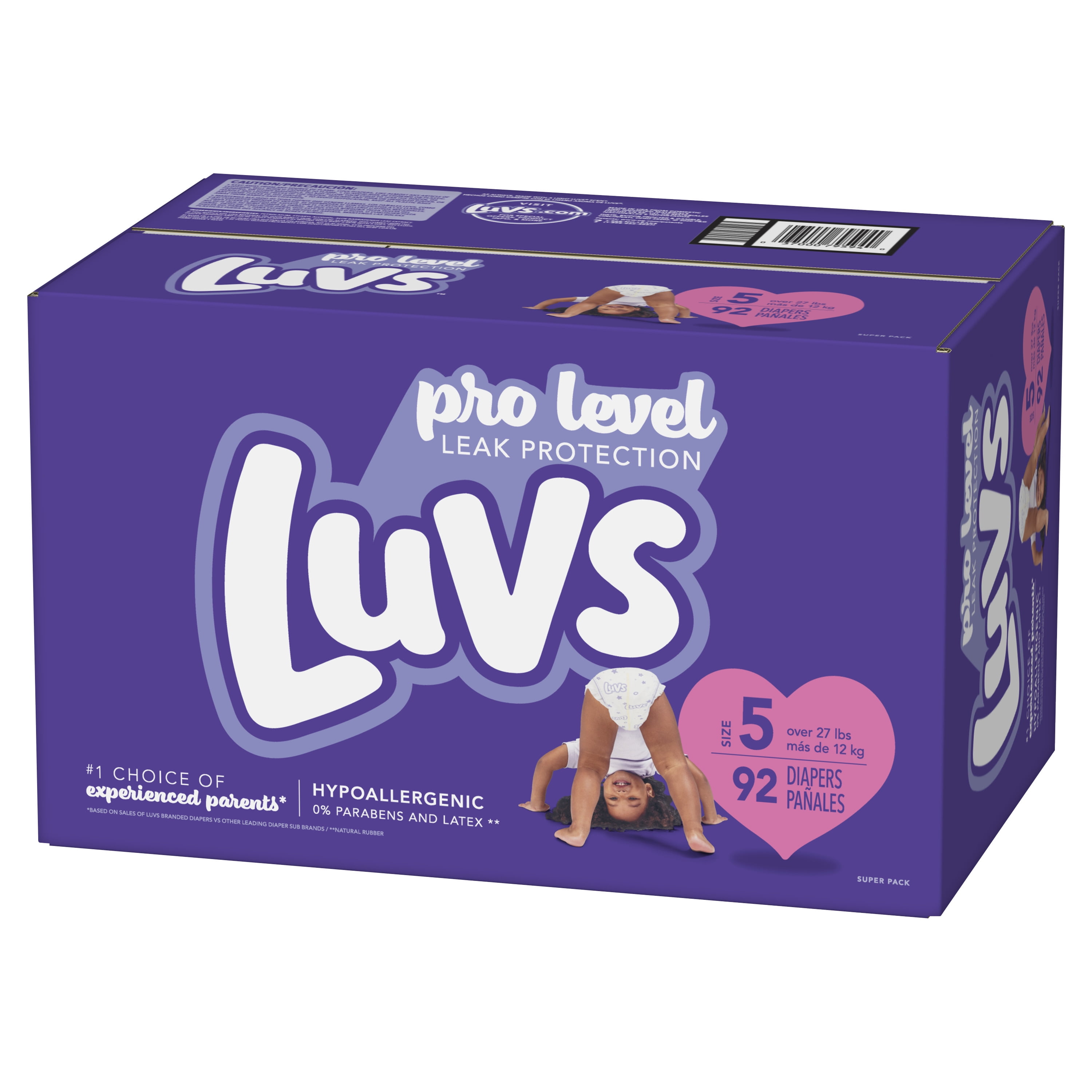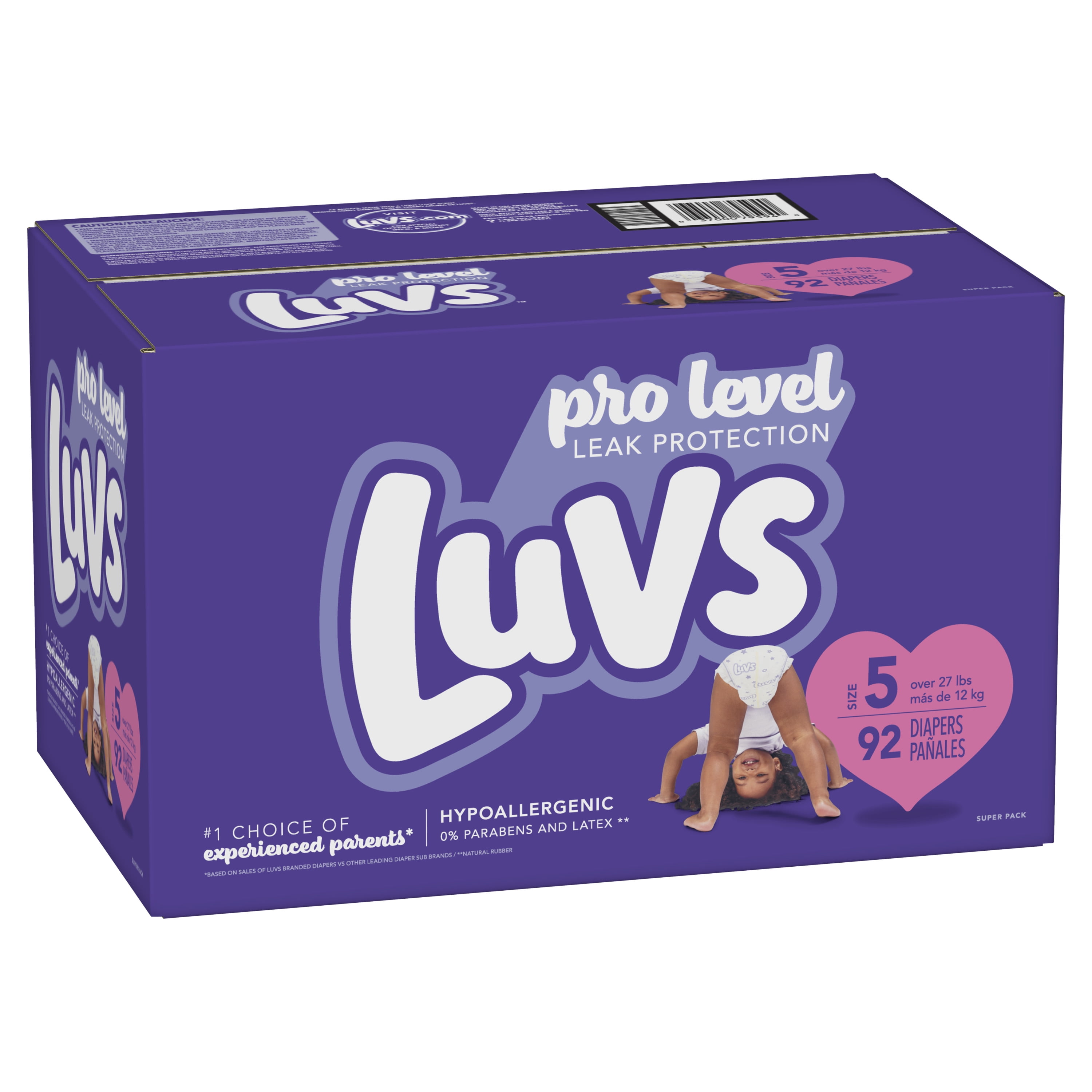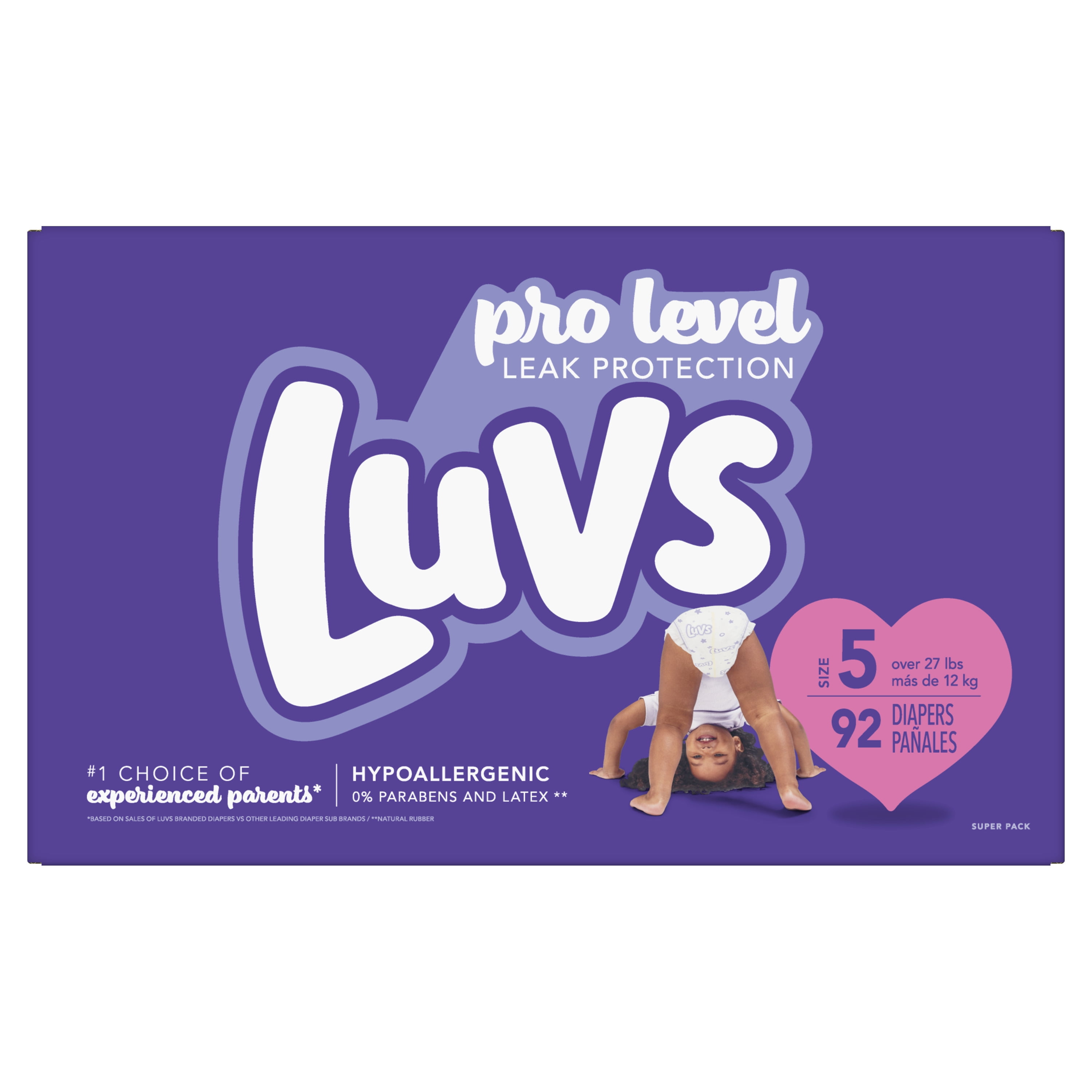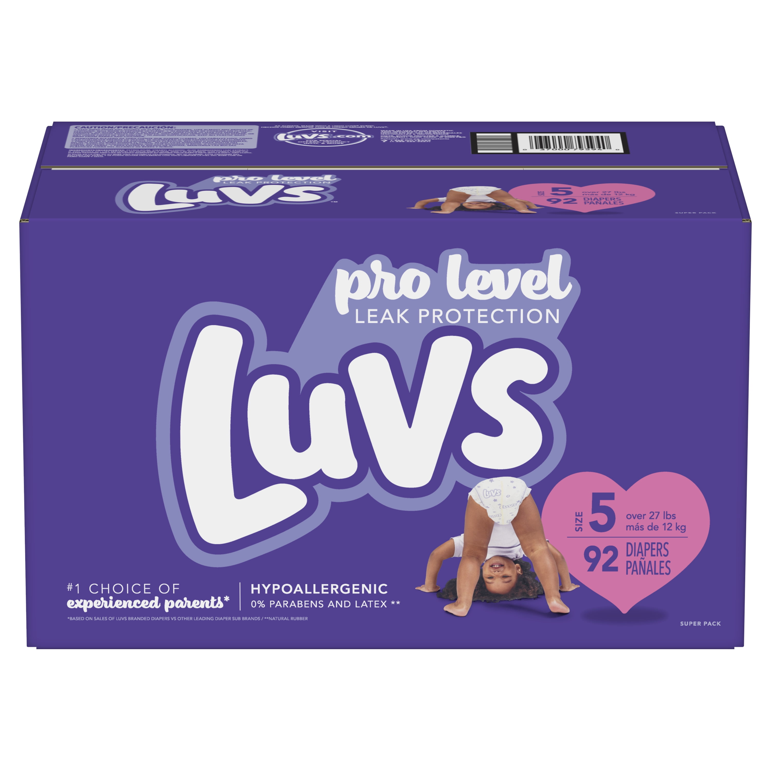 Diaper style: Ultra leak guard Baby weight range max: 35 lbs Baby weight range min: 27 lbs Refastenable stretch tabs help provide a secure and snug fit. Leak guard core helps keep the baby’s skin dry Night Lock helps lock away moisture for a dry, comfy night’s sleep Product Type: Diapers Diapers, size 5 (over 27 lb), super pack New! Absorbs 20x its weight (based on the weight of absorbent gel). 3 absorption areas. Nightlock protection. Wetness indicator. New! Luv’s triple leak guards with 3 absorption areas. 2 fun designs. Included inside package. Nightlock protection. Super soft on baby’s skin. Leak barrier leg gathers. Large refasten-able stretch tabs. Wetness indicator If you notice gel-like material on your baby’s skin, don’t be alarmed. This comes from the diaper padding and can be easily removed by wiping your baby’s skin with a soft, dry cloth Contains 2 package liners of 46 diapers each Package liners are not interested in individual retail sale stores with unopened liners in outer boxes