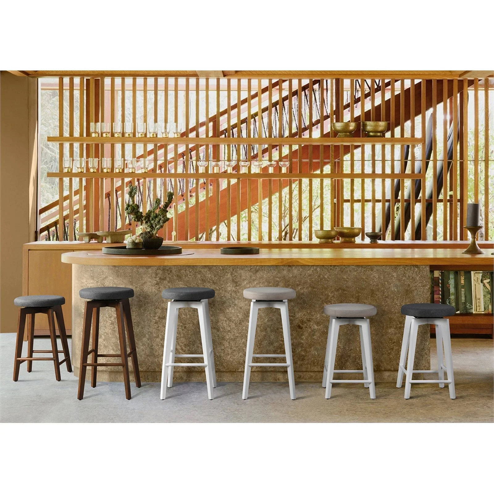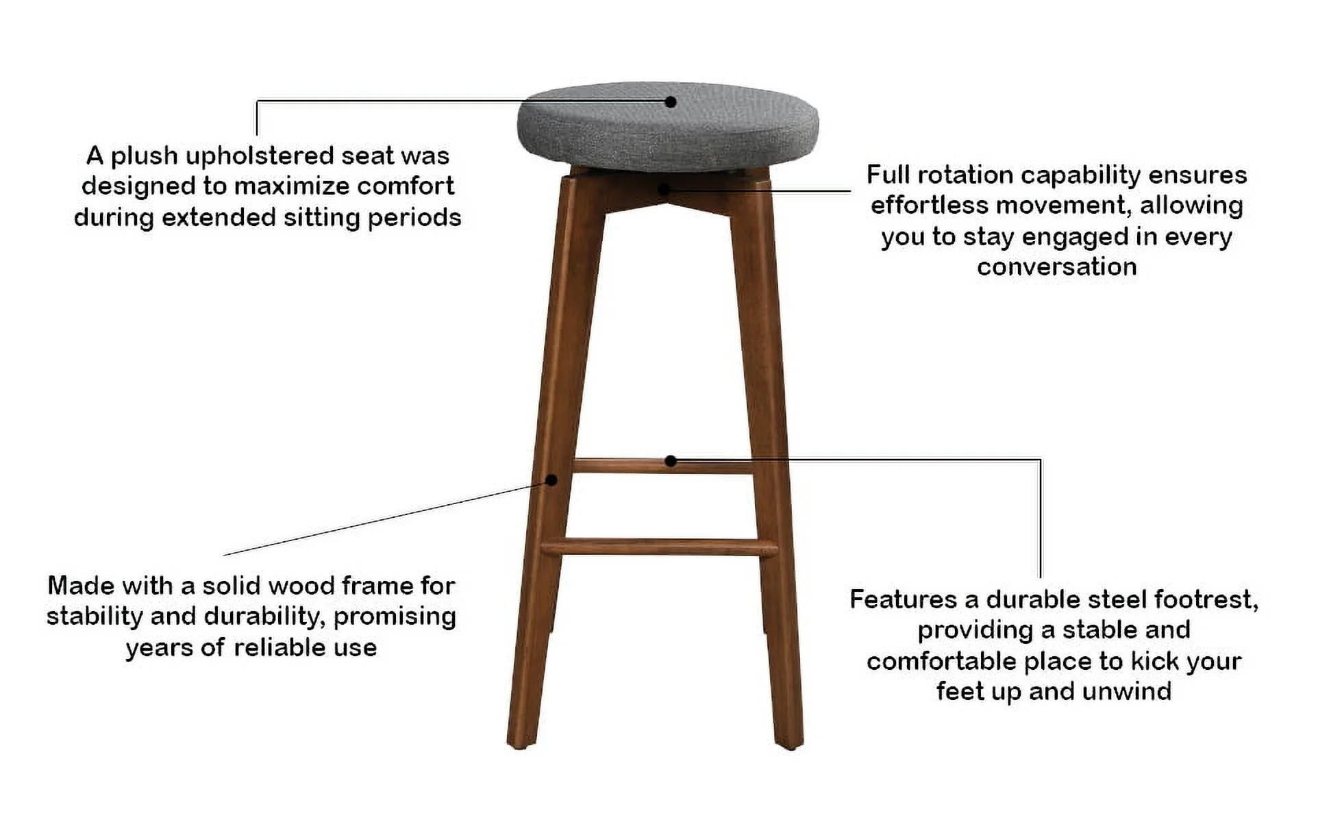 Crafted in a straightforward and neutral style, this backless bar stool is designed to seamlessly complement any kitchen or dining décor 360-Degree Swivel – full rotation capability, this bar stool ensures effortless movement, allowing you to stay engaged in every conversation or easily reach for items around you Made with solid wood frame for enduring stability and a plush upholstered seat for a touch of luxury in every seating experience Made with solid wood frame for enduring stability and a plush upholstered seat for a touch of luxury in every seating experience Achieve both style and stability with our bar stool, with a weight capacity of 250 lbs. Given the inherent qualities of natural wood, every piece is distinctive, resulting in variations in both color and texture for each product Effortlessly maximize your space with our backless design, allowing convenient storage under counters or bars while maintaining a chic and practical seating option Four-legs base frame made with durable black powder coated steel Plush padded seat provides luxurious comfort during extended use Color may vary from actual product due to lighting when taking the picture and from the color on your screen due to monitor color resolution Care Instruction: To protect finish, do not apply abrasives or household cleaners, dust with soft dry cloth. Blot spills immediately and wipe with a clean damp cloth. Do not expose to direct sunlight or excessive temps. Hardware may loosen over time; periodically check that all connections are tight. Hardware may loosen over time, periodically check to make sure all connections are tight and re-tighten if necessary.