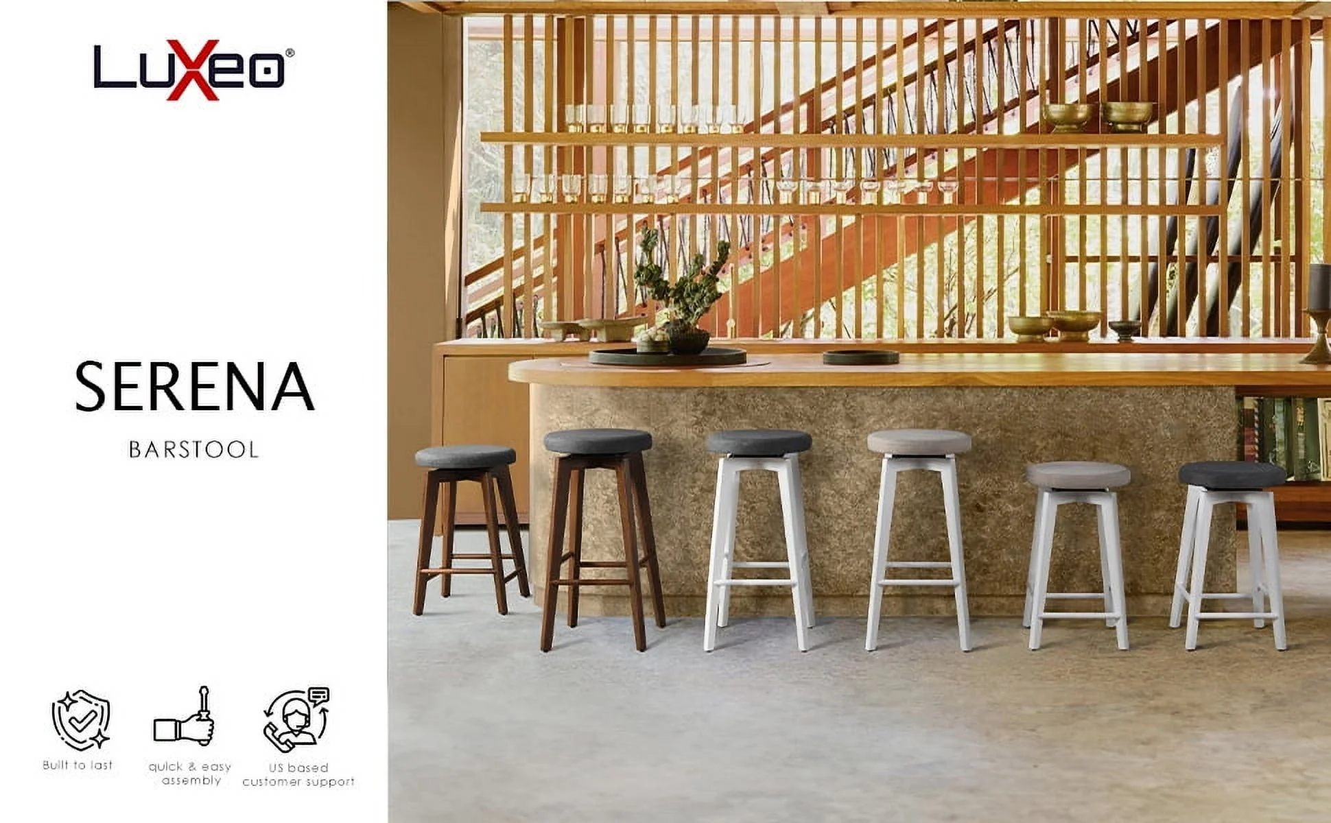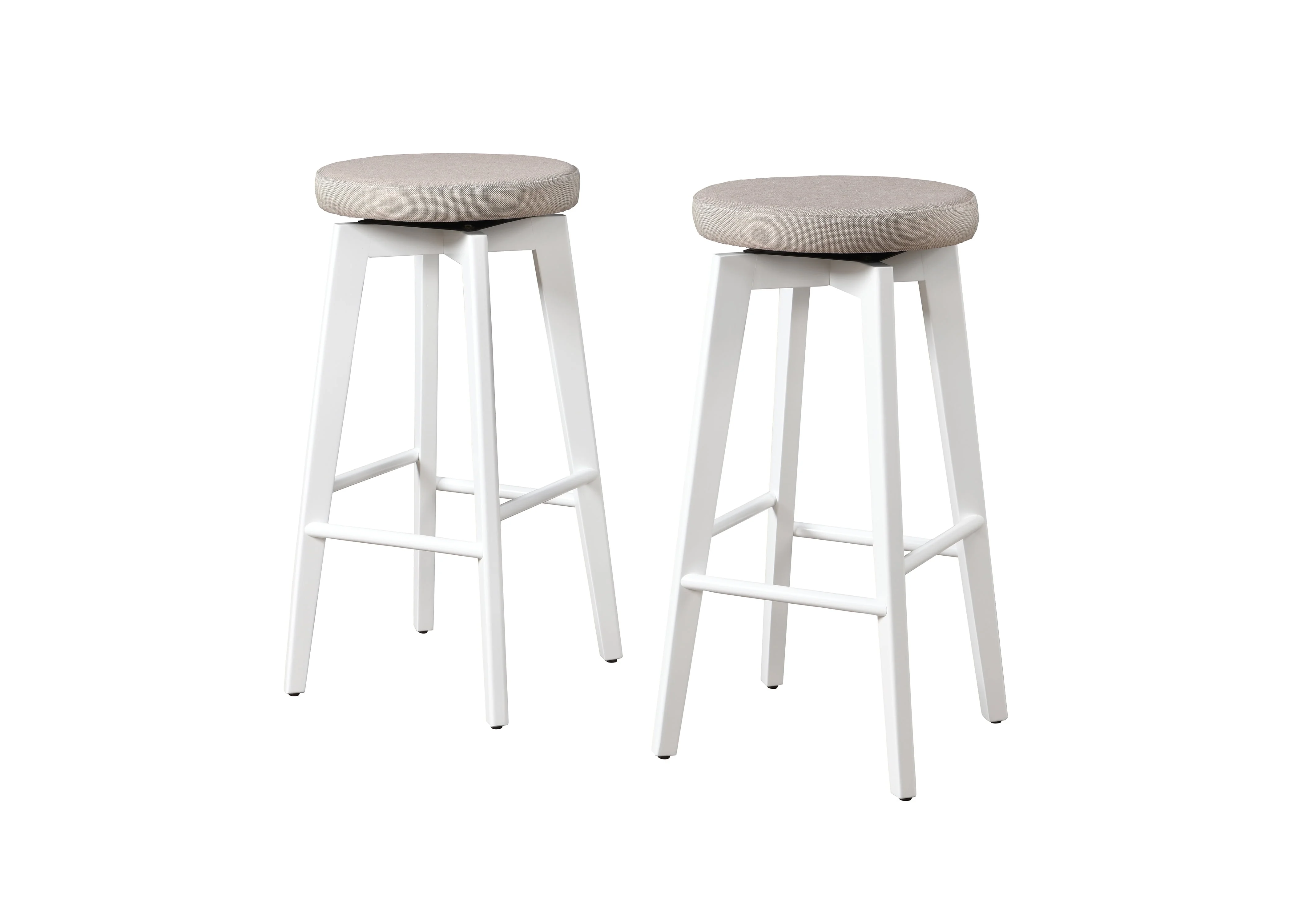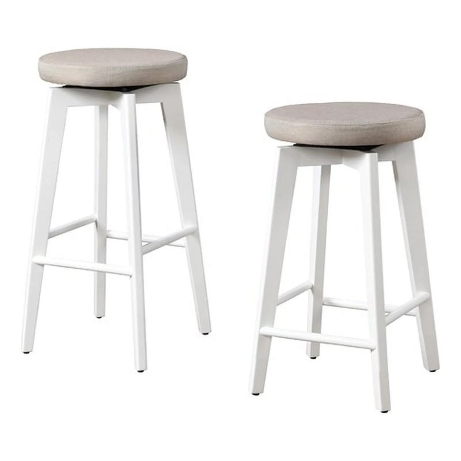 Revitalize your space and elevate your day with the Serena Solid Wood BarStools—an ideal addition for your bar or counter table. These stools offer a thoughtful wooden footrest and a plush padded seat, ensuring enduring comfort in a timeless design. The standout feature is the 360-degree swivel seat, promoting engaged conversations, and the stools are designed with simplicity and ease of assembly in mind, effortlessly blending into any room decor. With a neutral design featuring a Beige-colored fabric and a warm white wood base, the Serena stools complement a wide range of interior styles, providing a lasting choice to enhance both functionality and aesthetic appeal in your space. Features: Crafted in a straightforward and neutral style, this backless bar stool is designed to seamlessly complement any kitchen or dining décor 360-Degree Swivel – full rotation capability, this barstool ensures effortless movement, allowing you to stay engaged in every conversation or easily reach for items around you Made with solid wood frame for enduring stability and a plush upholstered seat for a touch of luxury in every seating experience Achieve both style and stability with our barstool, with a weight capacity of 250 pounds Given the inherent qualities of natural wood, every piece is distinctive, resulting in variations in both color and texture for each product Effortlessly maximize your space with our backless design, allowing convenient storage under counters or bars while maintaining a chic and practical seating option Four-legs base frame made with wooden frame Plush padded seat provides luxurious comfort during extended use Color may vary from actual product due to lighting when taking the picture and from the color on your screen due to monitor color resolution To protect finish, do not apply abrasives or household cleaners, dust with soft dry cloth. Blot spills immediately and wipe with a clean damp cloth. Do not expose to direct sunlight or excessive temps. Hardware may loosen over time, periodically check to make sure all connections are tight and retighten if necessary. Specifications: Product Color: White/Beige Maximum Seating Capacity: 2 Weight Capacity: 250 lbs