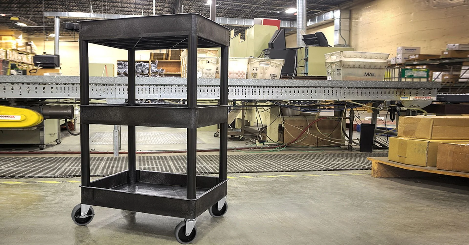 Utility Cart with Deep Lipped Plastic Shelves, Number of Shelves 3, Lip Style 4-Sided Lipped, Load Capacity 300 lb, Shelf Length 24 in, Shelf Width 18 in, Top Shelf Height 38 1/2 in, Distance Between Shelves 12 in, Distance Between Top and Middle Shelf 12 in, Distance Between Middle and Bottom Shelf 12 in, Handle Type Flat, Handle Height 38 in, Caster Brake Type Side Pedal Brake, Caster Wheel/Tread Material Thermoplastic Rubber, Caster Wheel Dia. 4 in