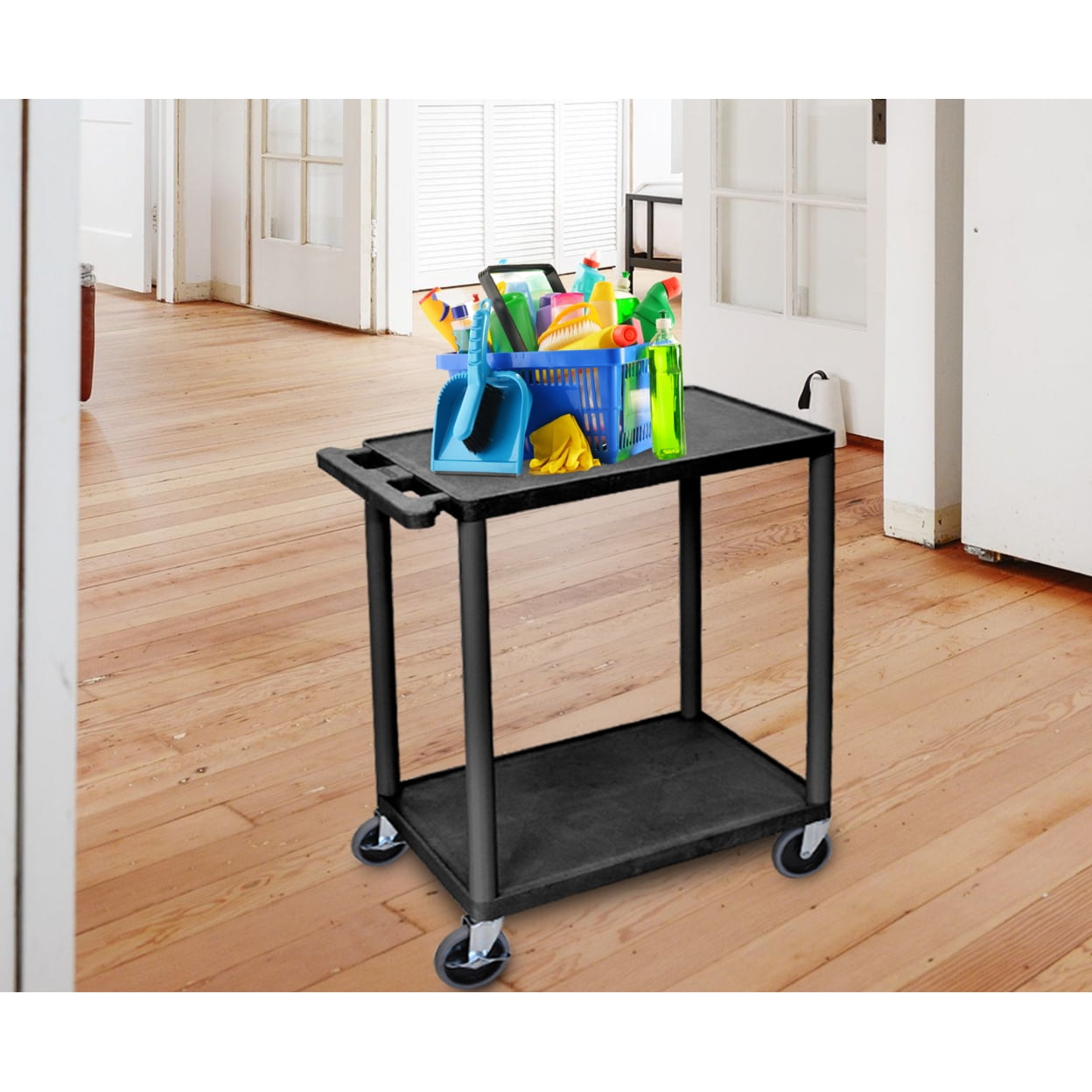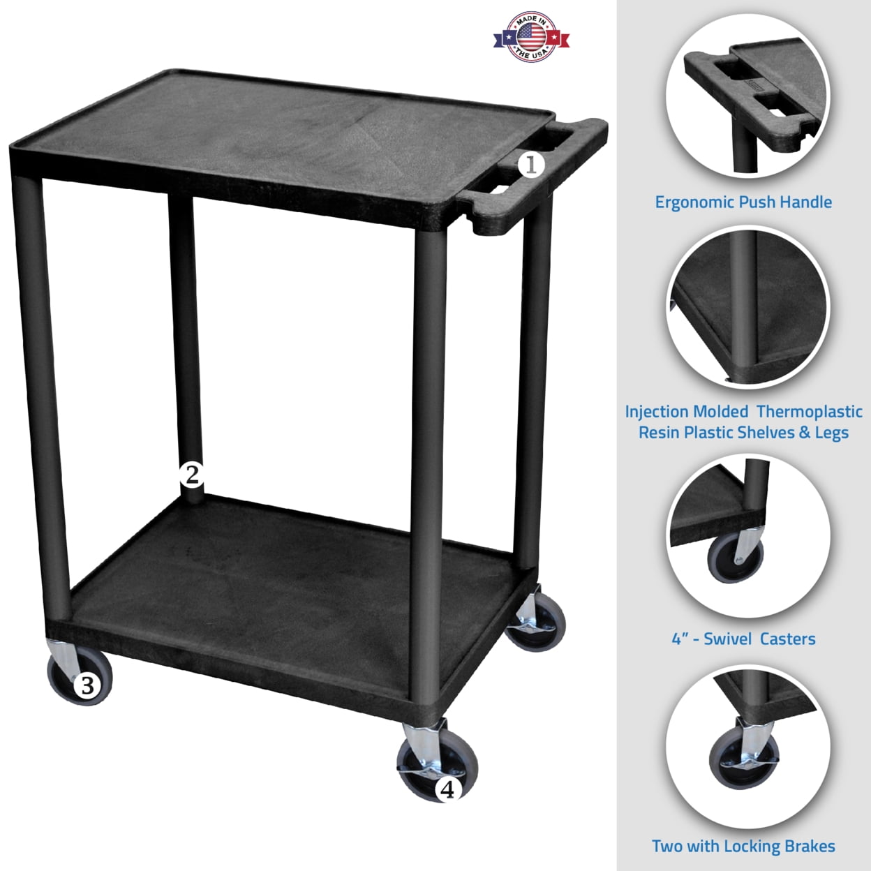 With two shelves spaced 26″ apart and a max weight capacity of 300 lbs., this rugged utility cart can store and transport larger, heavier items. The durable thermoplastic resin won’t stain, scratch, dent or rust, and the heavy-duty 4″ casters are built to handle hefty loads. Both flat shelves have a .25″ lip to keep cargo from sliding off during transit and a push handle, which doubles as a cord wrap, provides superior control. For utility and strength, look to Luxor. Features And Specifications • Overall Dimensions: 24″ W x 18″ D x 33.25″ H • Clearance between shelves: 26″ • Multipurpose utility cart • Shelves and legs are constructed of an injection-molded thermoplastic resin that will not stain, scratch, dent or rust • Includes two flat shelves with .25″ retaining lip to keep items from sliding off • Ergonomic push handle molded into top shelf; doubles as cord wrap • Rolling cart with four heavy-duty 4″ casters, two with locking brake • Maximum weight capacity: 300 lbs. (evenly distributed) • Made in the USA