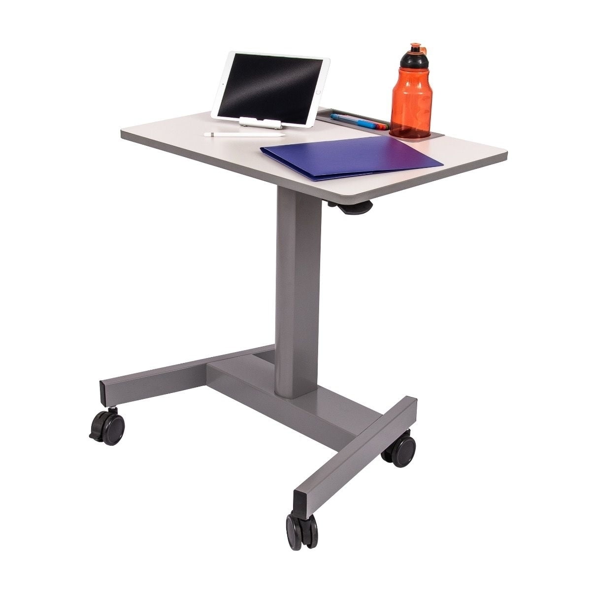 Height adjustable between 29″ and 43.5″ Proven to increase student focus and ability to stay on task Desktop conveniently holds pencils and water bottle; includes hook to hang book bags Four casters and two locking brakes provide classroom flexibility and collaboration Steel construction can withstand excessive use