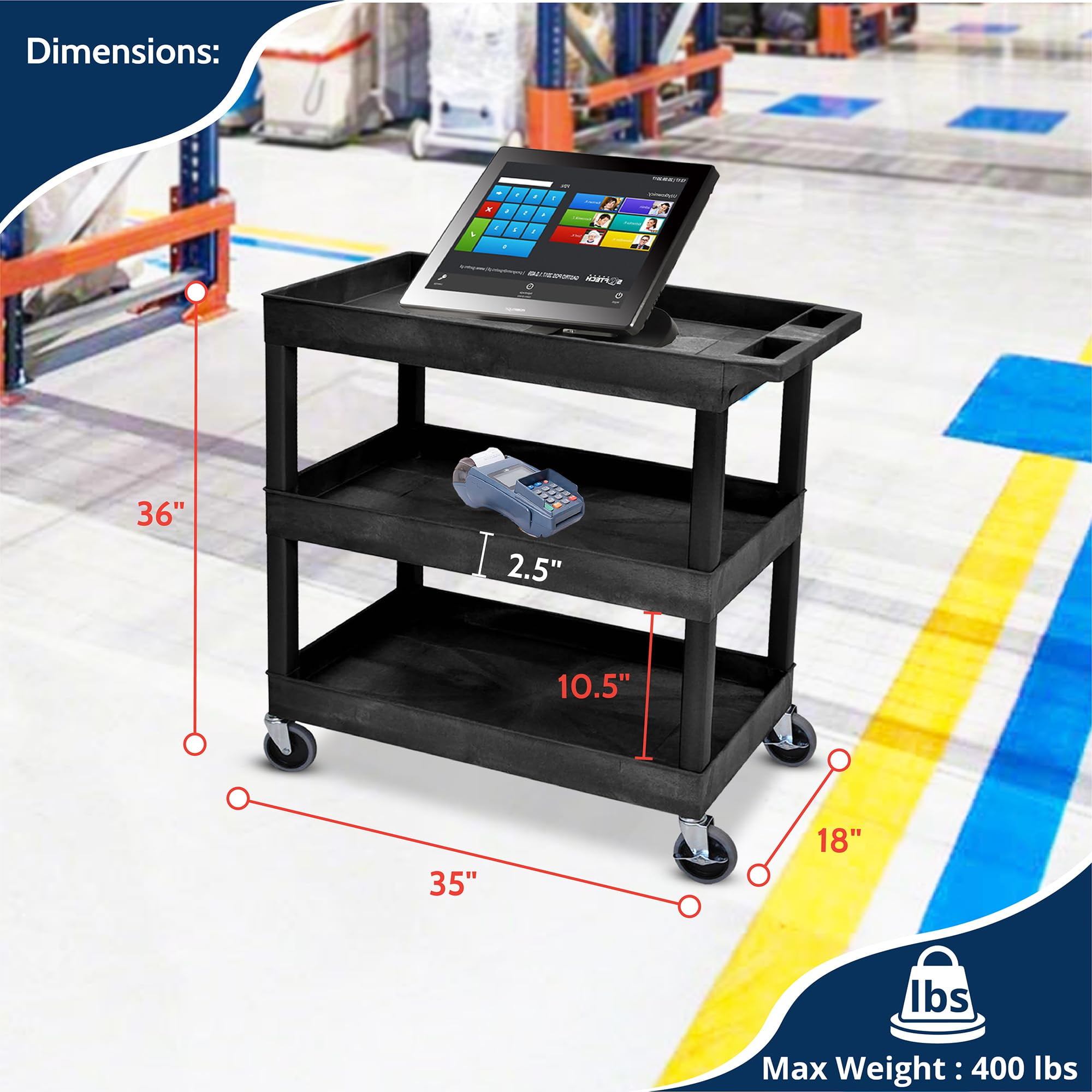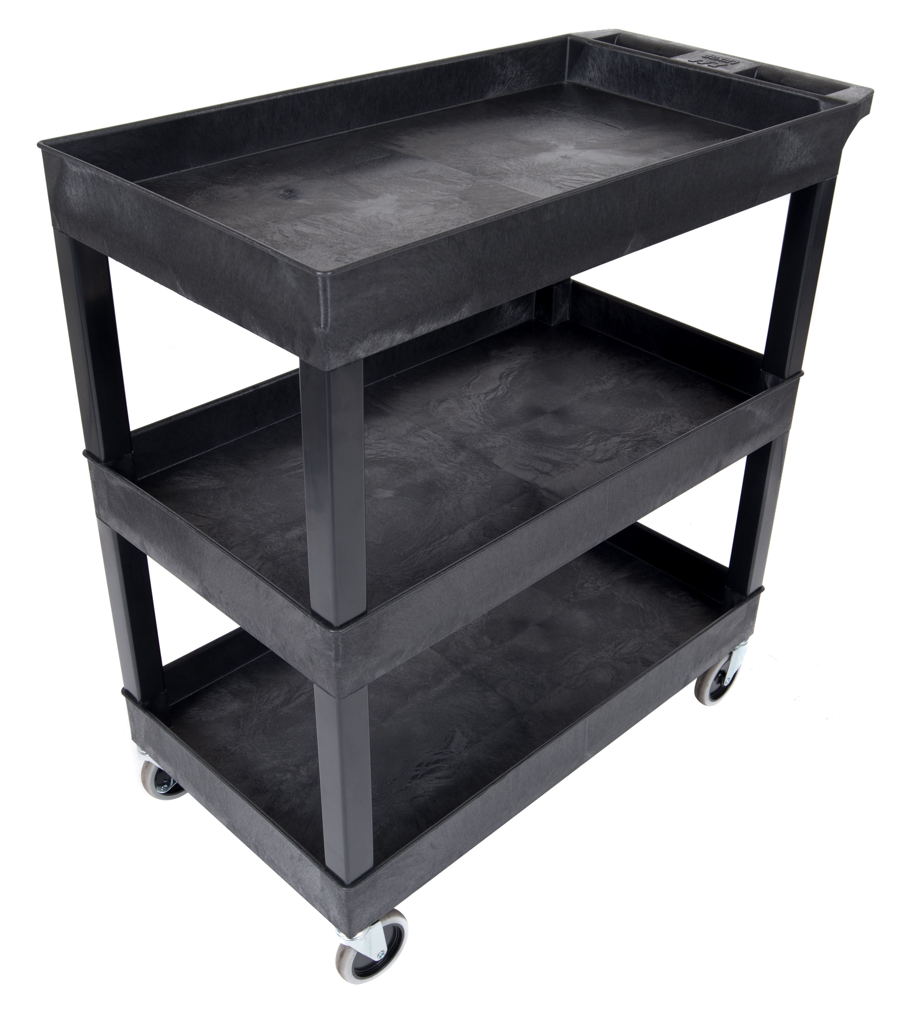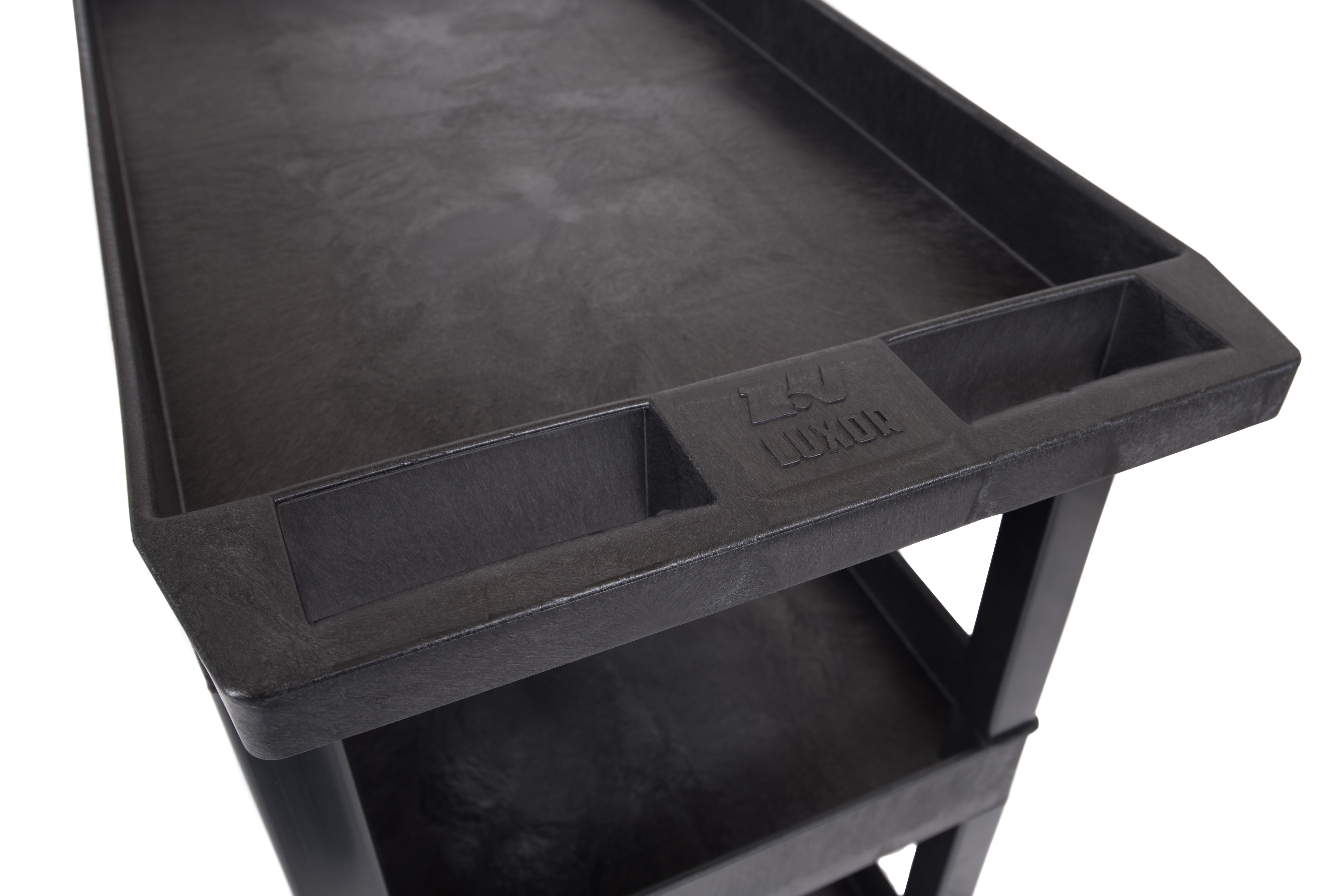Luxor Rolling 3-Shelf Utility Cart, HDPE Black This multipurpose utility cart features an impressive weight capacity of 100 lbs per shelf, evenly distributed Constructed with durable impact-resistant HDPE and PVC for long-lasting use 4″ full swivel casters offer excellent maneuverability; 2 casters include locking brakes to secure the cart in place 25″ deep tub shelves are perfect for securing large and bulky objects during transport Proudly