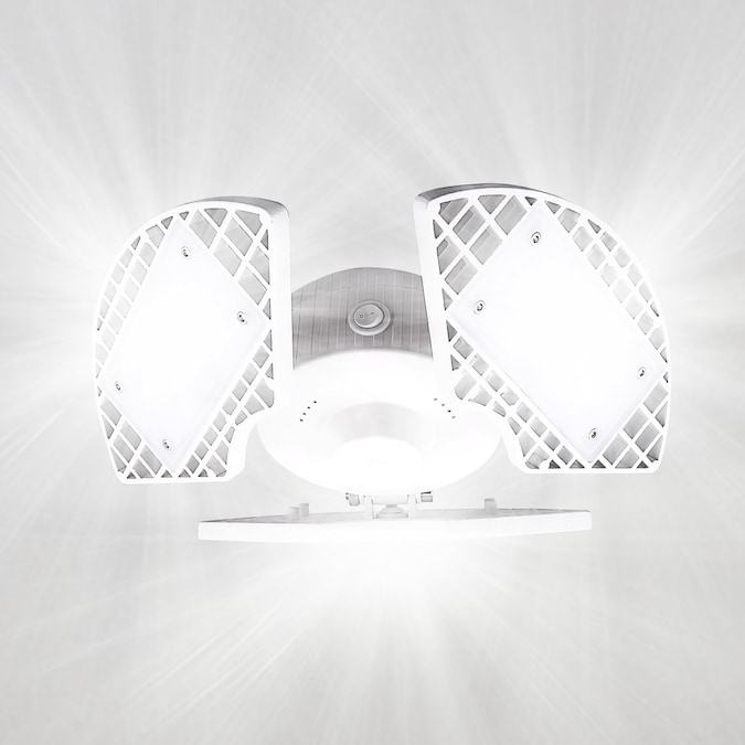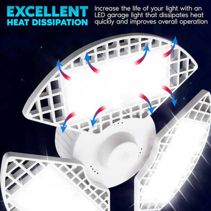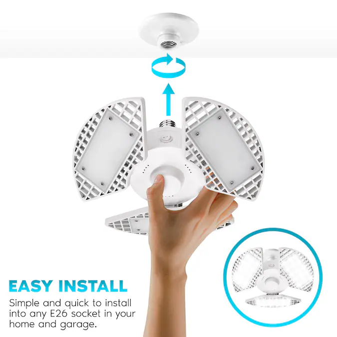 Luxrite 3-Leaf LED Garage Light – Brighten the look of your space with a garage light that offers ultra bright lighting in an adjustable design. Each overhead garage light uses LED technology to produce 8000 lumens of powerful lighting in a 360 degree area in order to allow you to see more and eliminate dark areas. With the deformable design, you can choose which direction you prefer your lighting for a truly customizable experience. These are easy to install into E26/27 standard home sockets, which means they require no tools and setup takes seconds. With it’s convenient on/off switch on the side, you can even install it in areas that have no connection to a wall switch. Not only do they provide high quality light but they use less energy compared to standard garage and shop lighting. Each fixture is built with a stury body and aluminum leaf panels to allow for heat dissipation during extended periods of use and improves overall operation. Get the most out of your home lighting and switch to an energy efficient garage light that produces more light, has 90° adjustable panels, is damp rated for reliability, has zero delay, zero flickering, and offers zero worries.