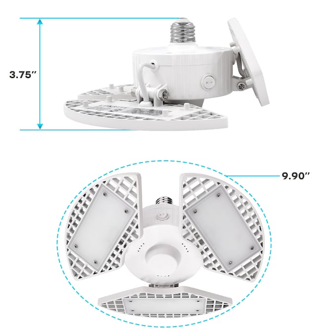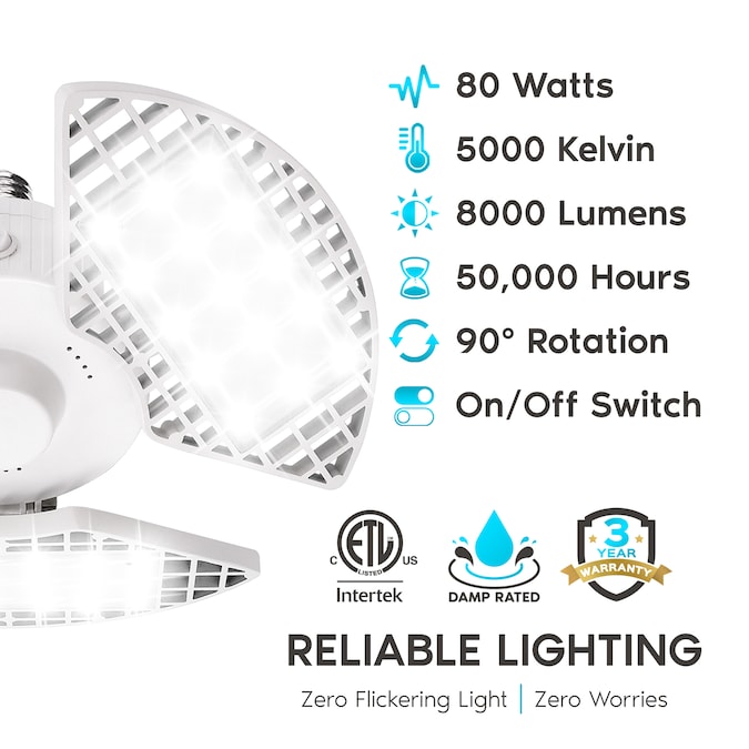 • RELIABLE LIGHTING – Every LED deformable garage light fixture is quick to install, damp rated for reliability, ETL listed for your safety, has 90° adjustable aluminum panels for customization, an easy to use on off switch, and backed by a 3 YEAR WARRANTY