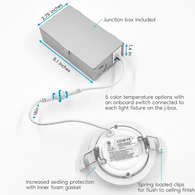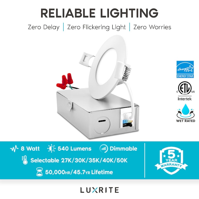 Luxrite Ultra Thin Recessed Lighting with 5 Color Temperature Switch – The perfect solution to those that want the ability to pick the correct light for your home or business. With these Luxrite LED recessed ceiling lights, you are offered 5 color temperature options to choose from with an easy to use switch attached to each down light. Choose from 27K warm white, 3000K soft white, 3500K natural white, 4000K cool white, or 5000K bright white with just a simple adjustment. Built with a lightweight and thin design, each LED wafer light is easy to handle and install into your shallow ceilings. No can is needed since each ultra thin recessed light comes with it’s own jbox for easy wiring and spring loaded clips for a flush to ceiling finish. You’ll be able to use these downlights indoors and outdoors since each fixture is wet location rated to handle rain and damp areas, so feel free to install in soffits, eaves, or even showers. Control the light output with it’s smooth dimming capabilities which can go from 100% to 10% light, giving you a comfortable space every time.