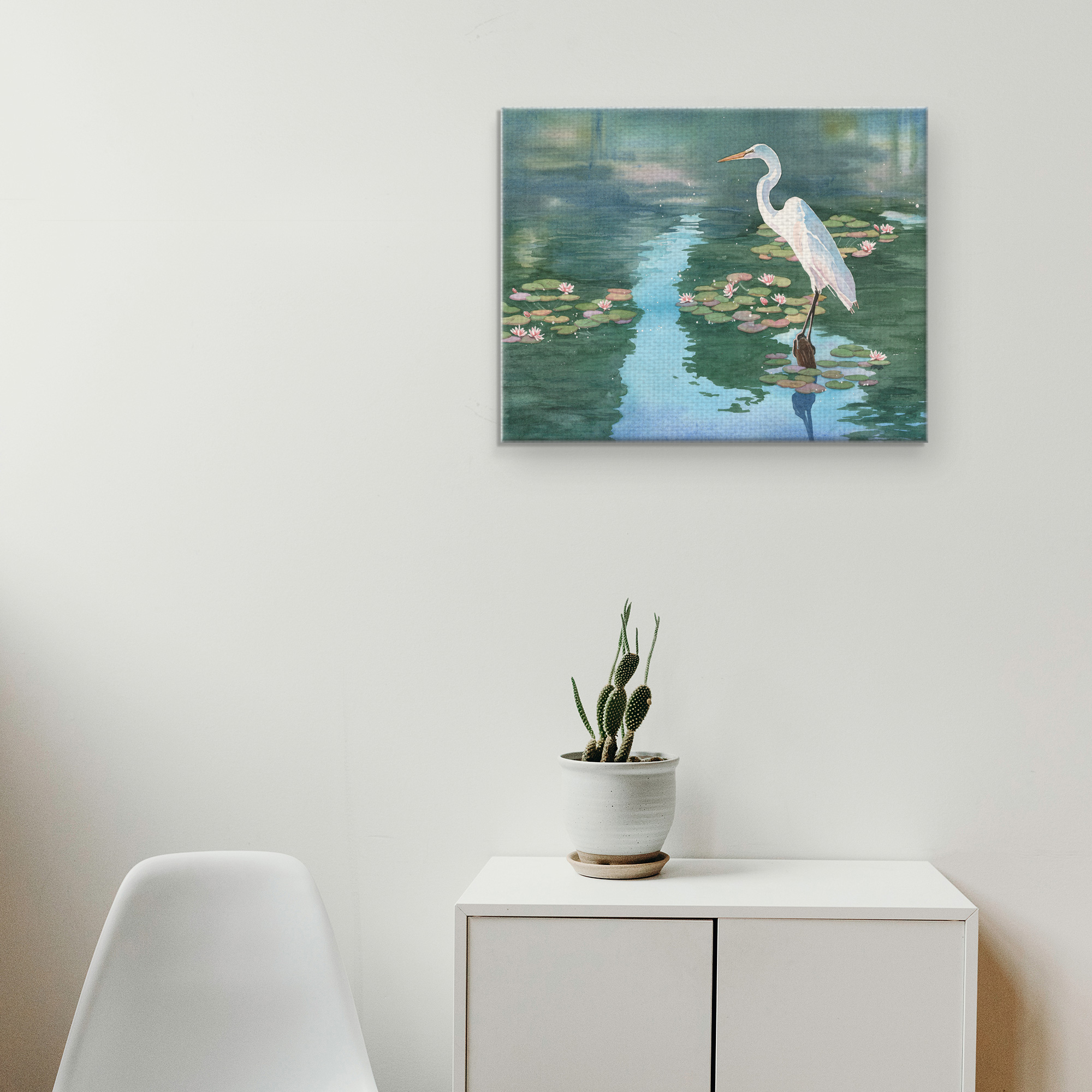 In this captivating piece, a majestic heron sits perched on a branch above a pond glistening with light and lily pads. The light delicately ripples with the waves across the water’s surface while tiny orbs of light dance above the flowers. Whether you choose to showcase this gorgeous piece in your living room, bedroom, bathroom, or as a focal point at the end of a long hallway, it’s guaranteed to pull focus and captivate attention. Printed on high quality canvas material that offers exceptional detail and accurate color display, this stunning print is also super lightweight and is easy to hang. No need to deal with heavy and unwieldy frames as this piece only requires a few nails and a steady hand for mounting.