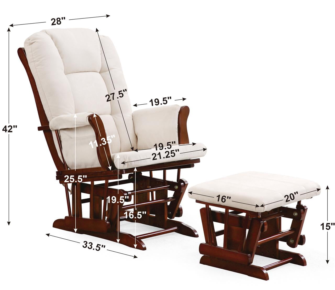 Ball bearing gliding system on both chair and ottoman for smooth motions Generous seating room, padded polyester blend filled arm pads and pockets to store your essentials or favorite books within reach Easy to assemble, weight capacity 250 lbs