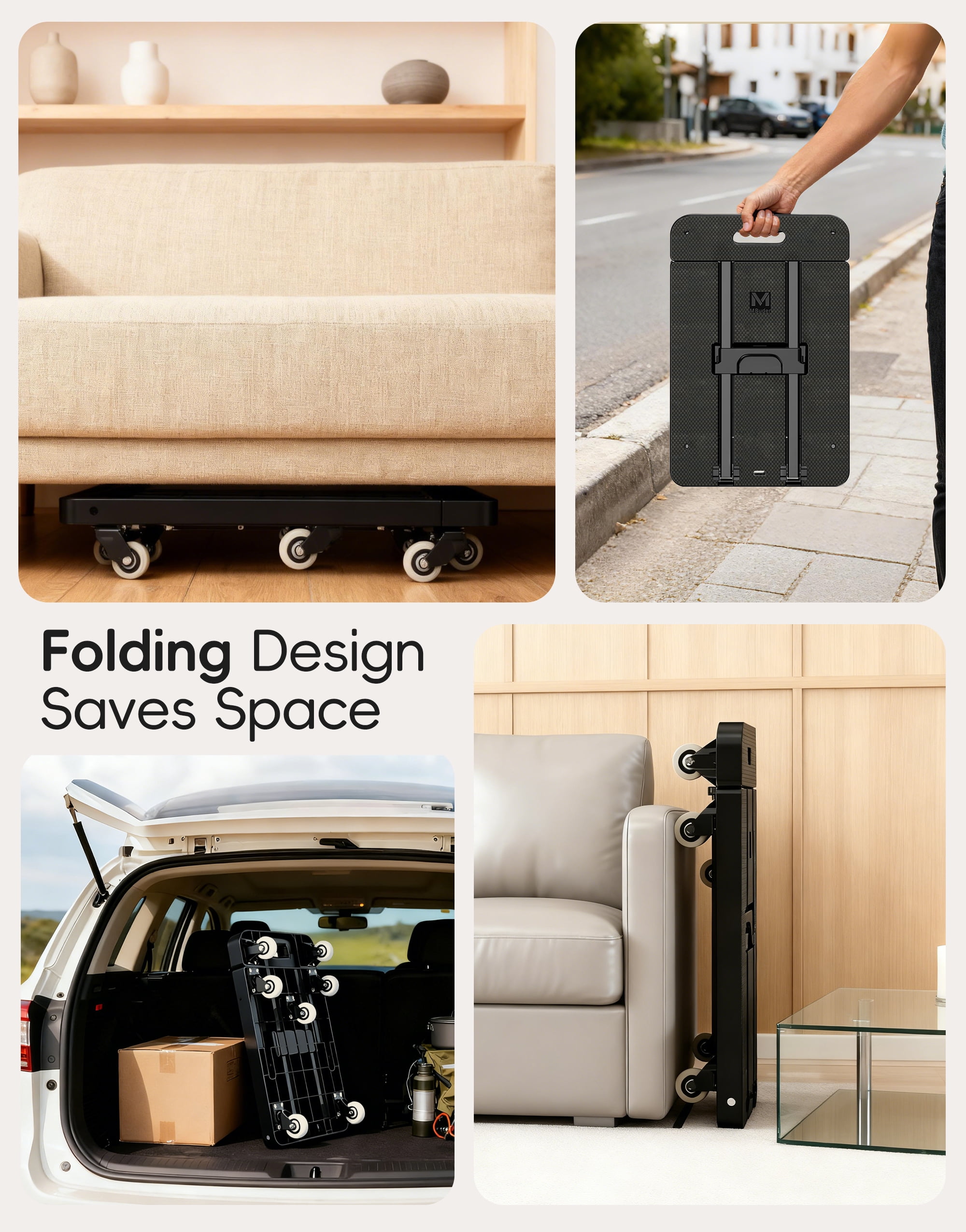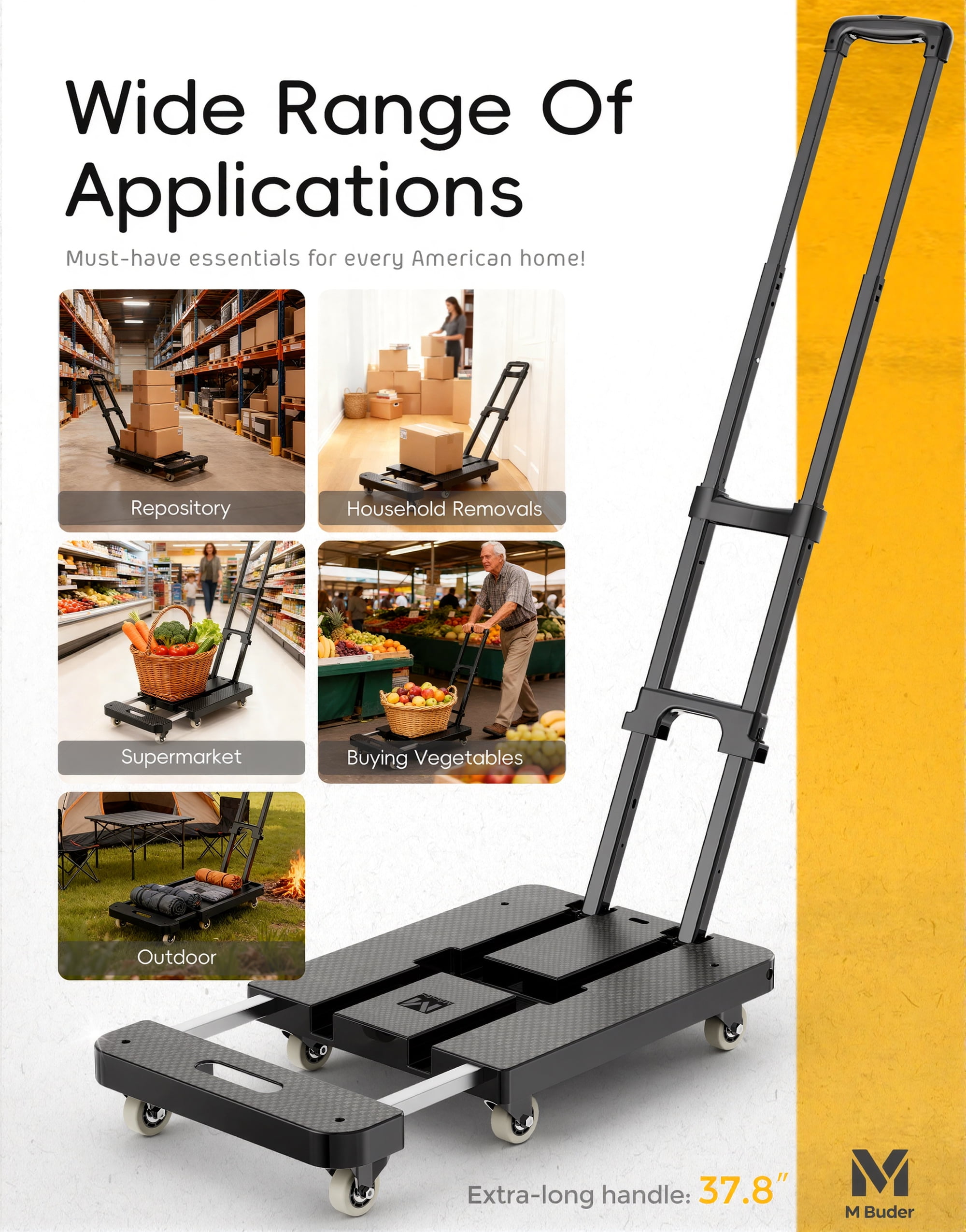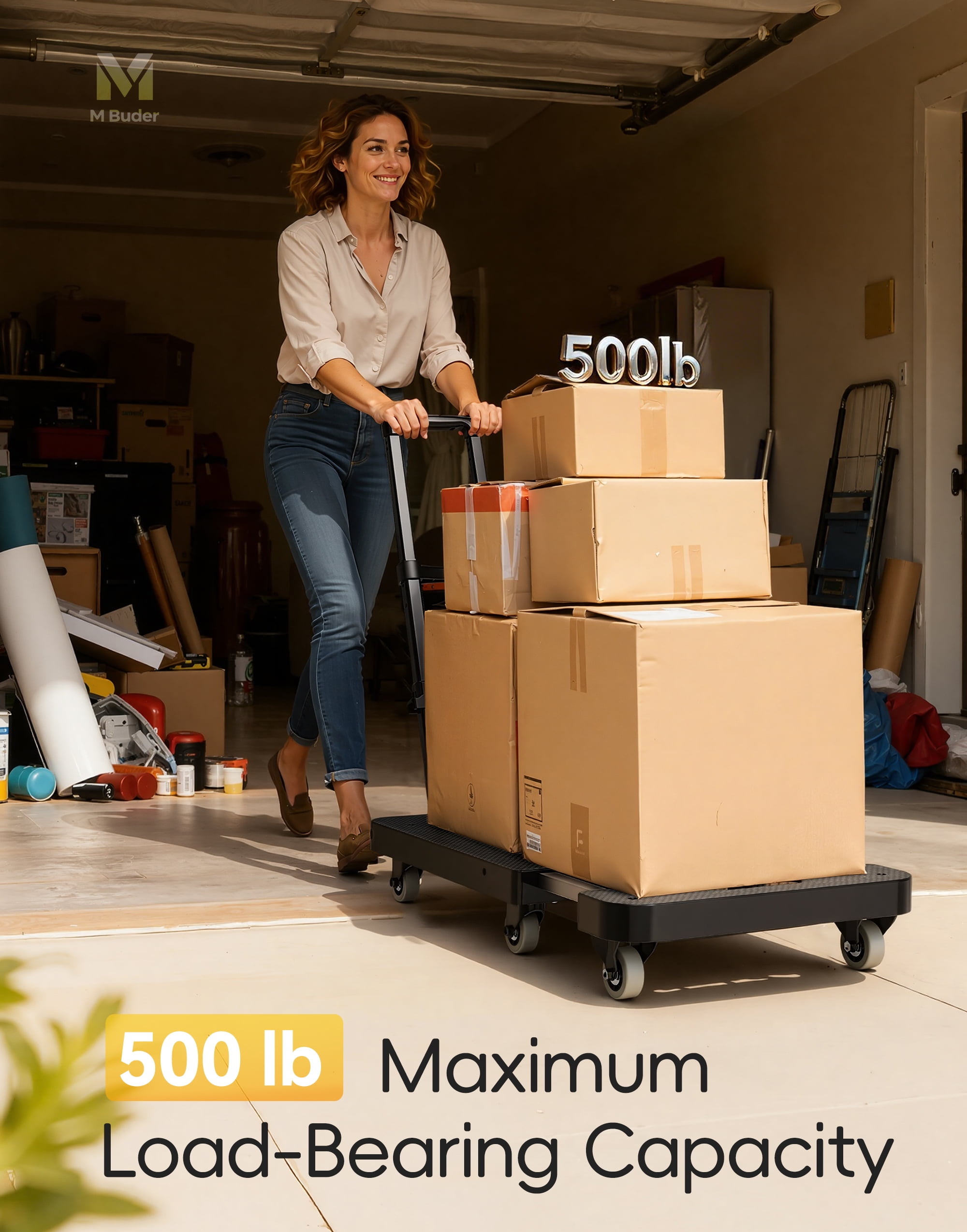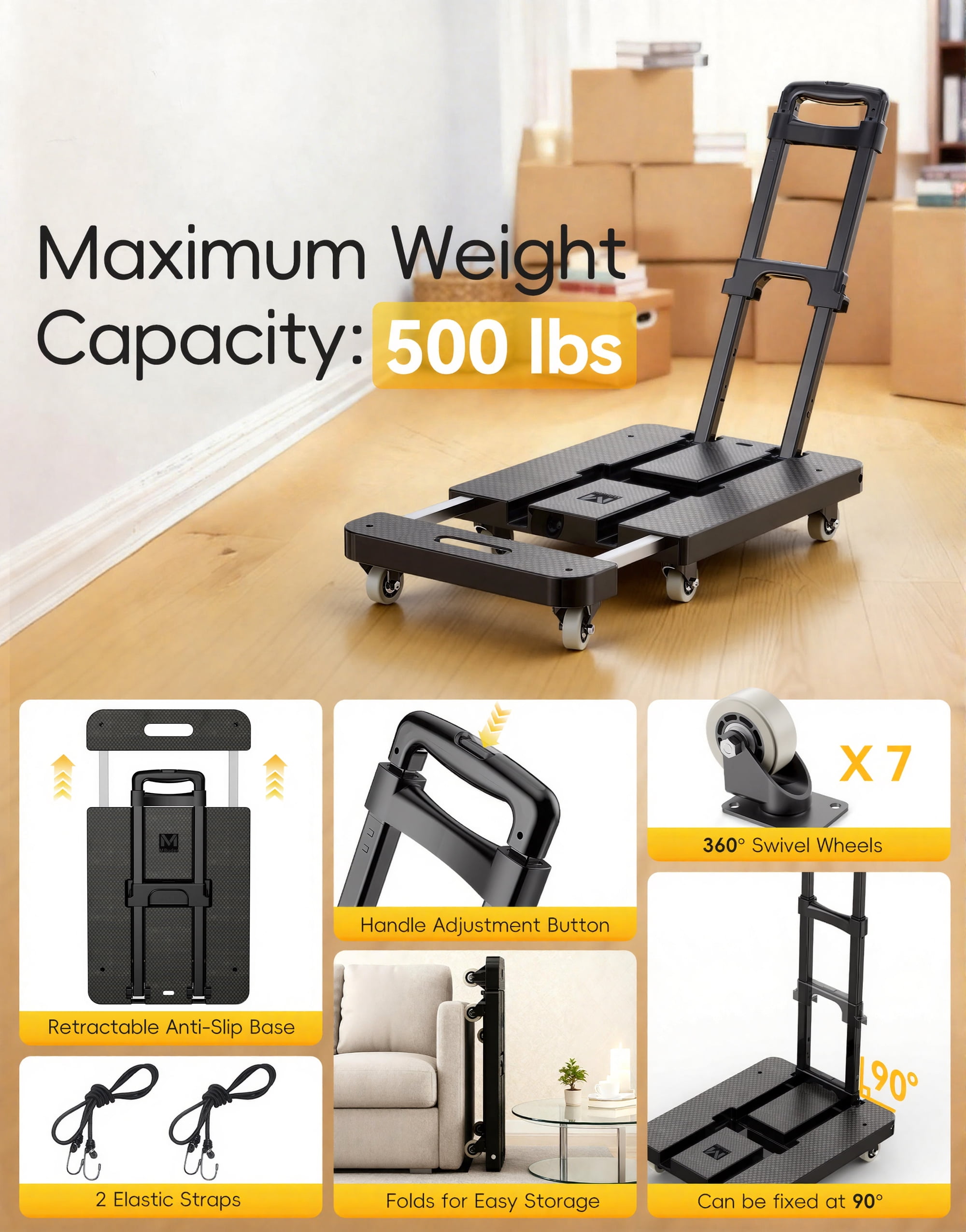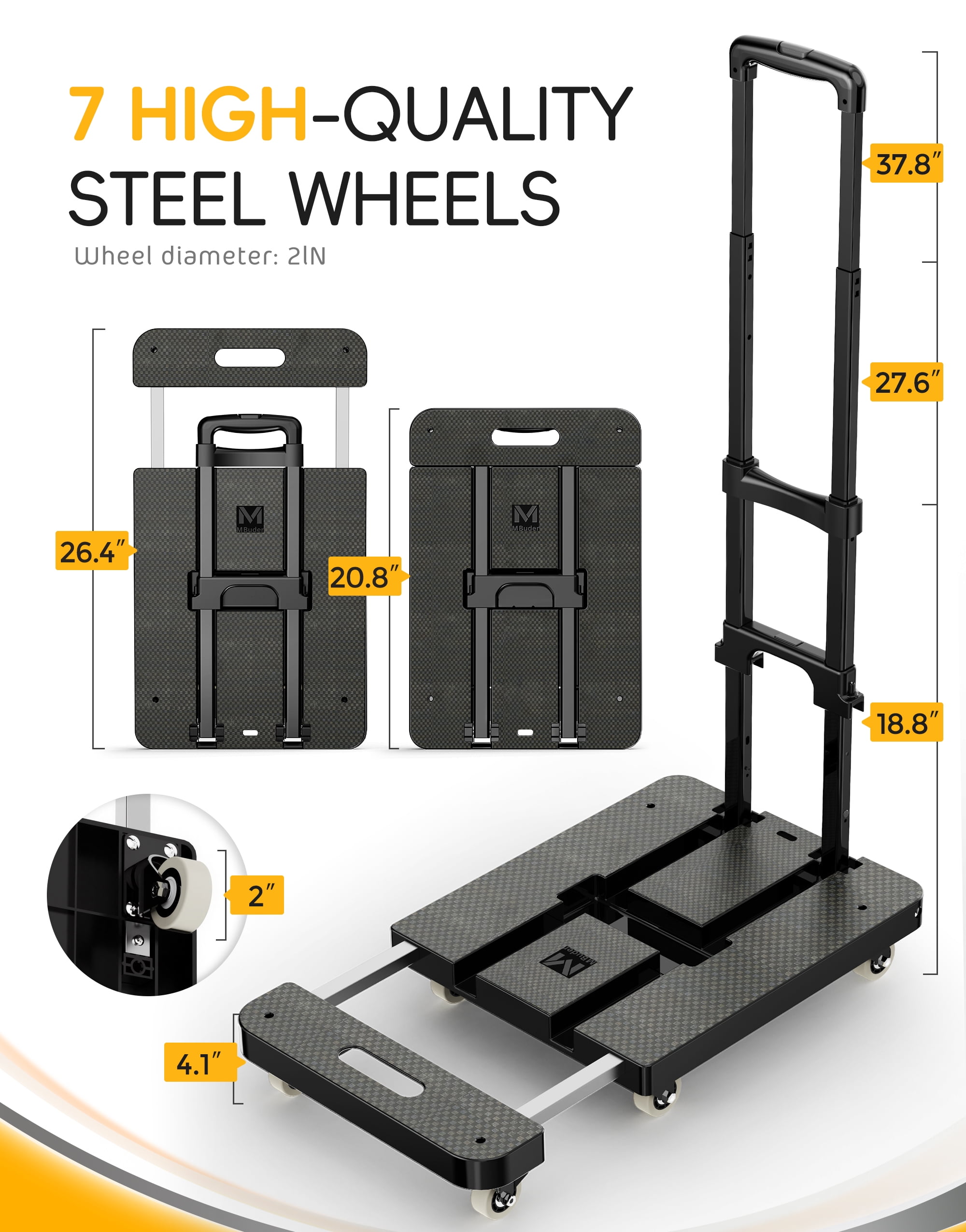 M BUDER Folding Hand Truck, 500 LBS Heavy Duty Dolly Cart, Utility Platform Cart with 6 Wheels for Travel, House, Office, Shopping, Moving Use – Black Folded Size is 11.8 x 17.7”