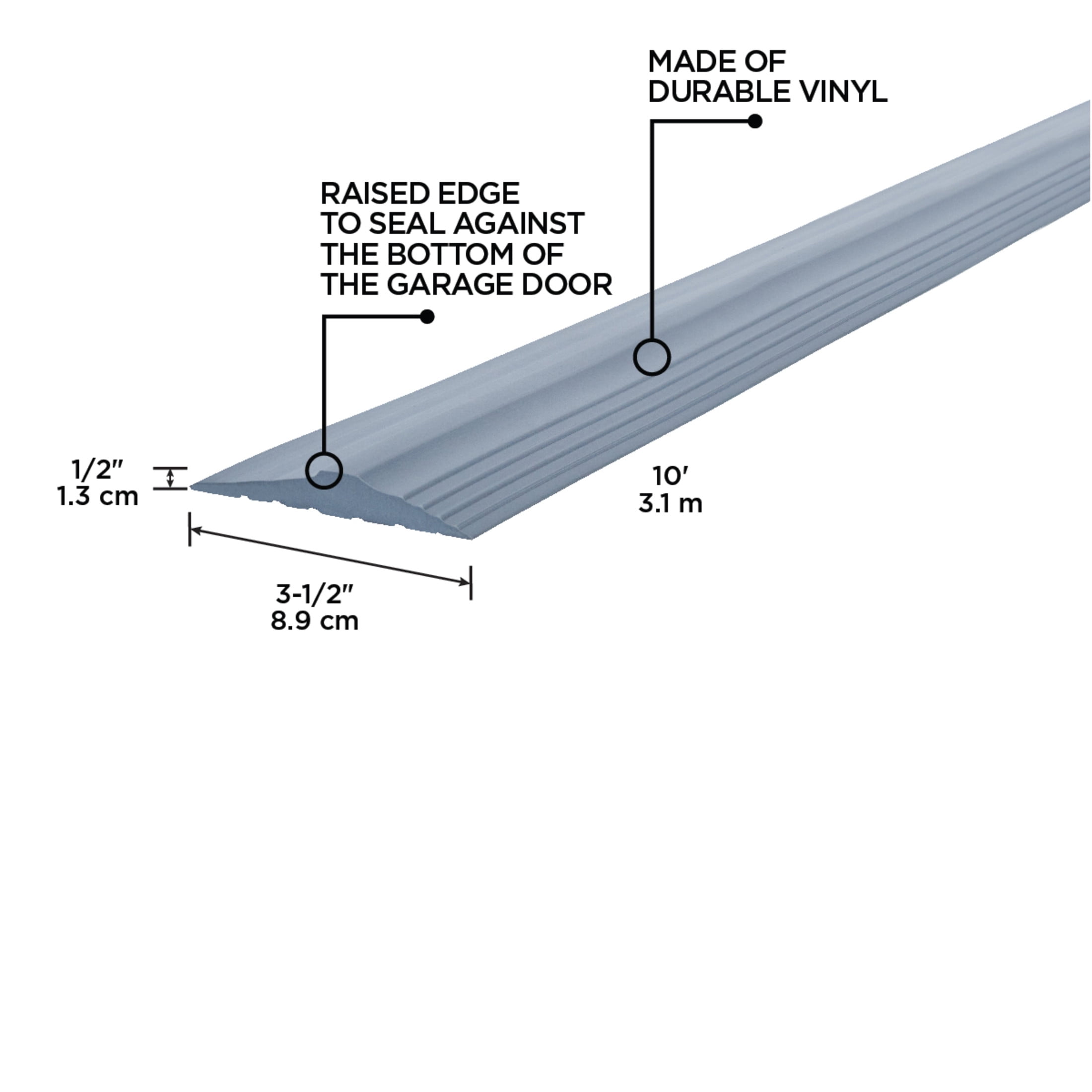 Made of vinyl Seals gaps at the bottom of your garage door 10 ft. L x 3-1/2 in. W x 1/2 in. H Gray color Easy to install Fastens with silicone adhesive Protects against drafts, wind-driven rain,snow, dust, dirt, leaves, and unwantted critters One tube of silicone adhesive included for installation Cut with hacksaw to desired length