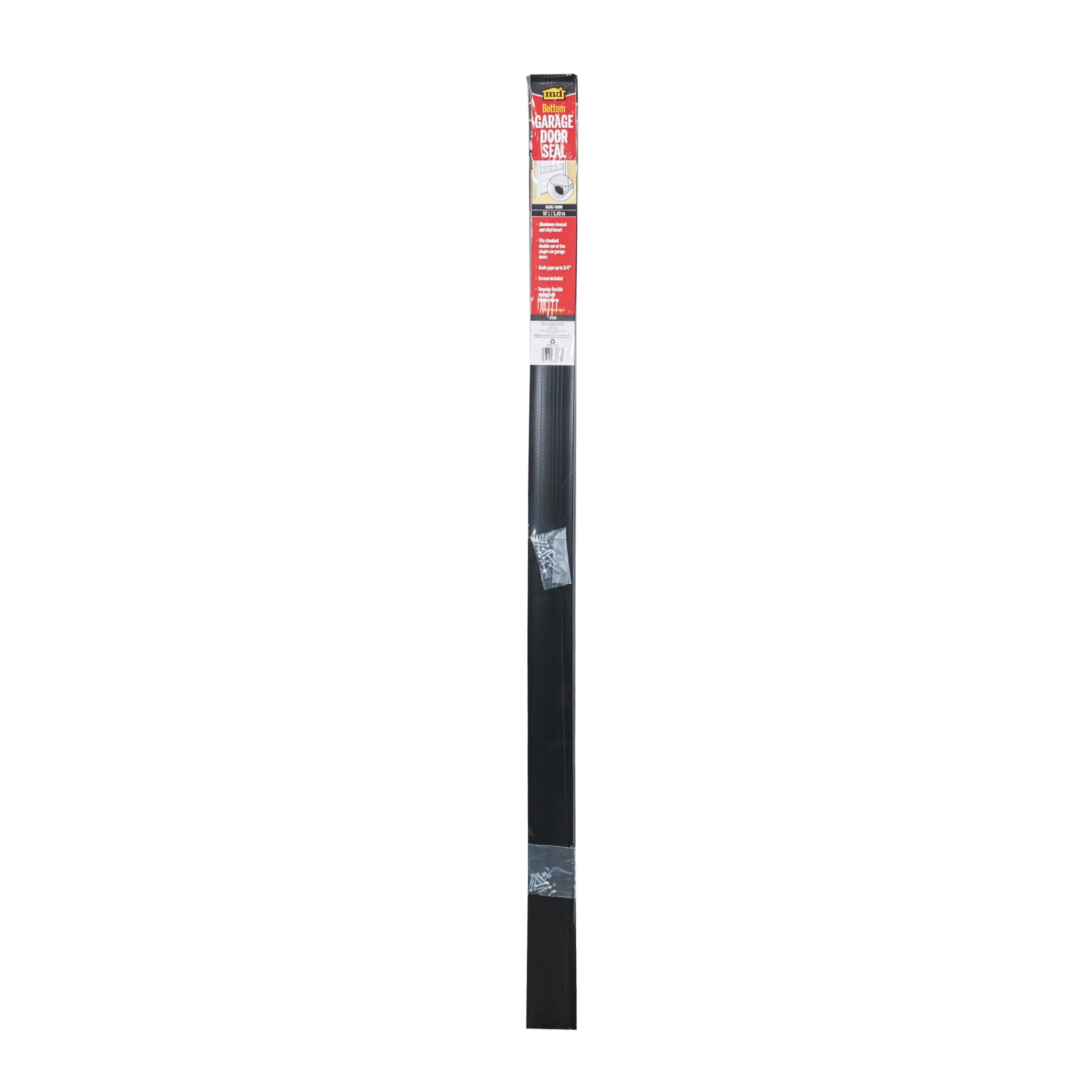 For use under garage doors to seal out air, moisture and dust Vinyl seal effectively closes gaps to prevent drafts, dirt, insects, and rain 18 ft. L x 2-3/4 in. W x 1-1/4 in. H Black color Aluminum base is fastened to the bottom of a garage door with the included screws For use on single steel or wood roll-up garage doors Maintains flexibility even in extremely cold temperatures Specifically designed garage door weatherstripping solution Provides year-round defense against elements for your garage Reliable and durable garage door bottom seal for long-lasting use