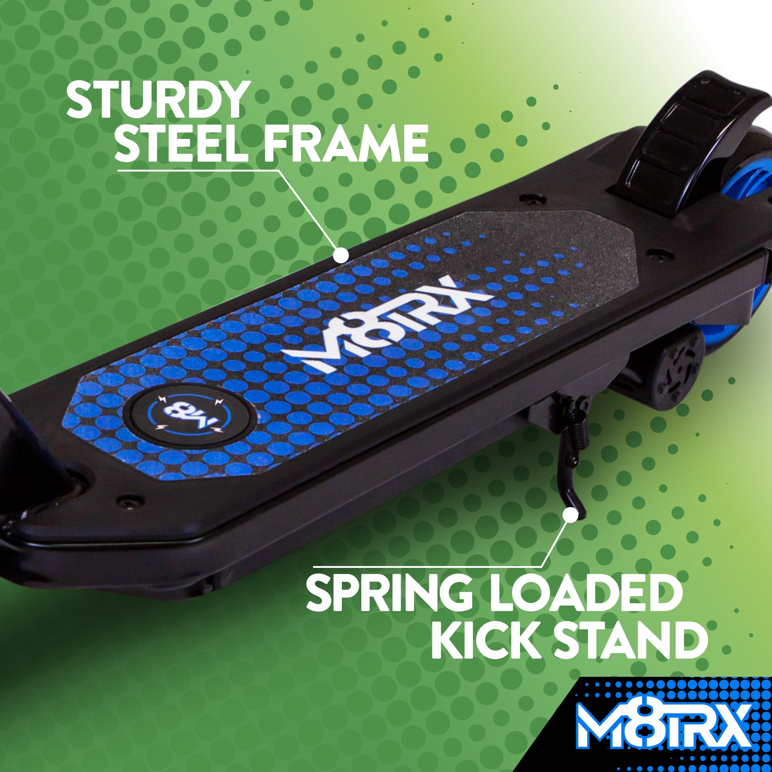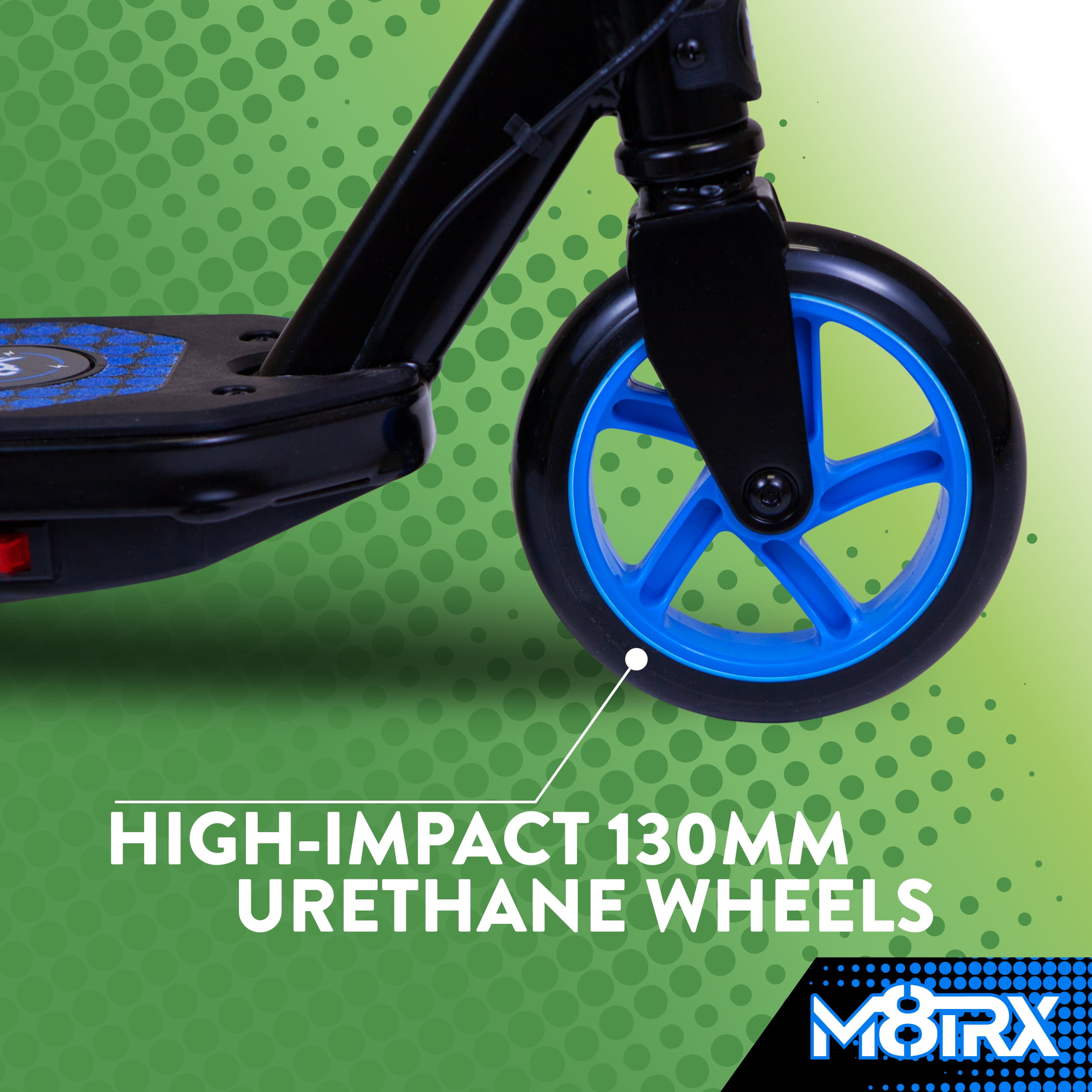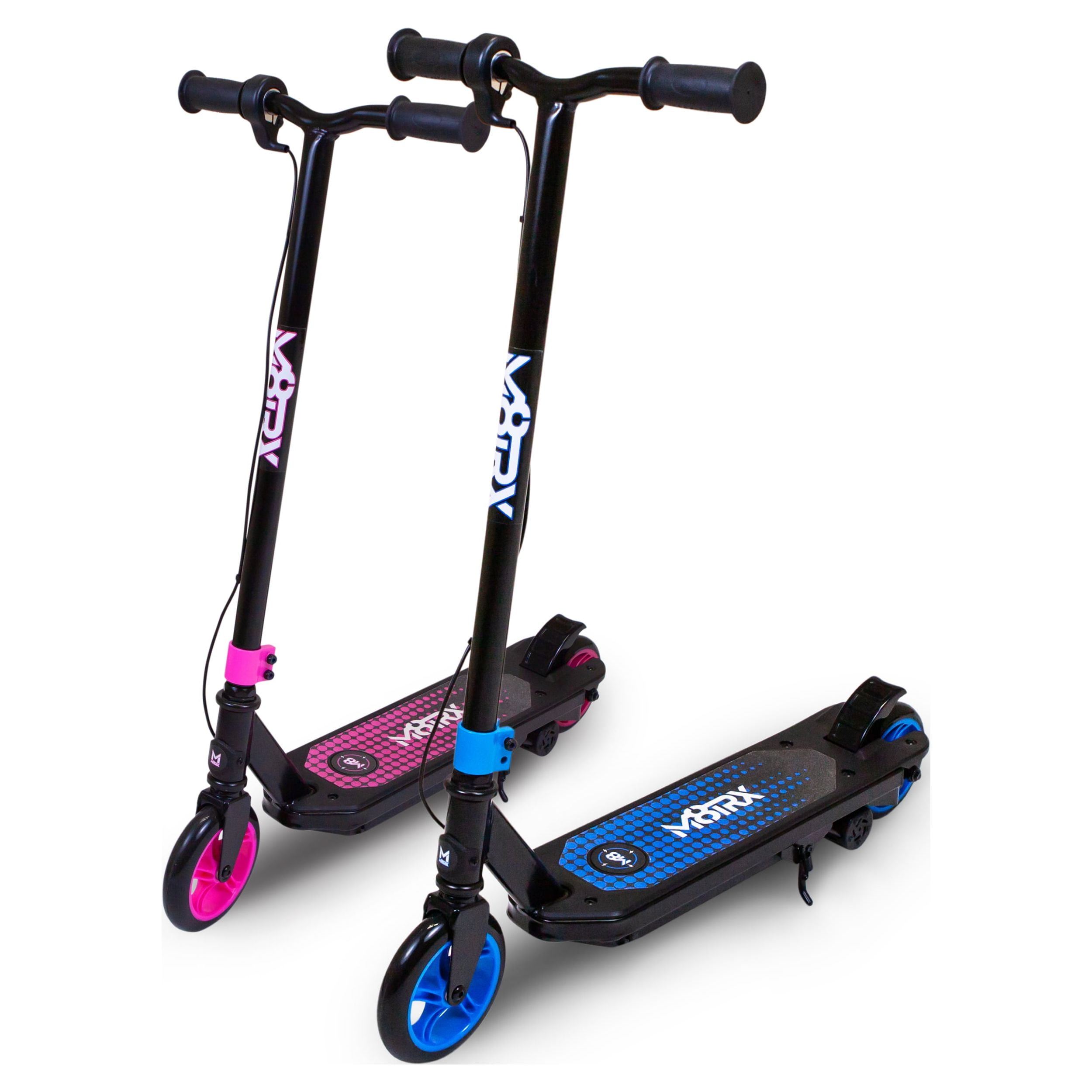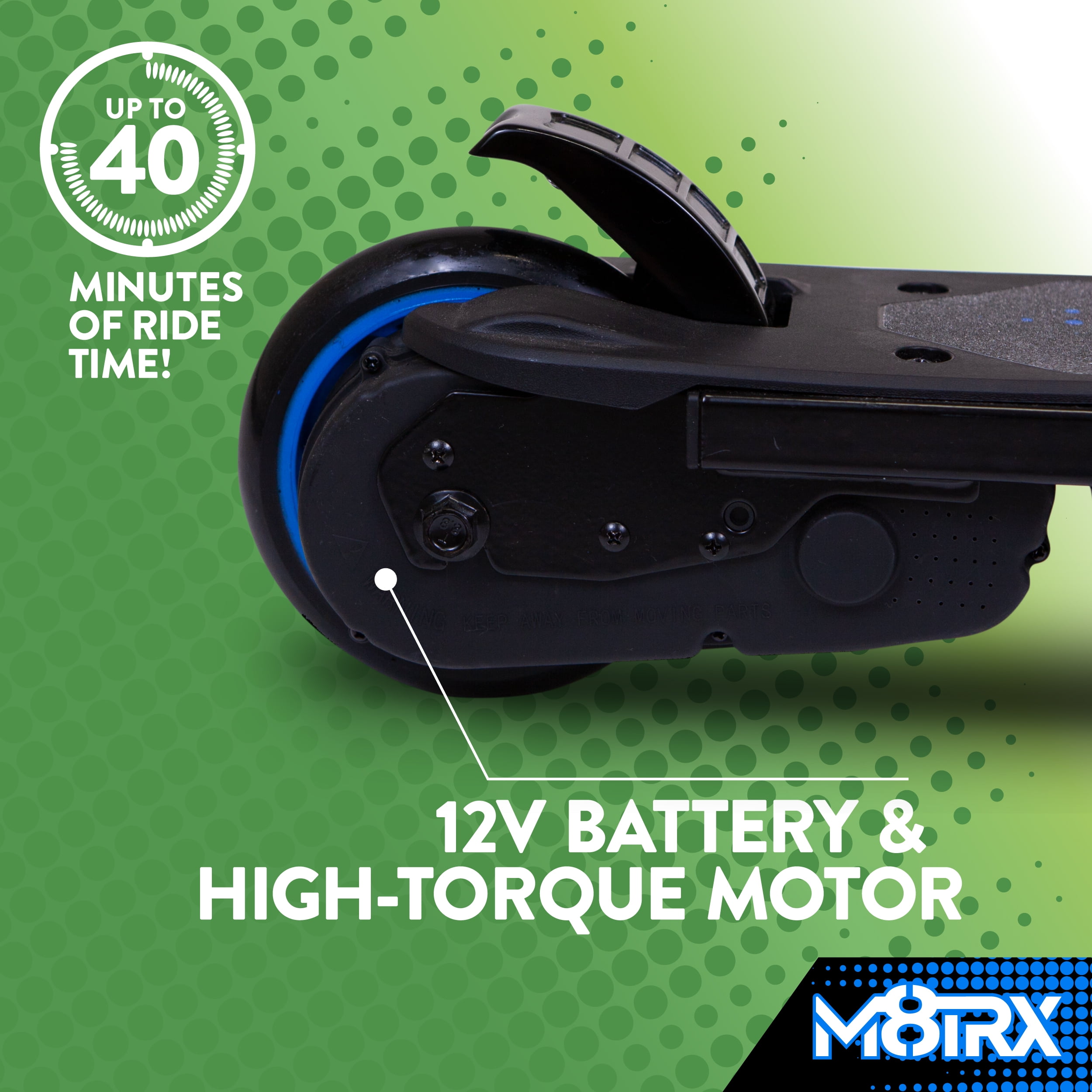Reach top speeds of 8mph on the M8TRX electric scooter Kids can ride this electric scooter for up to 40 mins Perfect for children between the ages of 6-12 years old Easy grip handles; thumb activated throttle 12V battery and high-torque electric motor High-impact 130mm urethane wheels Two color options: the boys (male) electric scooter in blue and the girls (female) electric scooter in pink