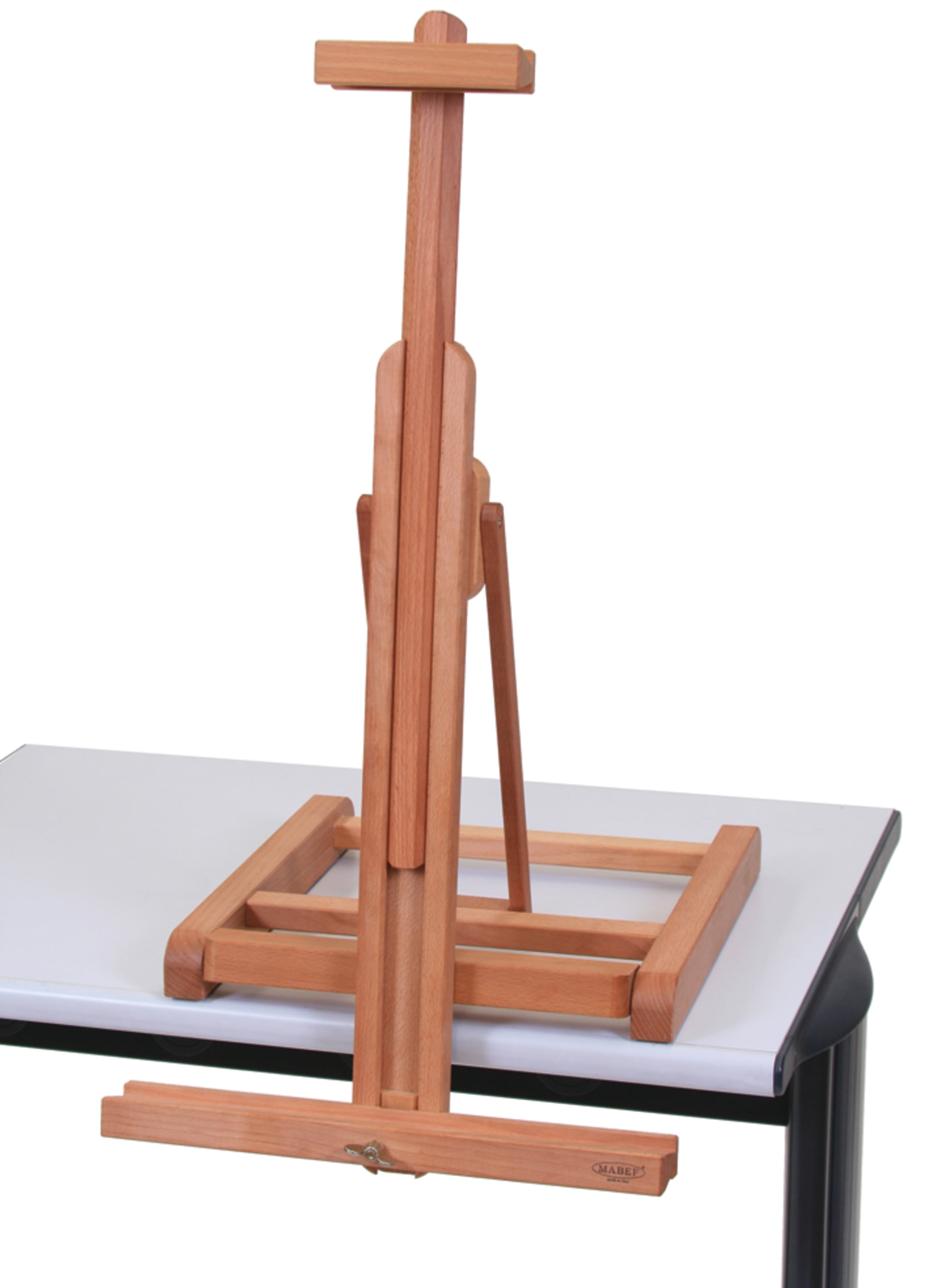 This space-saving MABEF table top easel features an adjustable canvas holder that can go below the table level to accommodate a wide range of canvas sizes.