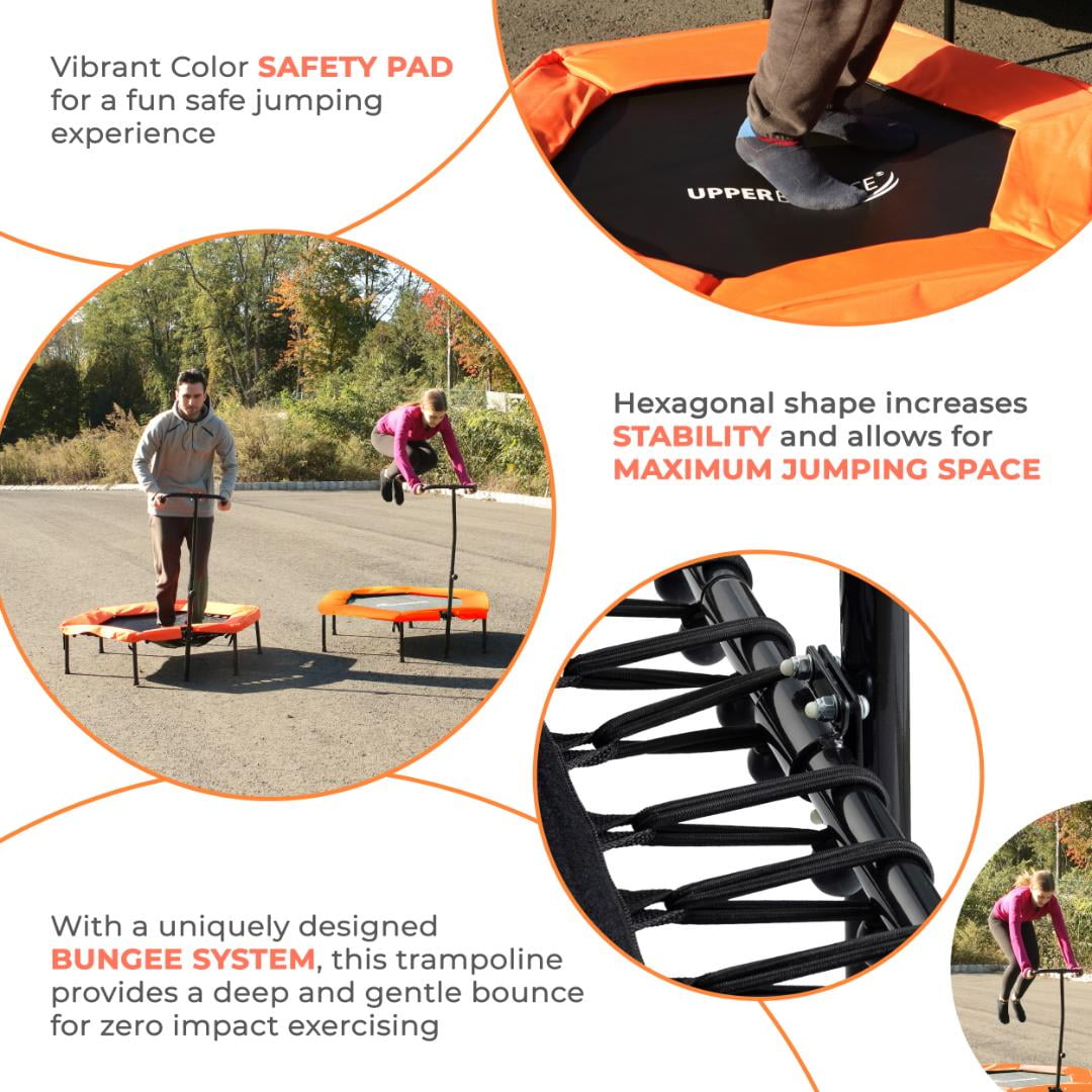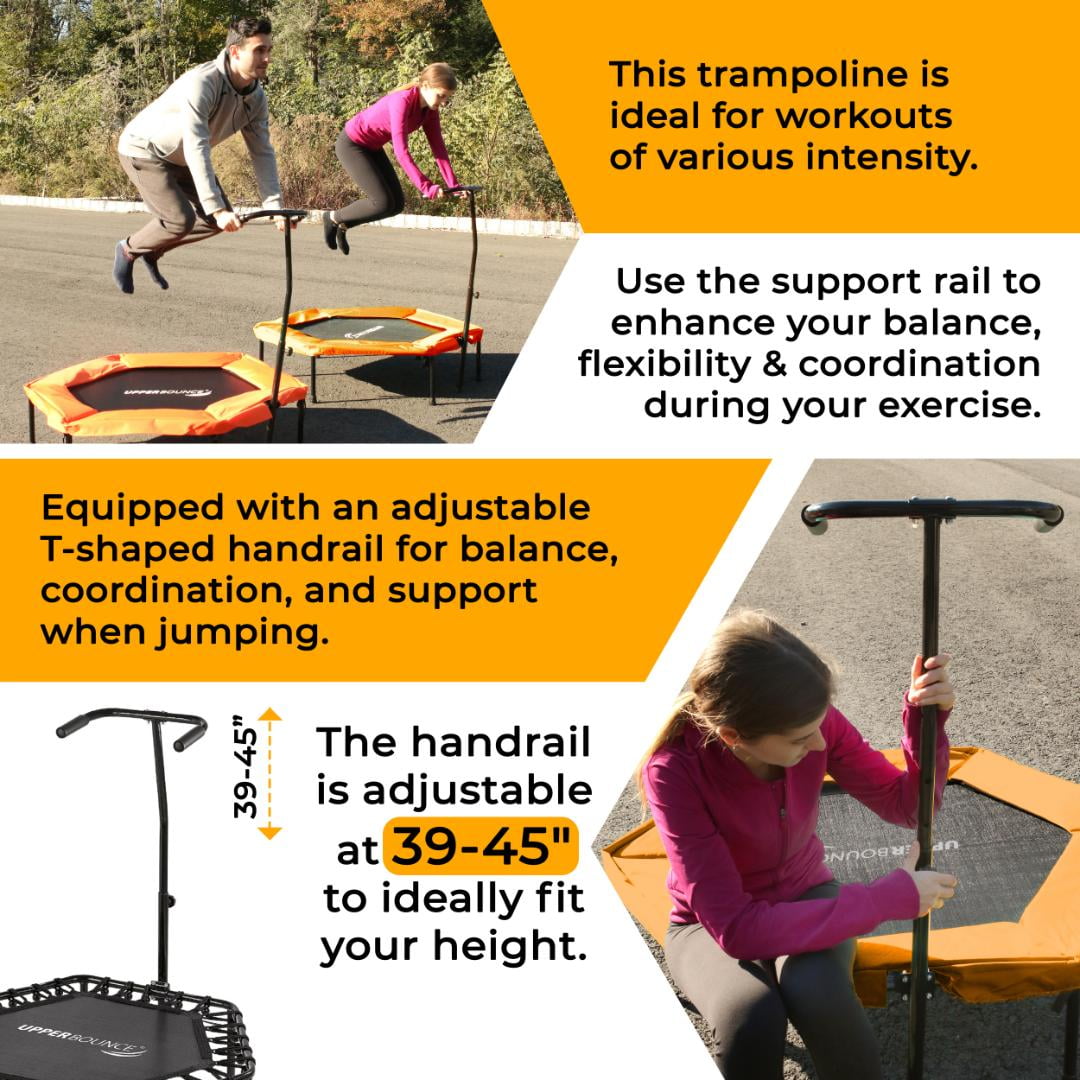 Machrus Upper Bounce 50″ Mini Trampoline with Adjustable T-Shaped Handrail – Hexagonal Rebounder Fitness Trampoline for Kids & Adults- Orange