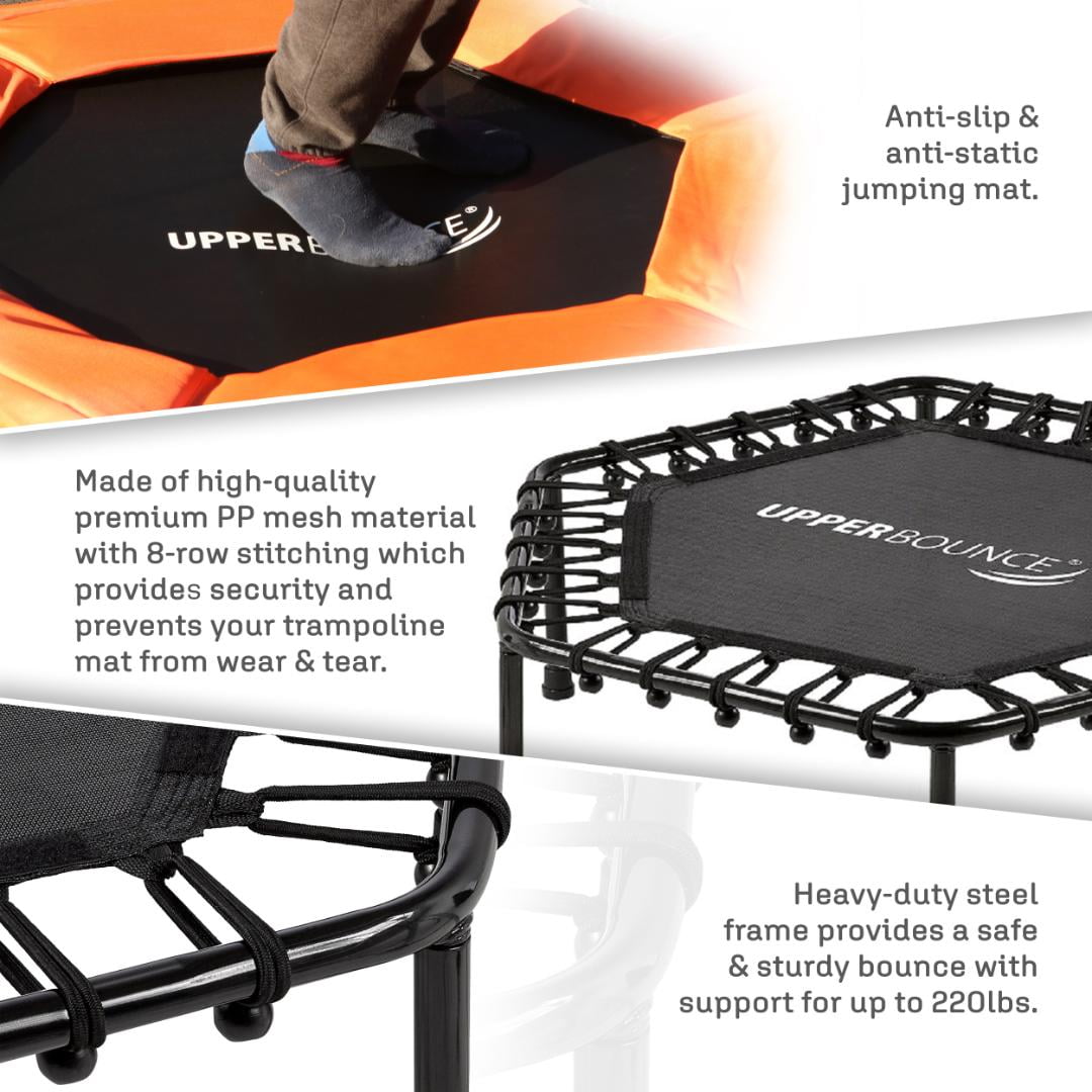 Bring fun together with health and fitness to your home and family with this Machrus Upper Bounce 50″ Hexagonal Fitness Trampoline! You can even watch TV while exercising, enabling you to burn calories and have fun at the same time. The small and sturdy rugged steel structure makes it compatible for indoor or outdoor use. The hexagonal shape increases stability and allows for maximum jumping space on the high-quality polypropylene mat. The trampoline features an adjustable t-shaped handrail for extra support as well as rubber-tipped legs to protect your floors and maintain traction. With a uniquely designed bungee system, this trampoline provides a deep and gentle bounce for zero-impact exercising. Bungee trampolines tend to be quieter, sturdier, and more reliable than spring trampolines – making upkeep and maintenance a breeze; guaranteeing that this is a purchase you will enjoy for many years. Safe for a broad range of ages and abilities, rebounders are fun and easy to use – use for jogging, bouncing, or dancing, and you will reap the benefits! Rebounding improves circulation, increases the capacity of your heart and lungs, and builds strength and stamina. In just one hour, burn up to 1,200 calories! All Machrus Upper Bounce trampolines are built with safety as the very first consideration. The trampoline comes with clear and detailed instructions and includes all necessary tools and hardware to ensure smooth assembly. Let’s go out and play!