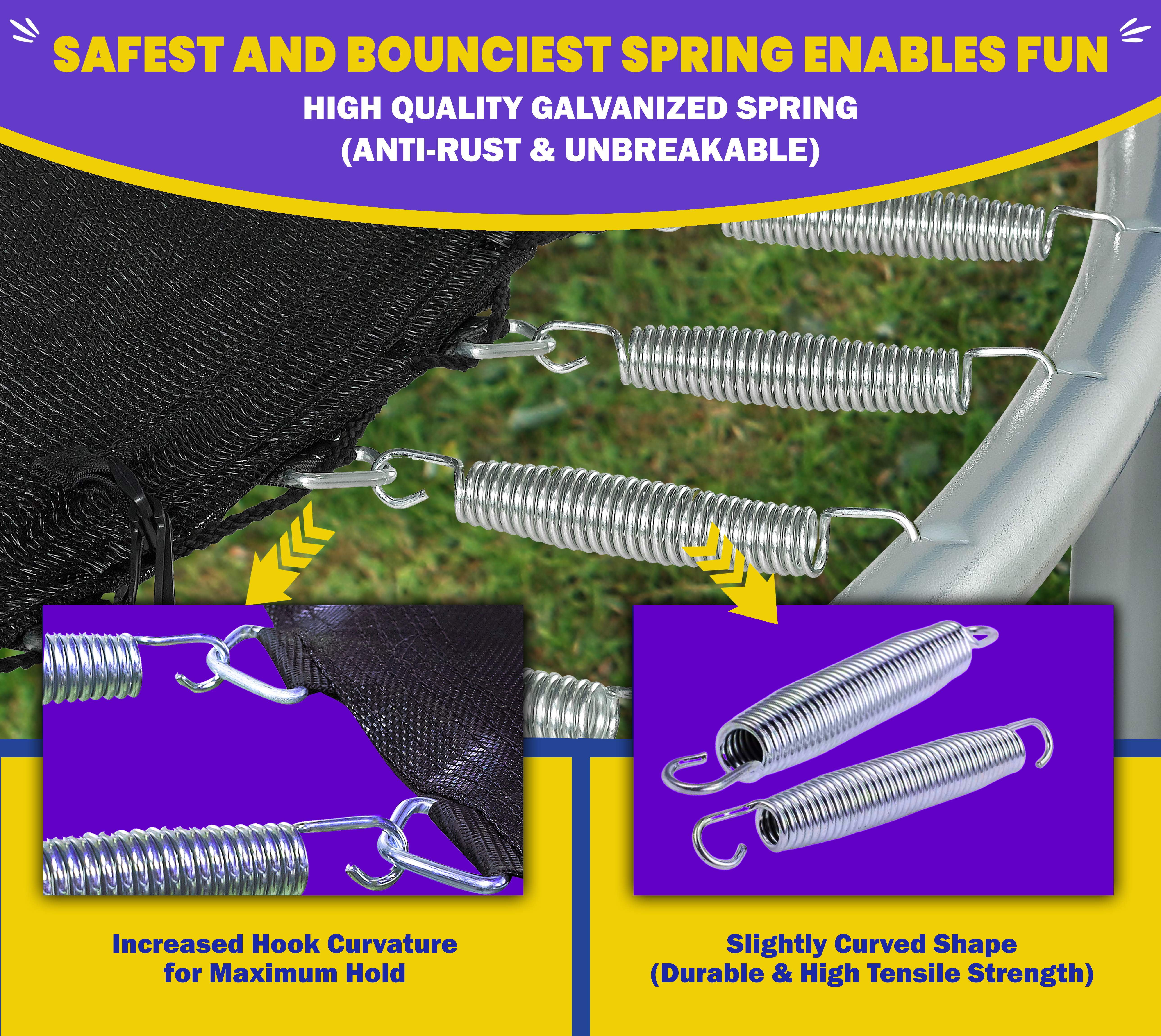 Endless Hours of Outdoor Fun: Upper Bounce 9FT Trampoline safety pad over the springs ensures the safety of children and prolongs the load-carrying ability of springs. Made of ASTM Standardized solid steel to deliver plenty of safe fun for kids Easy to Assemble: User-friendly instruction manual comes with kids trampoline to provide ease during first time assembling of trampoline’s accessories. You receive all parts of the trampoline in ONE single package which will ensure a quick delivery. The Perfect Gift: Make your children feel special on their birthday by surprising them with our trampoline for toddlers and older kids to have an exciting bouncing experience Exceptional Quality Material: Galvanized steel frame & springs, and powder coated legs for extra protection. Its innovative 8-row stitched high-quality premium PP mesh jumping mat and its strong and firm structure can accommodate up to 220 lbs. Customer Service and Unbeatable Guarantee: Providing top-notch customer service is our #1 priority. Our trampoline comes with 1-year warranty of jumping mats, frame & spring, & immediate replacement at zero cost, if anything is found defective