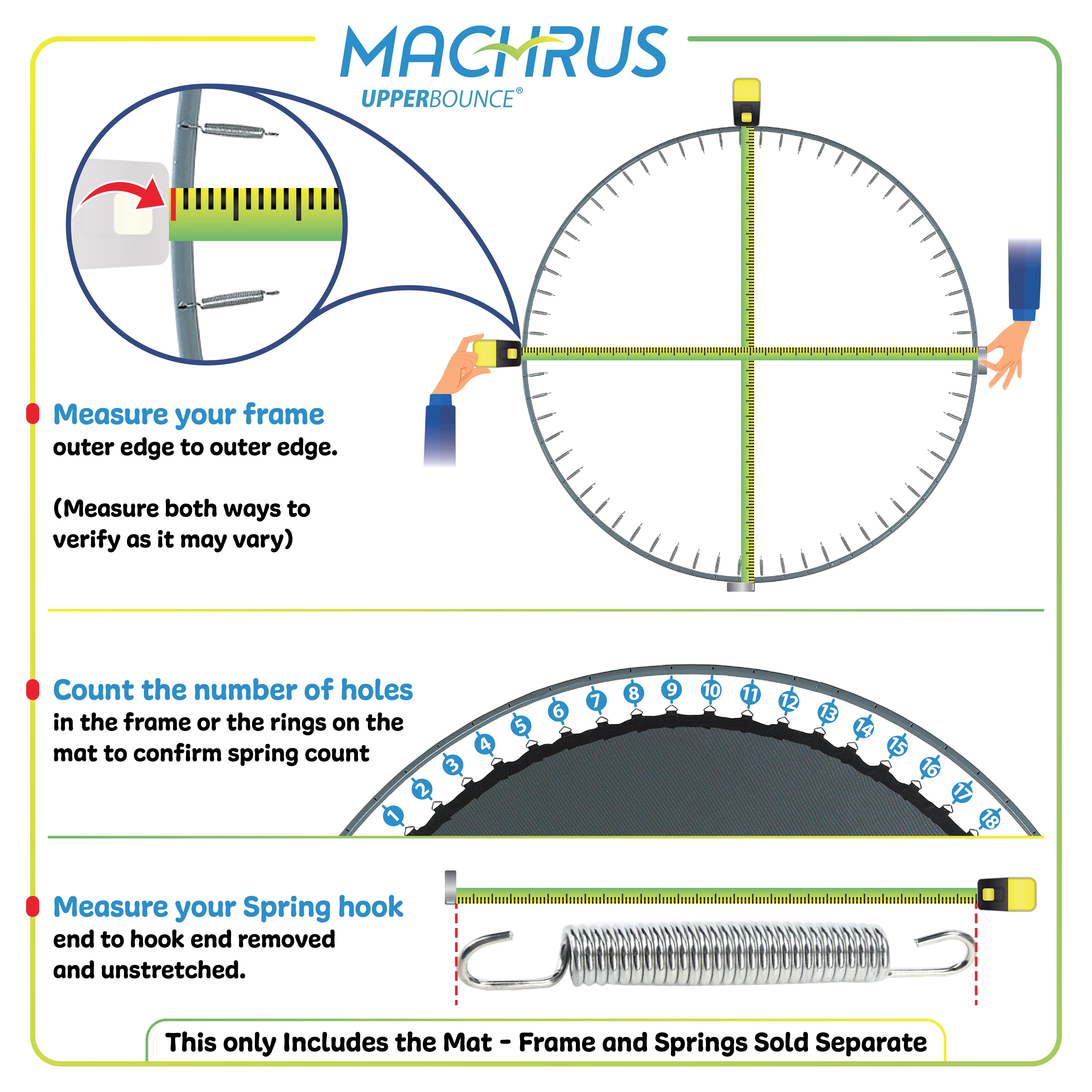 This Machrus Upper Bounce Jumping Mat is specially designed to fit 14 FT. Trampoline Frames of all brands and models, with 96 V-Rings using 8.5″ Springs. Machrus’s Upper Bounce Trampoline Jumping Mat features ultra-durability through its premium PP Mesh Material. Furthermore, our Jumping Mat also provides extra security with its 8-row stitching thus guaranteeing the mat from tearing. Machrus’s Upper Bounce High-Quality Jumping Mat is guaranteed to be UV and water-resistant, offering you a safe long-lasting fun investment! The thick replacement trampoline mat ensures absolute safety for your children. The Machrus Upper Bounce trampoline jumping mat provides tremendous jumping momentum and bursting strength for a controlled and responsive jumping experience. Let’s go out and play!