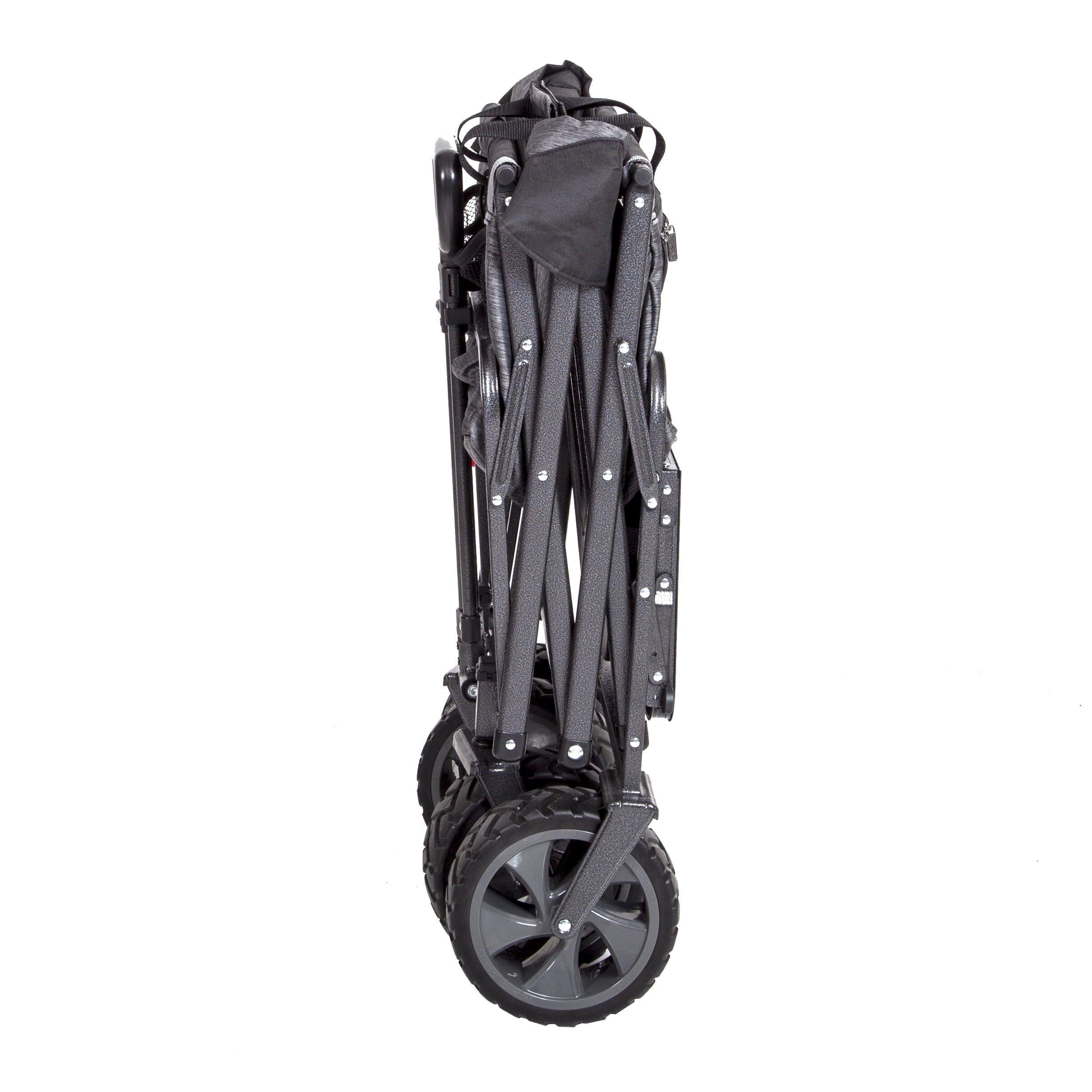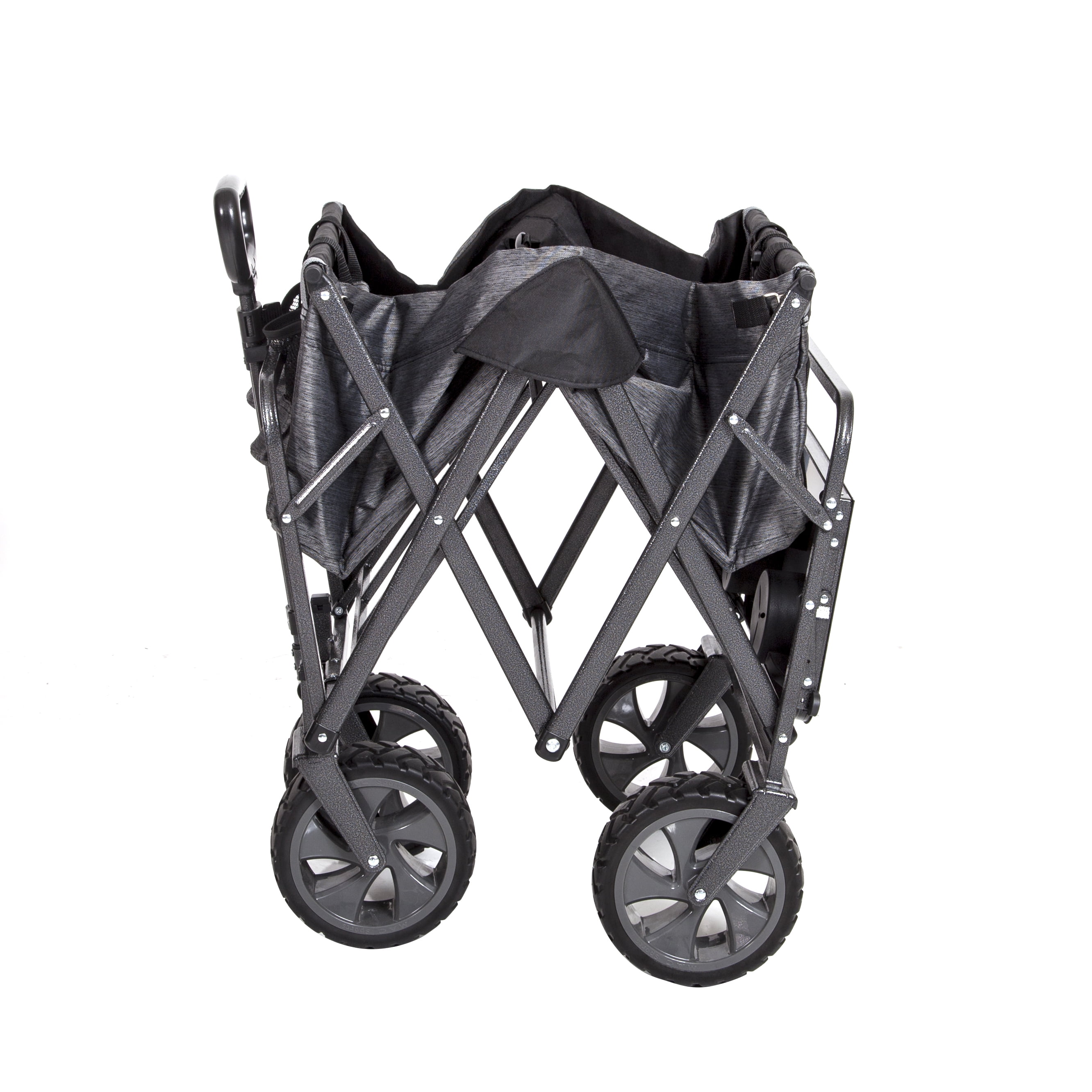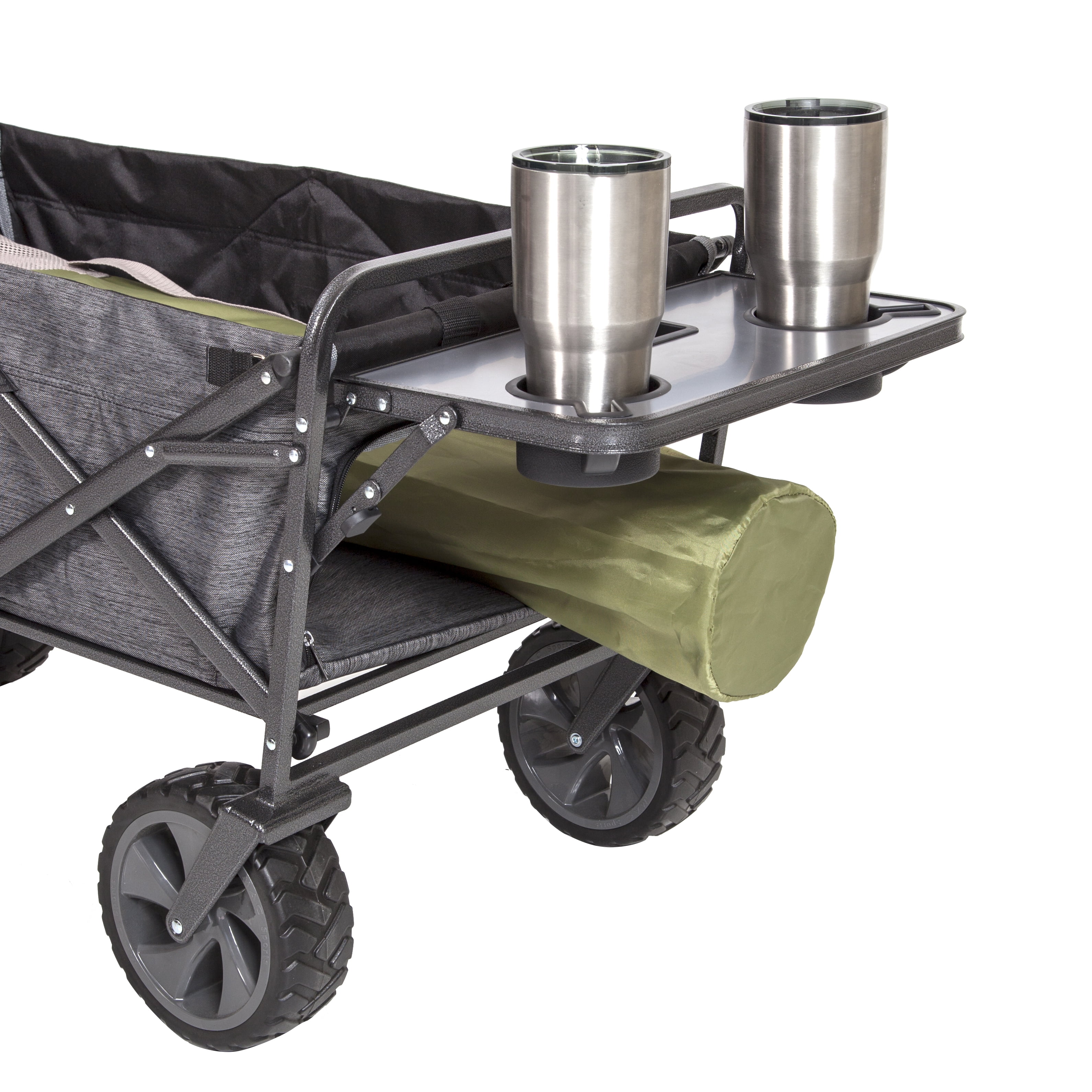 Introducing the Macsports folding wagon with a new zippered tailgate The zippered tailgate is super-handy for carrying longer items such as chairs and canopies! This wagon includes a folding rear table equipped with two cup holders and a tablet/phone holder. It has a weight capacity of 300 lbs, making it perfect for transporting gear to and from the park, sporting events, concerts, and farmers markets. It’s also great for gardening and lawn work. The wagon is built with a sturdy steel frame and polyester fabric and features two attached front cup holders. When not in use, it can be folded compactly for transport in a vehicle or for easy storage at home. The best part is that it opens and folds in seconds, requiring no assembly.