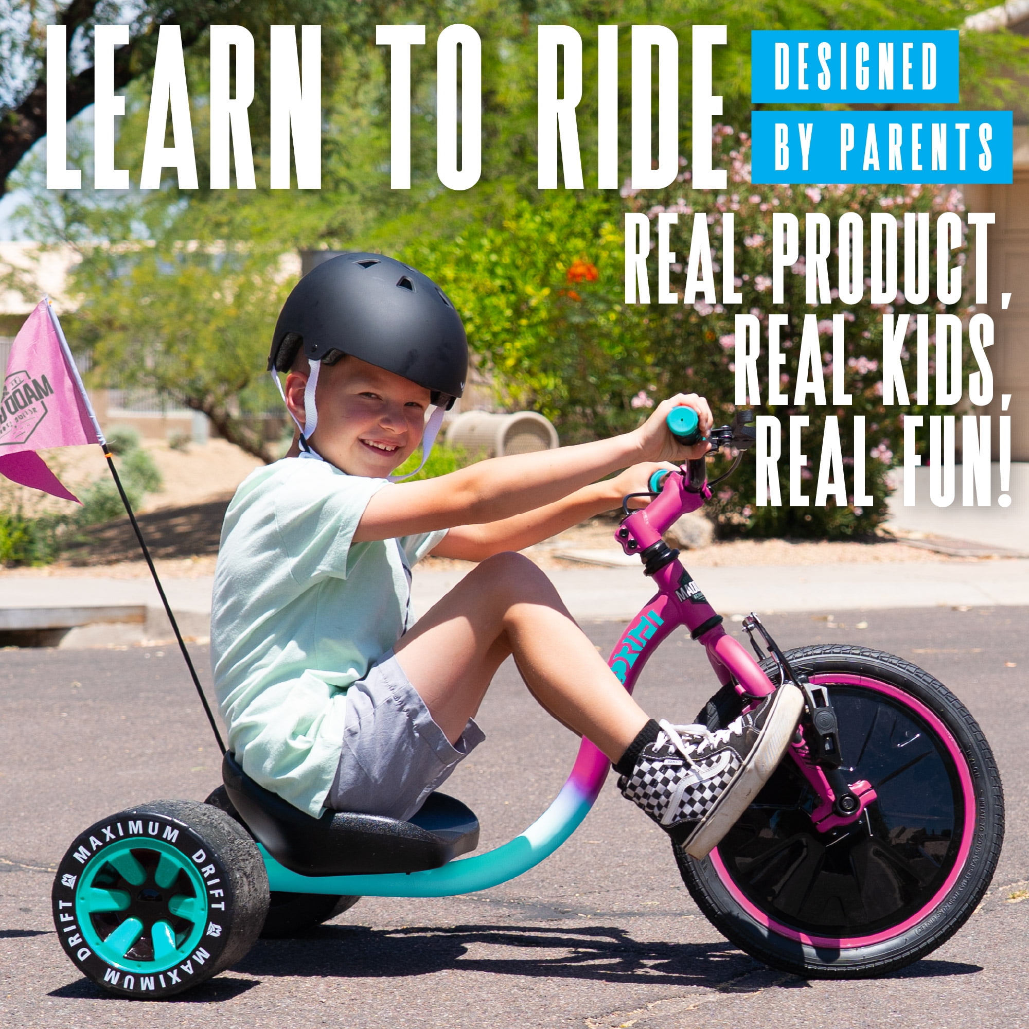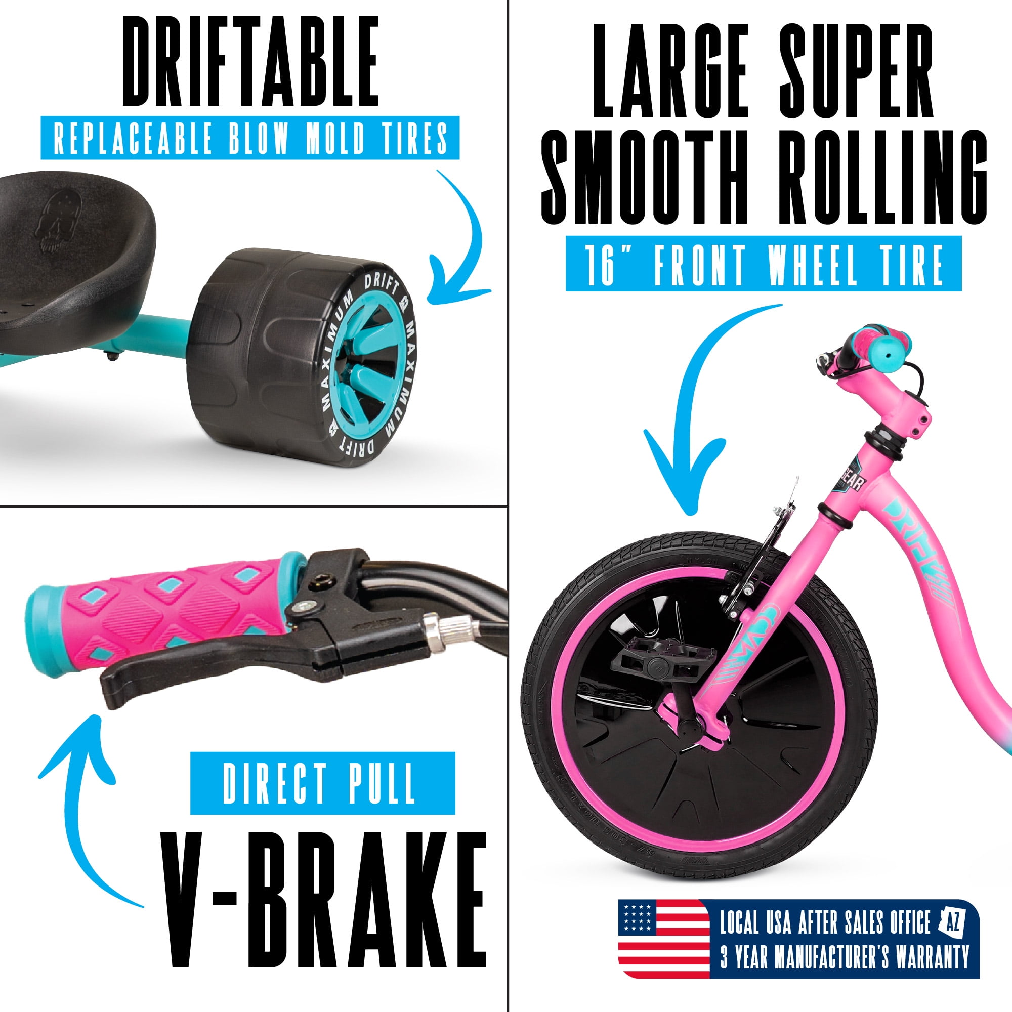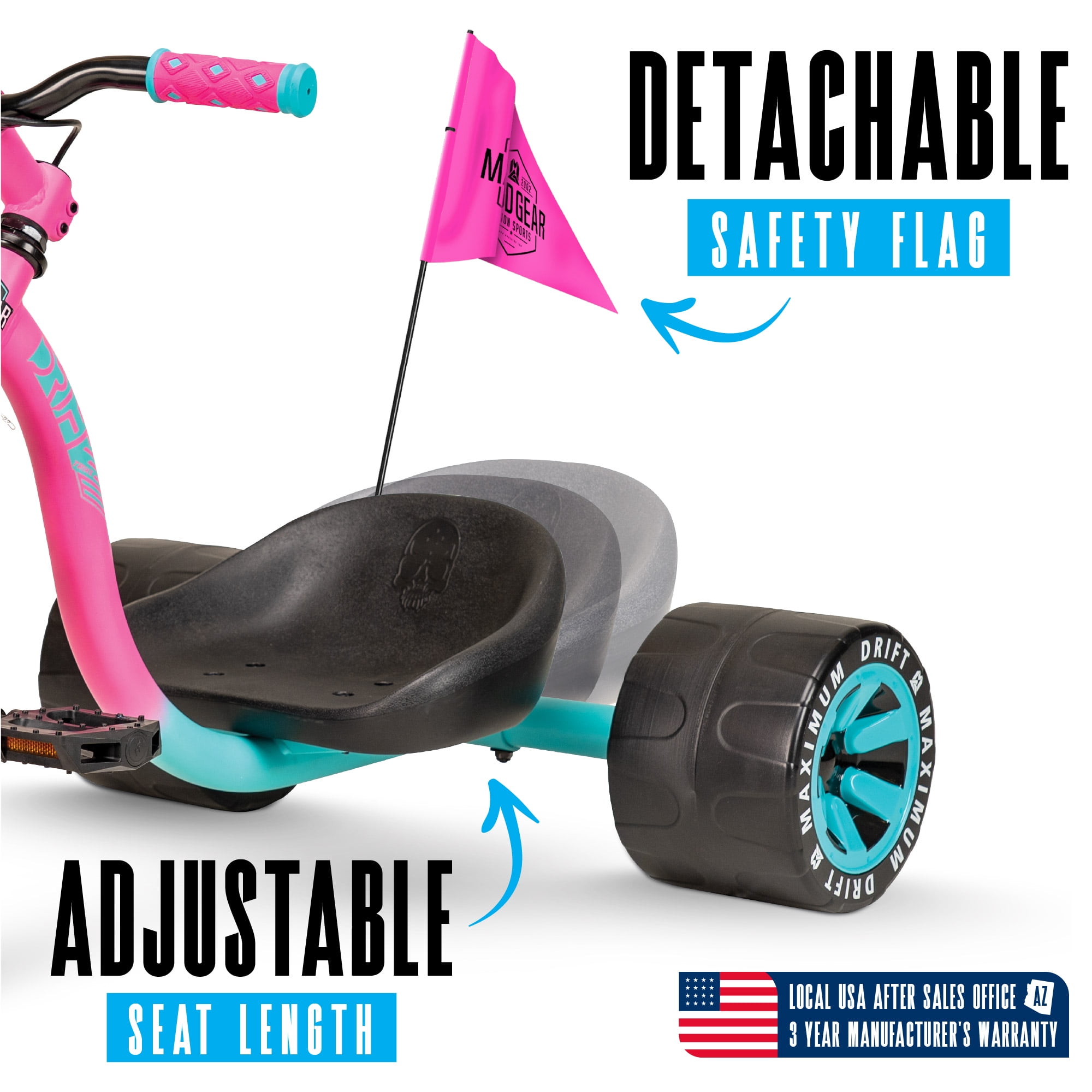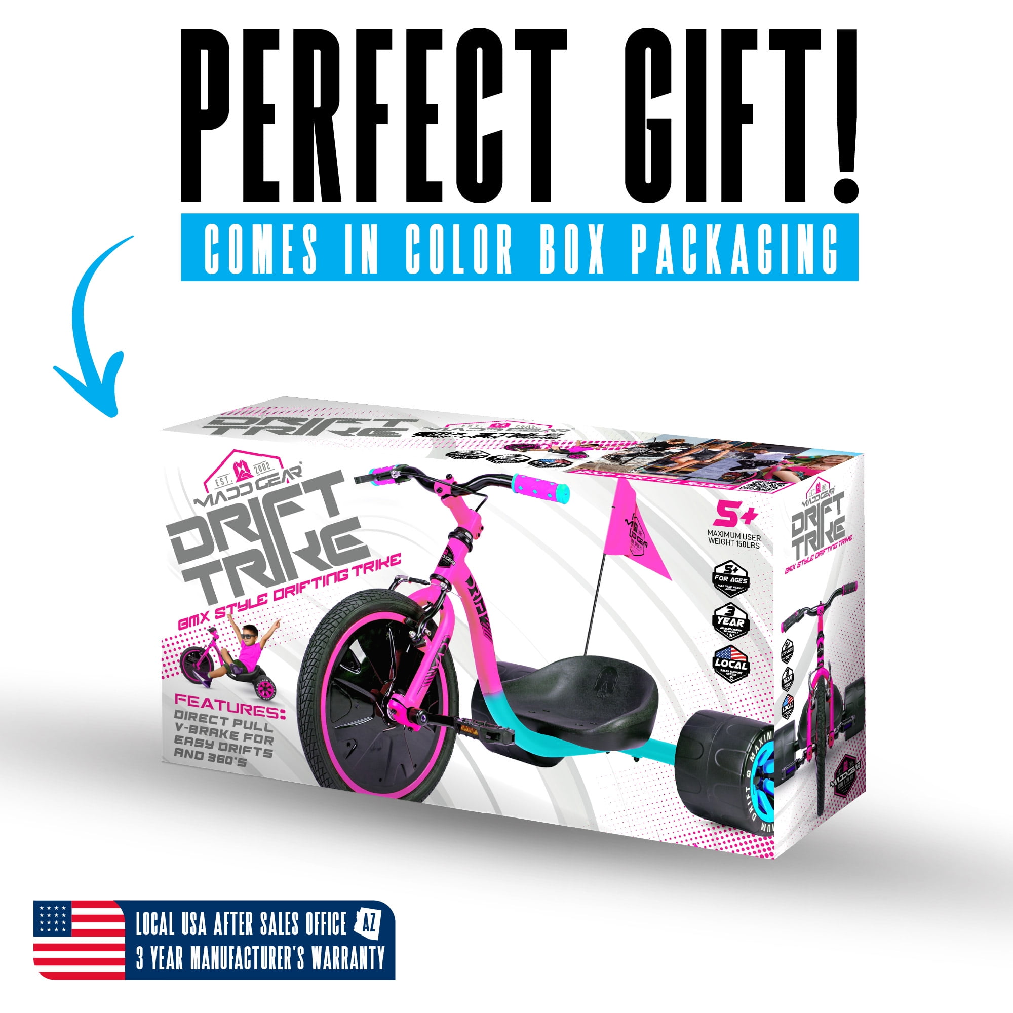 Madd Gear Adjustable Seat Unisex Kids Drift Trike Tricycle, Pink Built to last with strong high-tensile steel construction Features replaceable hard-compound rear drifting wheels for sliding and spinning action Easy assembly with a detailed instruction booklet and online assembly video Designed for safe outdoor fun with a low-to-the-ground build and wide wheelbase Equipped with an integrated front wheel spoke cover and flag for enhanced safety