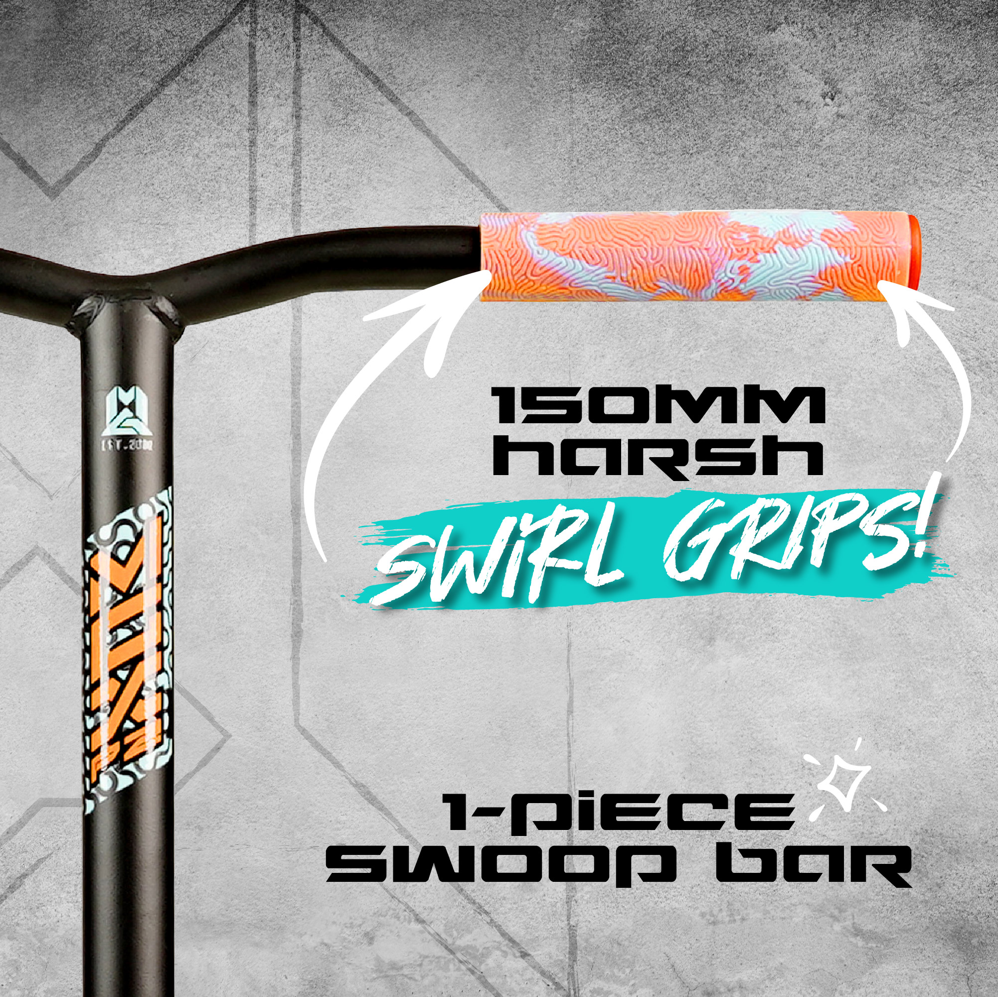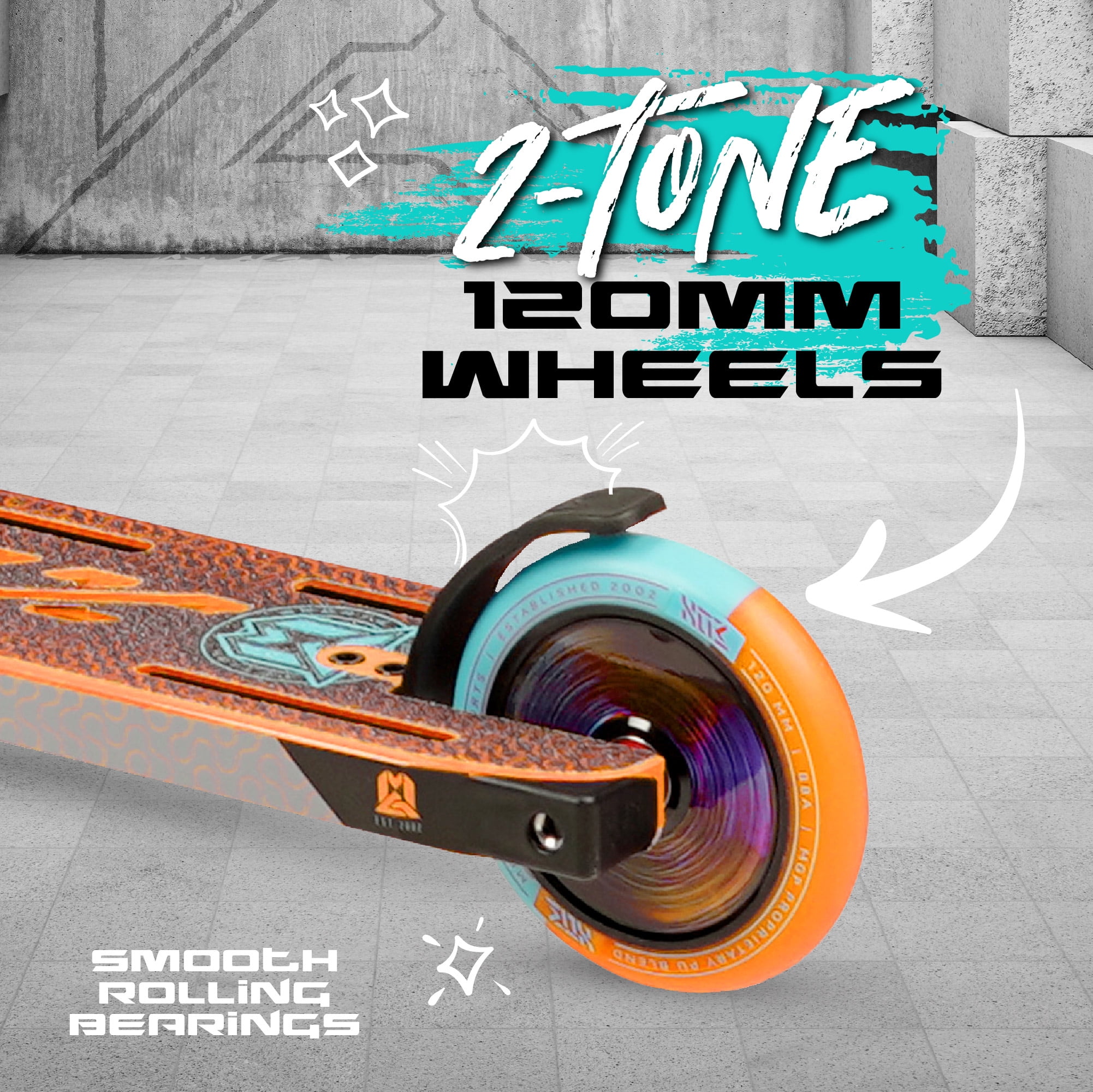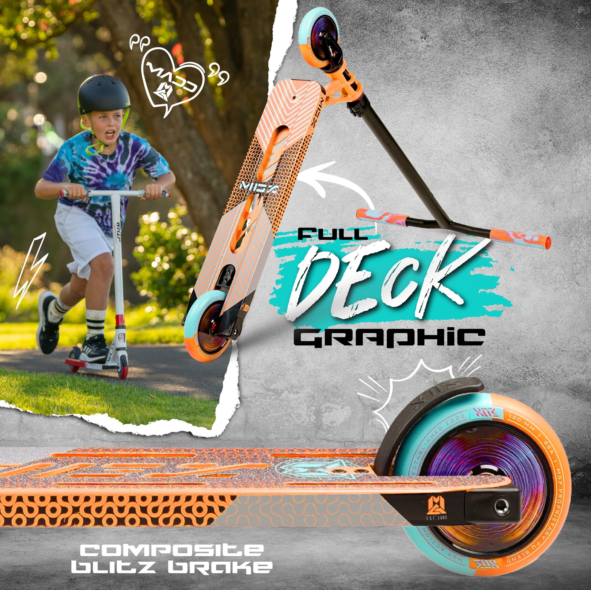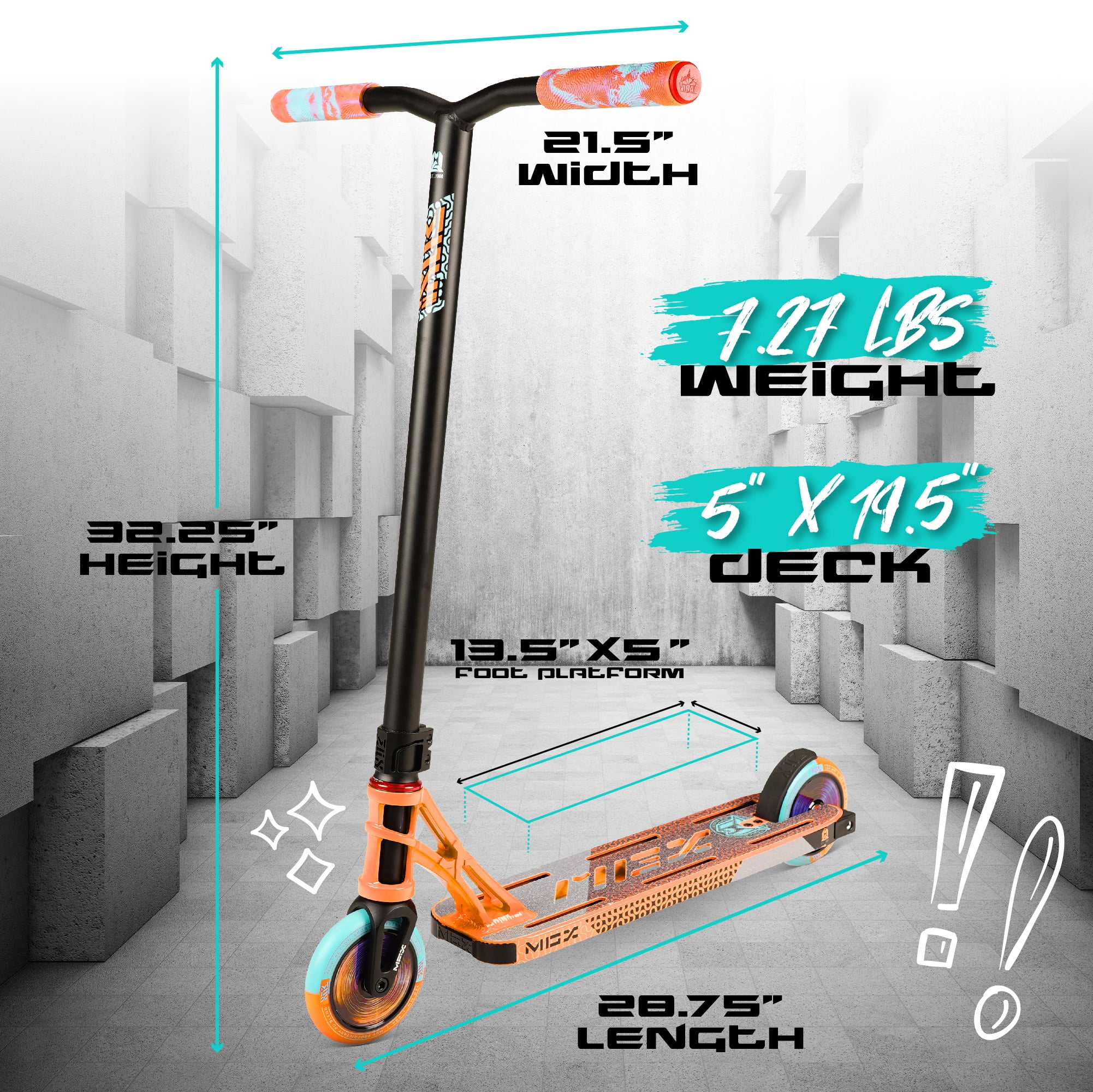 Grips: 150mm dual-compound super-soft TPR swirls flangeless Viral grips with nylon bar-ends Bar: MGP Low-riser 21″ W x 23″ T 4031 Japanese chromoly standard diameter with internal fluting Clamp: MFX X2 Cobra aluminum double with 6mm hardware Headset: MFX low friction integrated with sealed bearings Fork: MGP Voltage threadless aluminum with 6mm hardware / standard IHC compression Wheels: 120mm Holographic hollow core with 2-tone MGP proprietary PU blend Bearings: MGP K-2 Abec-9 high-speed chrome Deck: 5″ W x 19.5″ L two-phase heat treated 6061 aluminum concave fluted extrusion deck with machine welded MGX “X” integrated headtube Brake: MGX V2 composite Blitz brake Grip tape: MGX full deck super-strength grip with pro cutout Finish: Durable powder coating with MGX full deck wrap water decal Detail: Holographic core wheels. Heavy-duty PP deck blocks.