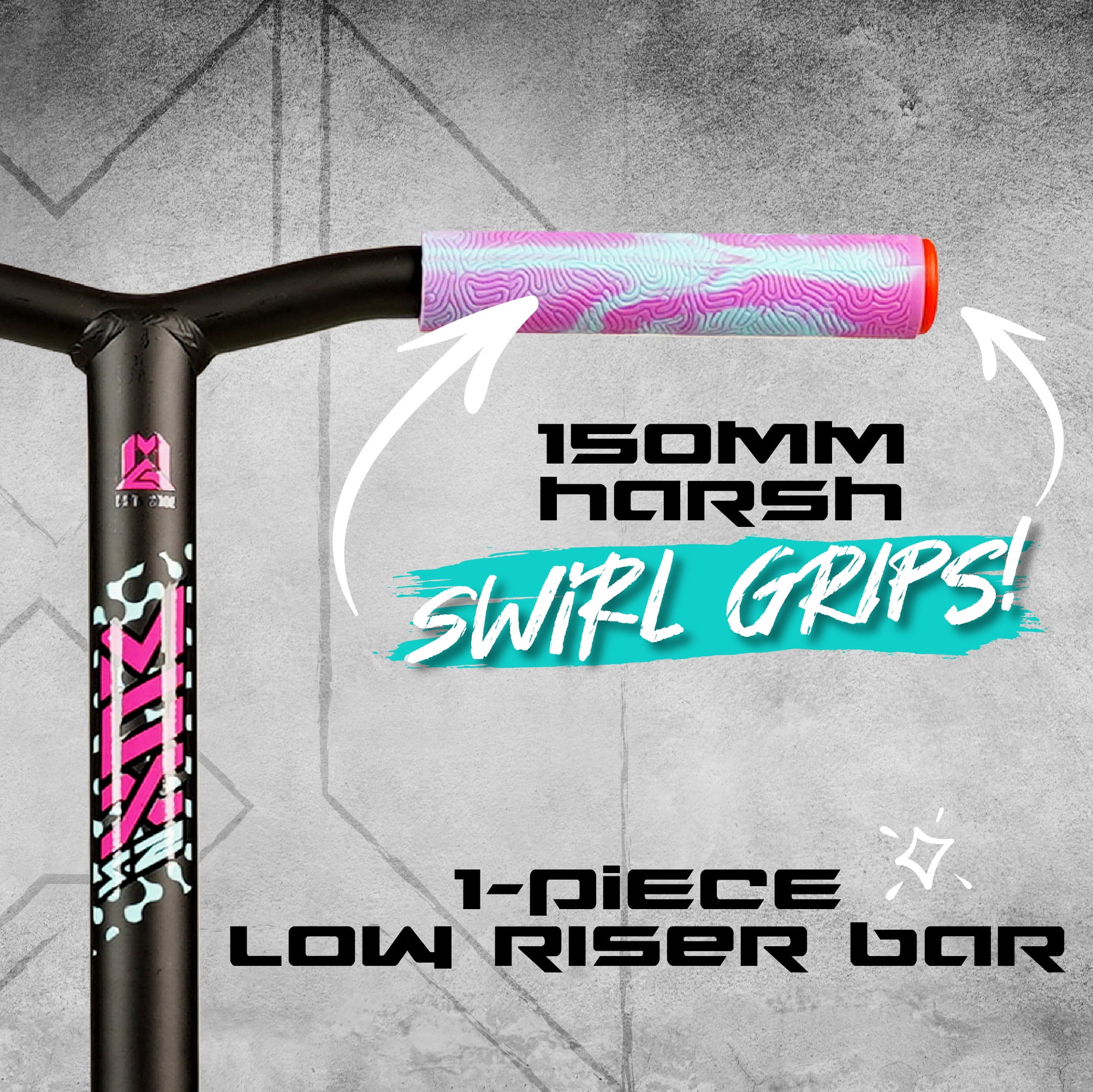 Grips: 150mm dual-compound super-soft TPR swirls flangeless Viral grips with nylon bar-ends Bar: MGP Low-riser 18″ W x 22″ T 4031 Japanese chromoly standard diameter with internal fluting Clamp: MFX X2 Cobra aluminum double with 6mm hardware Headset: MFX low friction integrated with sealed bearings Fork: MGP cast high-ten threadless with 6mm hardware / standard IHC compression Wheels: 110mm Holographic hollow core with 2-tone MGP proprietary PU blend Bearings: MGP K-2 Abec-9 high-speed chrome Deck: 5″ W x 18″ L two-phase heat treated 6061 aluminum concave fluted extrusion deck with machine welded MGX “X” integrated headtube