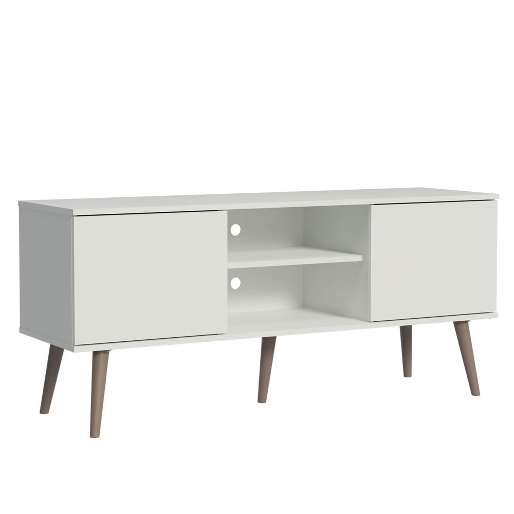 SPACIOUS TV STAND: Perfect for placing TVs, media consoles, and memorabilia. Adequate for both living room or bedroom AMPLE STORAGE: Space-smart design, 2 doors and 2 shelves, retro style feet DIMENSIONS: 24” H 16” D 54” L, Weight Capacity per Shelf: 11 lbs, Tabletop Weight Capacity: 66lbs CABLE MANAGEMENT: Holes in the back allow cables for various devices to pass through HIGH QUALITY PARTICLE BOARD: Manufactured with Renewable Wood, protected with 7 layers of premium paint CLEAR INSTRUCTIONS: Includes user-friendly illustrated instructions and hardware for a simple assembly, along with QR Code for video instructions