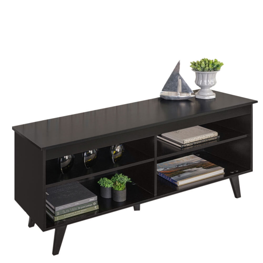 SPACIOUS TV STAND: Perfect for placing TVs, media consoles, and memorabilia. Adequate for both living room or bedroom AMPLE STORAGE: Features 4 spacious shelves and a wide tabletop, sturdy wood feet DIMENSIONS: 23” H 15” D 53” L, Weight Capacity per Shelf: 11 lbs, Tabletop Weight Capacity: 66lbs CABLE MANAGEMENT: Holes in the back allow cables for various devices to pass through HIGH QUALITY PARTICLE BOARD: Manufactured with Renewable Wood, protected with 7 layers of premium paint CLEAR INSTRUCTIONS: Includes user-friendly illustrated instructions and hardware for a simple assembly, along with QR Code for video instructions
