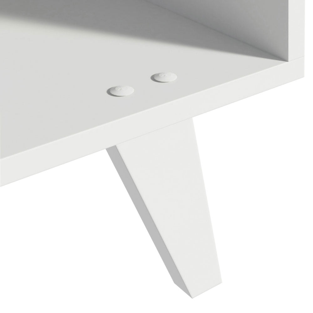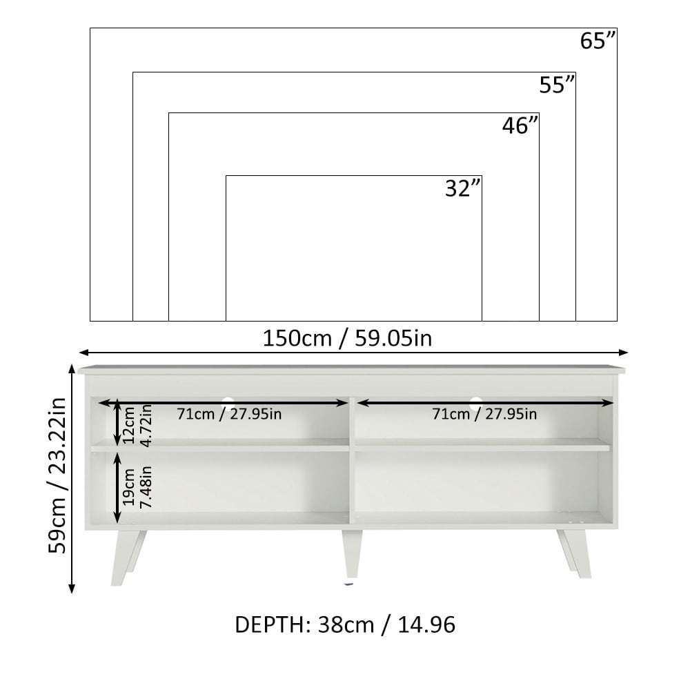 SPACIOUS TV STAND: Perfect for placing TVs, media consoles, and memorabilia. Adequate for both living room or bedroom AMPLE STORAGE: Features 4 spacious shelves and a wide tabletop, sturdy wood feet DIMENSIONS: 23” H 15” D 59” L, Weight Capacity per Shelf: 11 lbs, Tabletop Weight Capacity: 66lbs CABLE MANAGEMENT: Holes in the back allow cables for various devices to pass through HIGH QUALITY PARTICLE BOARD: Manufactured with Renewable Wood and high-durability finish CLEAR INSTRUCTIONS: Includes user-friendly illustrated instructions and hardware for a simple assembly, along with QR Code for video instructions.