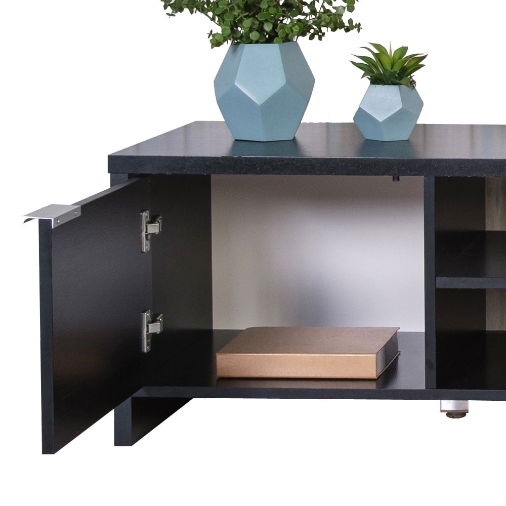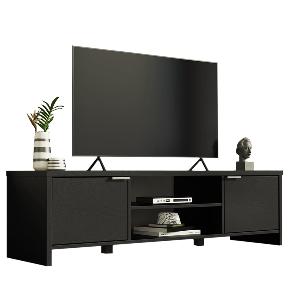 SPACIOUS TV STAND: Perfect for placing TVs, media consoles, and memorabilia. Ideal for placing your television in your living room AMPLE STORAGE: Features 2 cabinet doors with sleek metallic handles and 2 open shelves DIMENSIONS: 16” H 15” D 57” L, Weight Capacity per Shelf: 22lbs, Tabletop Weight Capacity: 66lbs CABLE MANAGEMENT: Open shelves to facilitate cables for various devices to pass through HIGH QUALITY PARTICLE BOARD: Manufactured with Renewable Wood, protected with 7 layers of premium paint CLEAR INSTRUCTIONS: Includes user-friendly illustrated instructions and hardware for a simple assembly, along with QR Code for video instructions