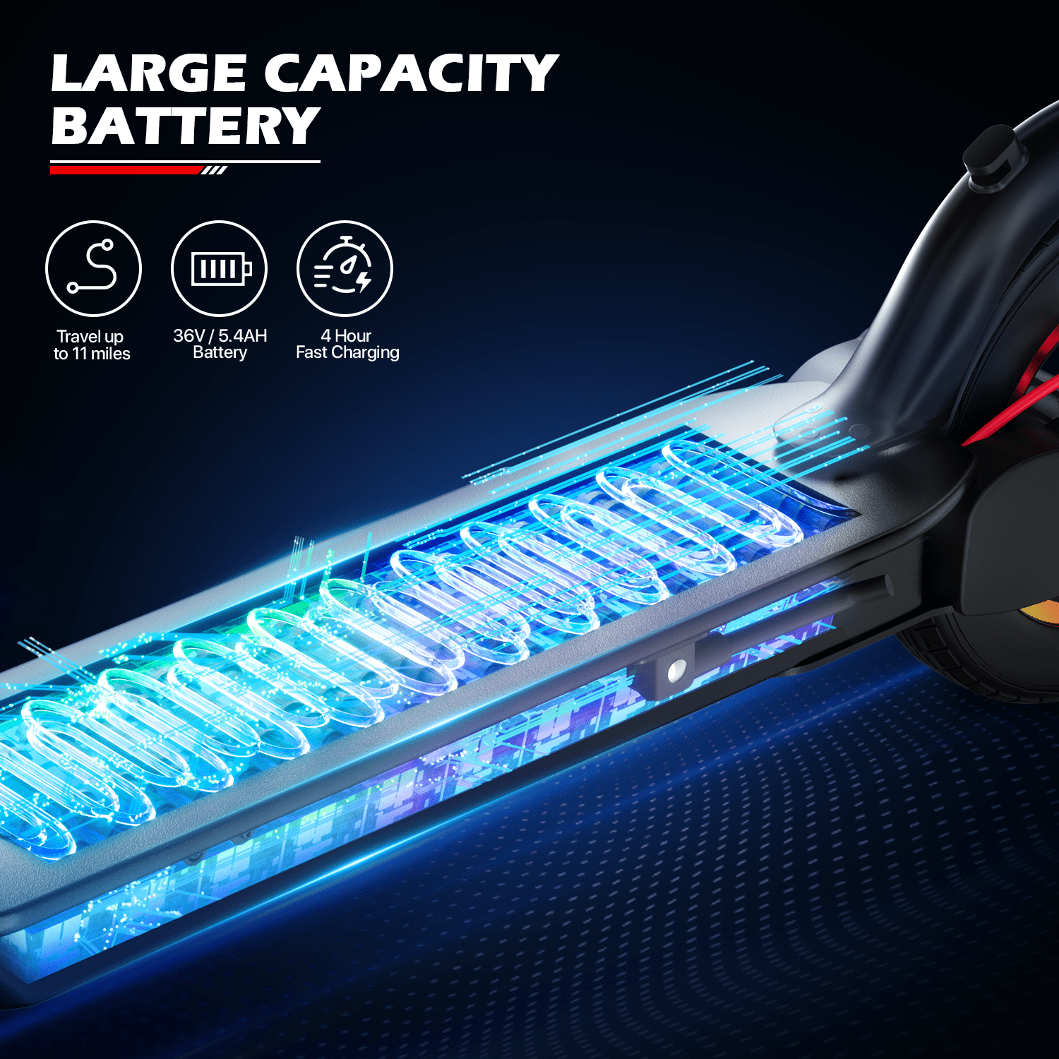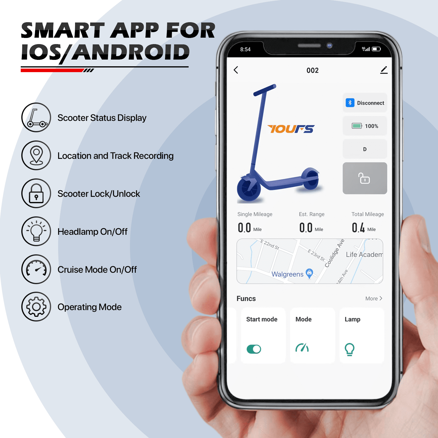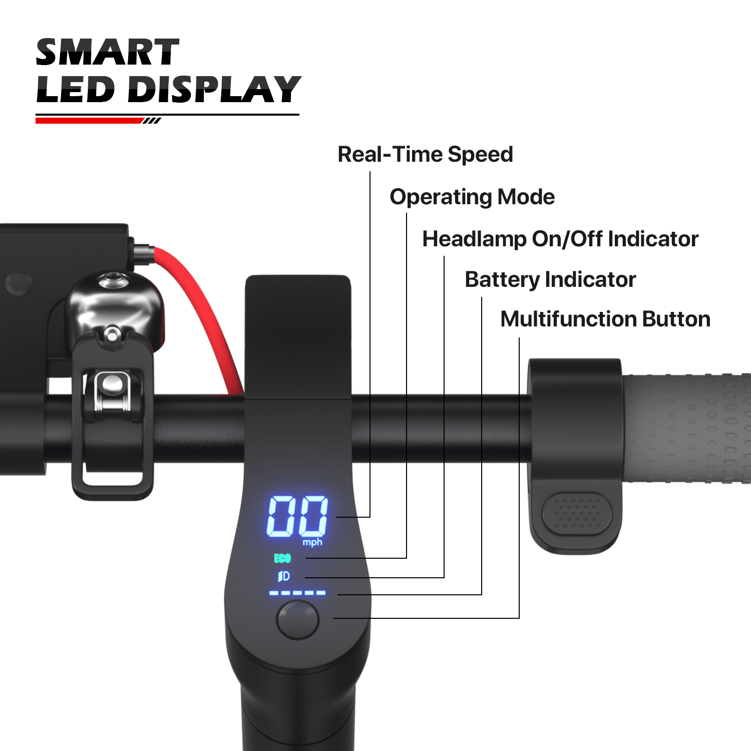 Brand: MADOG Product Type: Electric Scooter Color: Black Frame Material: Aluminum Alloy; Carbon Steel Overall Size: (L)43.0″ (W)17.0″ (H)46.5″ Folding Size: (L)43.0″ (W)17.0″ (H)21.0″ Weight: 30.86 lb Motor Power: 350W Battery Capacity: 36V 5.4AH Tires: 10.0″ Rubber Tire Certification: UL; IEC62133; RoHS Mechanical Performance Top Speed: Maximum 19MPH (Default) Range: Maximum 11 Miles (Depending on various conditions, driving styles, and traffic.) Fast Charging: Est.4 Hours (Come with fast charge adapter) Cable-Actuated Disc Brake System: The disc brake system provided strong stopping power and consistent braking. In meantime it was easy to clean and maintain. LED Headlight: High lumen LED headlight for night riding. Rear Brake Light: Linkage of the brake lever and rear light protects the rider at the emergency braking from the rear crash. Smart APP Features IOS/Android Available: All of your scooter’s information will be shown on the dashboard, the UI language is depending on the default language of your phone system. Keyless Operating: Remote to start or lock the scooter by your smartphone via Bluetooth connection. Recording Your Trip: Click “Start Riding” on the APP, your track will be shown on the map of your smartphone. You can record the miles and speed of the trip. Cruise Mode: Ture on the “Cruise Mode”, press and hold on the accelerator few seconds, the scooter will route even if you release the accelerator until you press it again. 3 Speed Modes Can Be Customized: The top speed of each mode can be revised separately, once you set up completely, just a click to switch gears. Commuting Scooter With a motor rated at 350W, a top speed of 19mph, a range of 11 Miles and max load of 250lbs, explore the city without worrying about running out of power. Safety & Comfort Featuring a cable-actuated disc brake system with a brake lever and brake disc, this electric scooter guarantees superior stopping power and immediate response. This system ensures safer, controlled rides by significantly reducing stopping distance, making the scooter a highly reliable choice for both urban commuting and leisurely rides. Superior Stability 10″ shock absorbing pneumatic tires, it is explosion-proof, anti-puncture and self-healing. Provides superior traction, improving the scooter’s performance on a variety of surfaces and terrains, including gravel, grass, and uneven pavement. Multifunctional Handlebars Accelerate throttle, brake lever, bell, and headlight control, deliver a comfortable and intuitive riding experience. This feature makes it a popular choice for riders seeking a safe, convenient, and enjoyable means of commuting or exploring their surroundings. Lightweight & Foldable Aluminum alloy and carbon steel frames are lightweight, which makes them easy to carry and maneuver. With one-click folding system, it’s great convenience for you to take it on the subway, bus or store in the trunk of your car. Product Note Max speed and range per charge vary based on several factors, including: rider weight, riding surface, incline, ambient temperature, battery level, riding style (stop/start vs cruising), etc.
