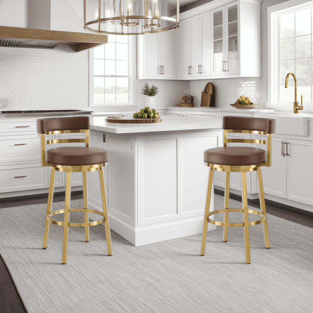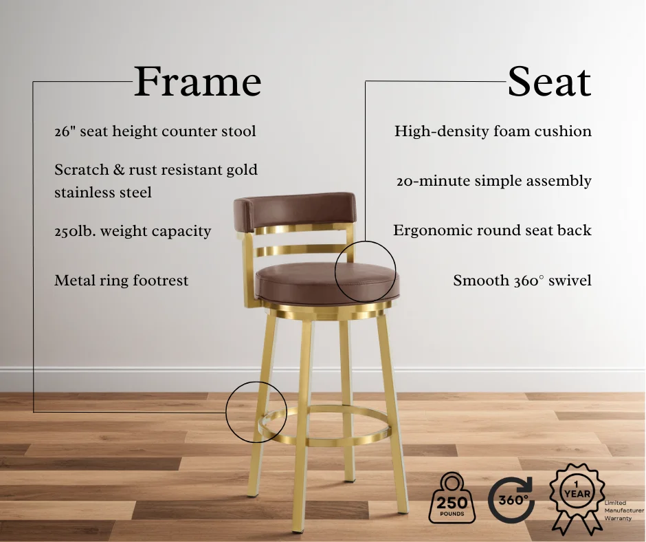 Madrid Bar Stool 26″ Seat Height Swivel with Gold Brushed Stainless Steel and Vintage Coffee Faux Leather
