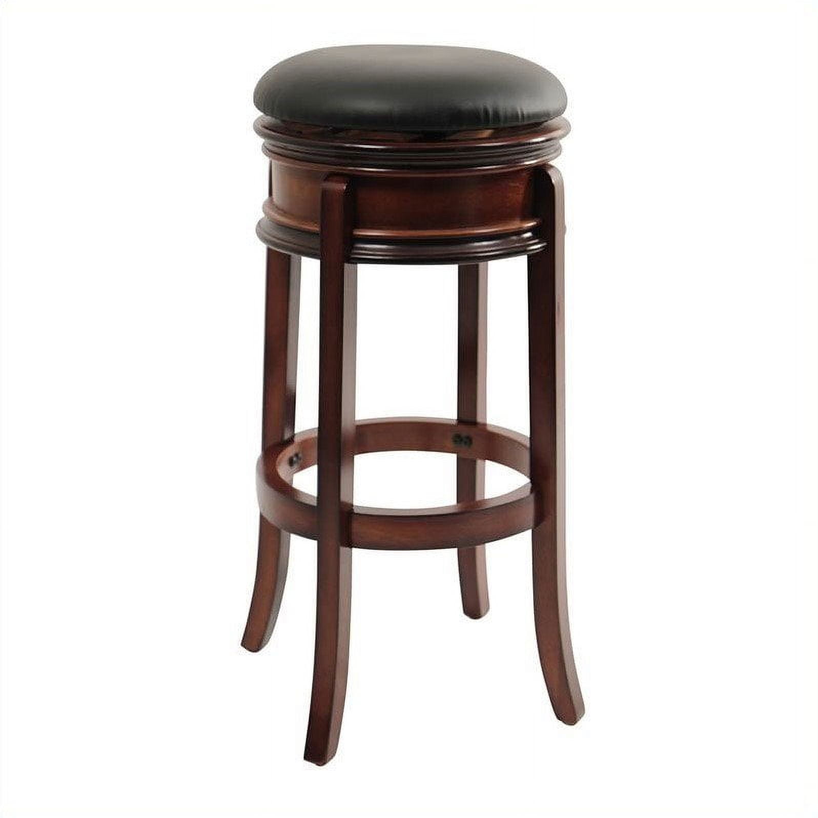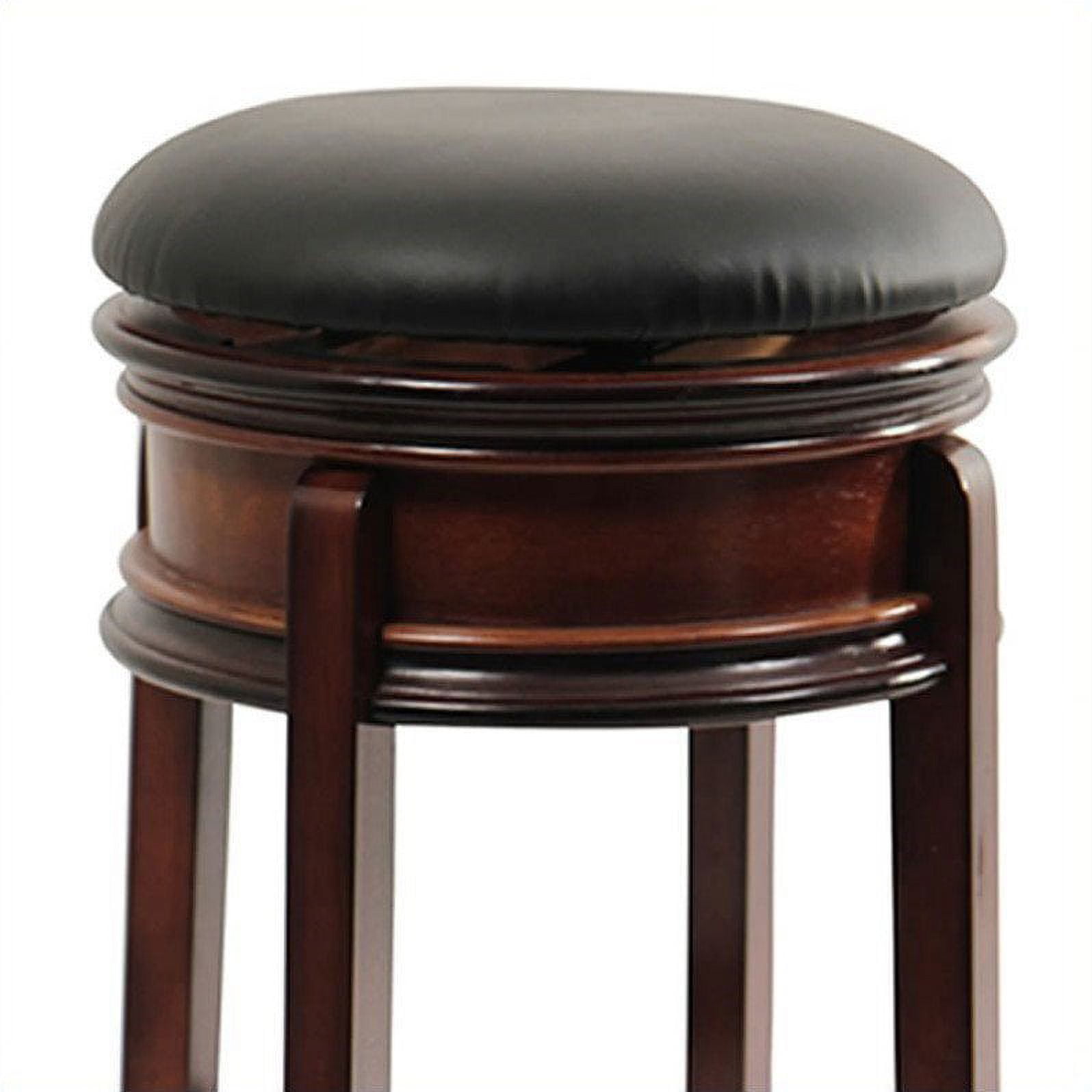 Accent your kitchen or bar with this Magellan 29″ backless Bar Stool. It features sturdy construction, is made from a solid hardwood and can add a touch of style to any den or dining area. This wooden counter stool’s flared legs and footrest offer comfort and added stability. The piece has a deep rich color and slightly glossy finish that allows it to complement a variety of color schemes and decors. It is topped with a swiveling black faux leather seat over high-density foam, as well as durable ball bearings that provide a full 360 degrees of swiveling action. This Magellan swivel counter-height stool makes an appealing addition to a home for comfortable, casual dining and happy hour cocktails. Assembly is required before use.