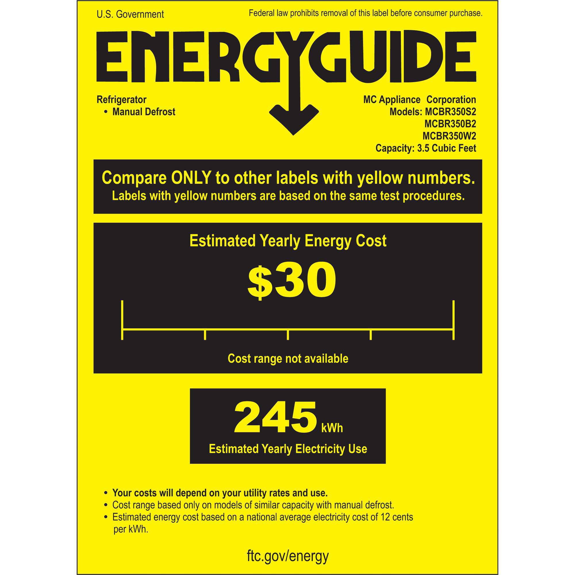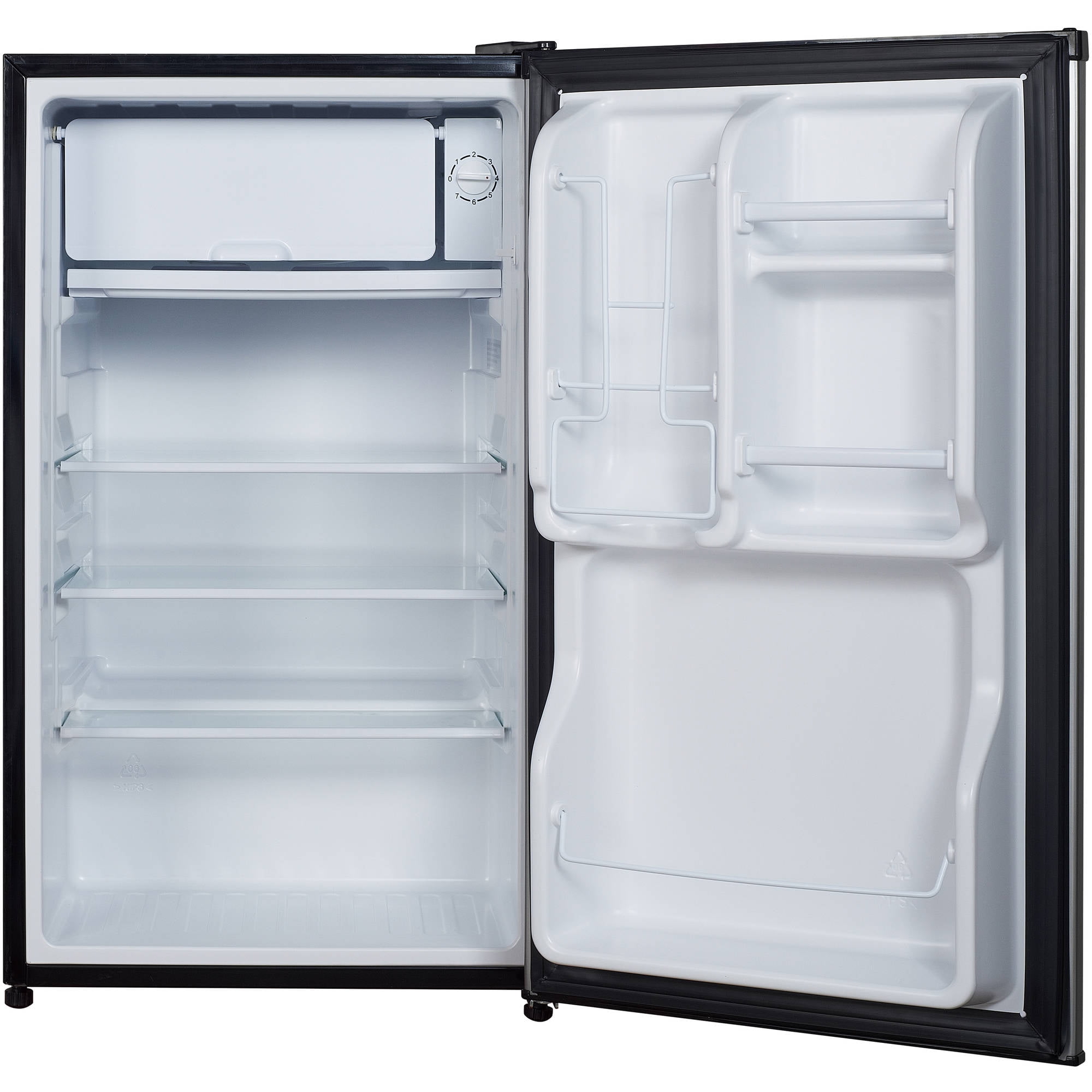 Magic Chef MCBR350B2 3.5-cu. ft. Refrigerator: Full-width freezer compartment temporarily houses frozen foods Adjustable temperature control and push-button defrost In-door can dispenser keeps 12 oz. beverage cans at your fingertips 3 removable and adjustable glass shelves for personalized configuration Reversible door converts to open left or right In-door storage shelves help keeps your fridge organized Interior light illuminates the fridge so you can easily grab and go Handy adjustable leveling legs help stabilize the refrigerator on uneven surfaces Freestanding, flush back design for easy positioning in your home or office 3.5 cu. ft. storage capacity 1-year warranty
