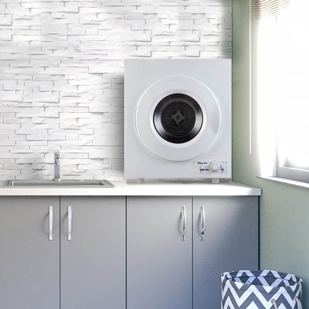 The Magic Chef 3.5 cu. ft. Electric Dryer in White is just what you need when you don’t have tons of space for a laundry setup. Its compact, space-saving design makes it perfect for apartments, dorms or even RVs. For added convenience, you can mount it on the wall, or place it on your countertop. It uses a standard 110-volt (120 VAC, 15 amp) outlet, eliminating the need for special wiring that is required with many other dryers. Its three temperature settings provide options for proper fabric care.