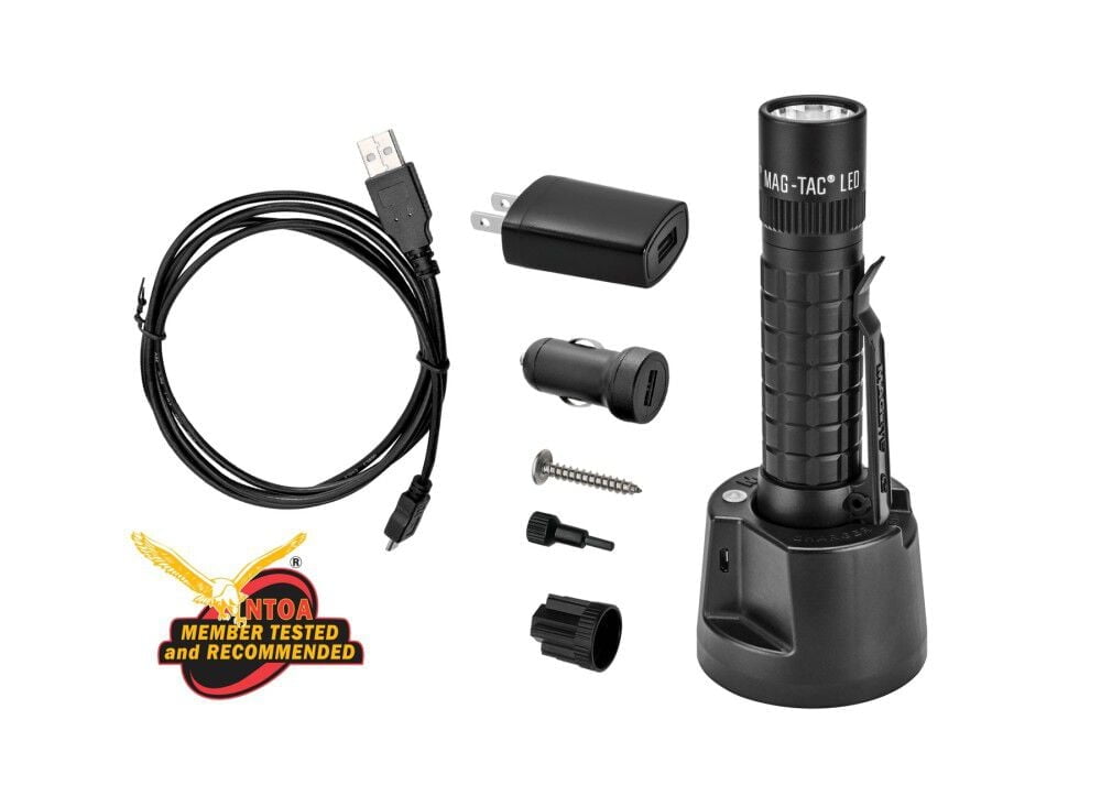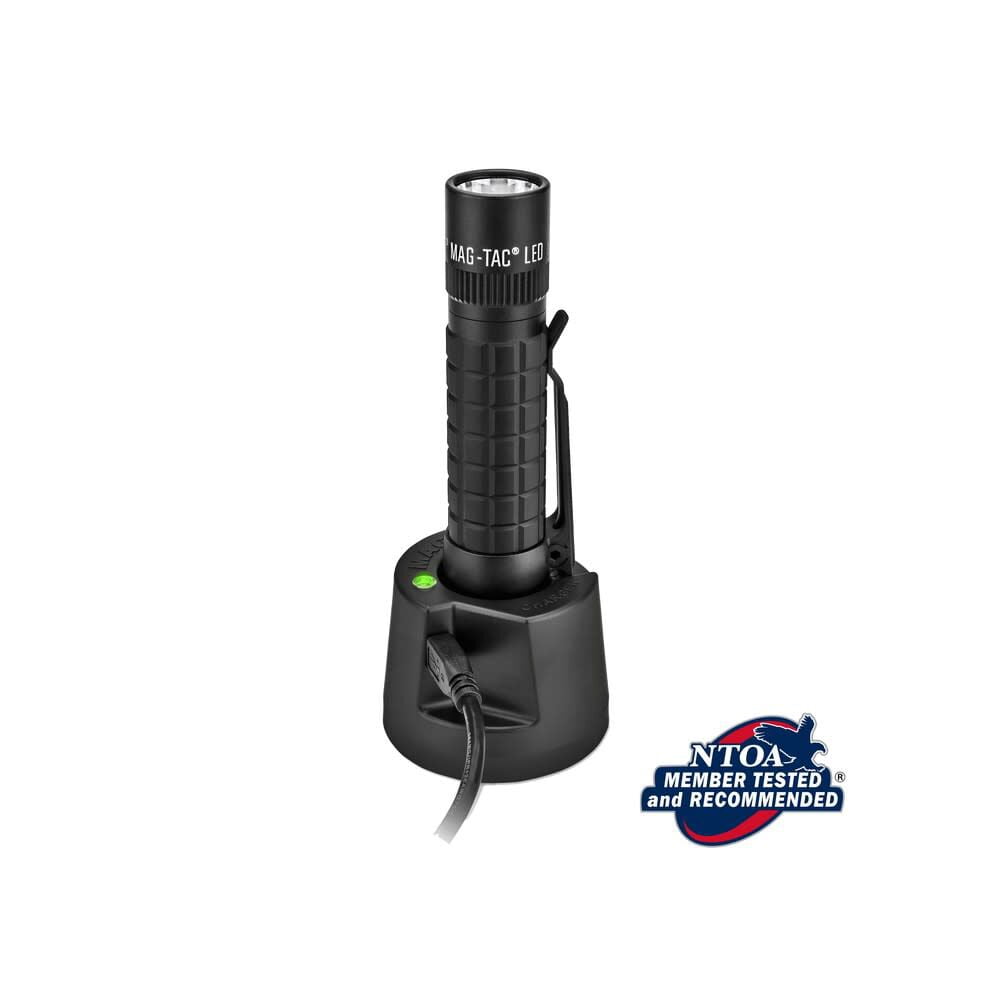 MAGLITE MAG-TAC LED 533 Lumens Flashlight Advanced lighting tool powered by a high capacity Lithium Iron Phosphate (LiFePO4) rechargeable battery Engineered for long service life with a 2.5-hour charge time Superior build quality and performance Plain-bezel version with a detachable pocket clip Includes a USB powered mountable charging base Charging base can be powered by the included 12V adapter or 120V converter Compatible with any charging source that complies with the USB 2.0 Standard Features 4 functions selectable through Mag Instrument’s tailcap-switch-activated “Quick-Click” mode selector Momentary function with 533 Lumens at 2 hours 30 minutes runtime Power Save function with 112 Lumens at 4 hours runtime Strobe function for added versatility
