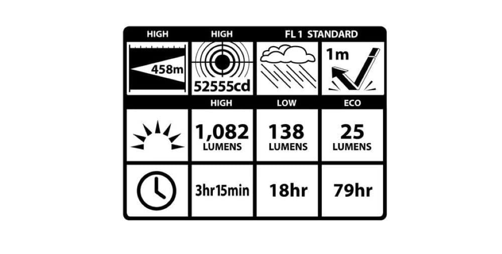 – 1,000 lumens on high, 120 lumens on low & 20 lumens on Eco 5 power settings–high/low/Eco/strobe/momentary 1,476ft beam distance Water-resistant (IPX4) runs up to 4 hours on high, 30 hours on low & 75 hours on Eco Rated for up to 2,000 cycles Recharges from dead in 2.5 hours Includes cradle, AC & DC adapter & instruction booklet