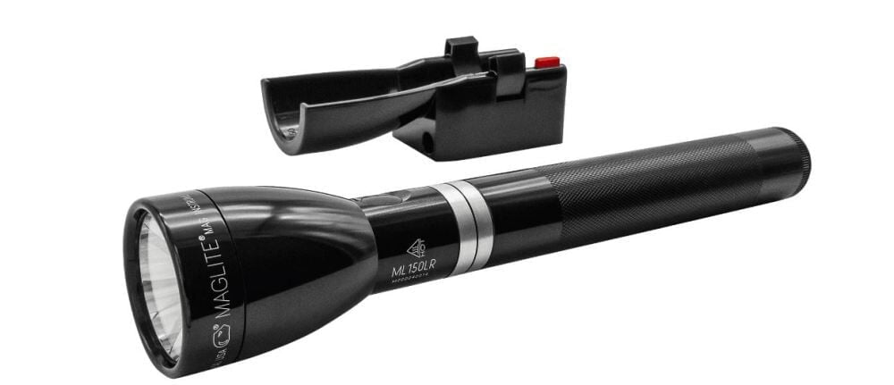 Maglite introduces its most powerful flashlight yet1,000-Lumen ML150LR LED Flashlight. Despite its midsize dimensions, the ML150LR generates a stunning 1,000 lumens and achieves a beam distance of over a quarter-mile. And thanks to multiple power settings and critical efficiency innovations, it can run for up to 75 hours on a single charge of its state-of-the-art Lithium Iron Phosphate battery. The cradle will allow you to mount it in any position. 1,000 lumens on high, 120 lumens on low & 20 lumens on Eco 5 power settings–high/low/Eco/strobe/momentary 1,476ft beam distance Water-resistant (IPX4) Rechargeable battery runs up to 4 hours on high, 30 hours on low & 75 hours on Eco Rated for up to 2,000 charge cycles Recharges from dead in 2.5 hours Includes charging cradle, AC & DC adapter & instruction booklet