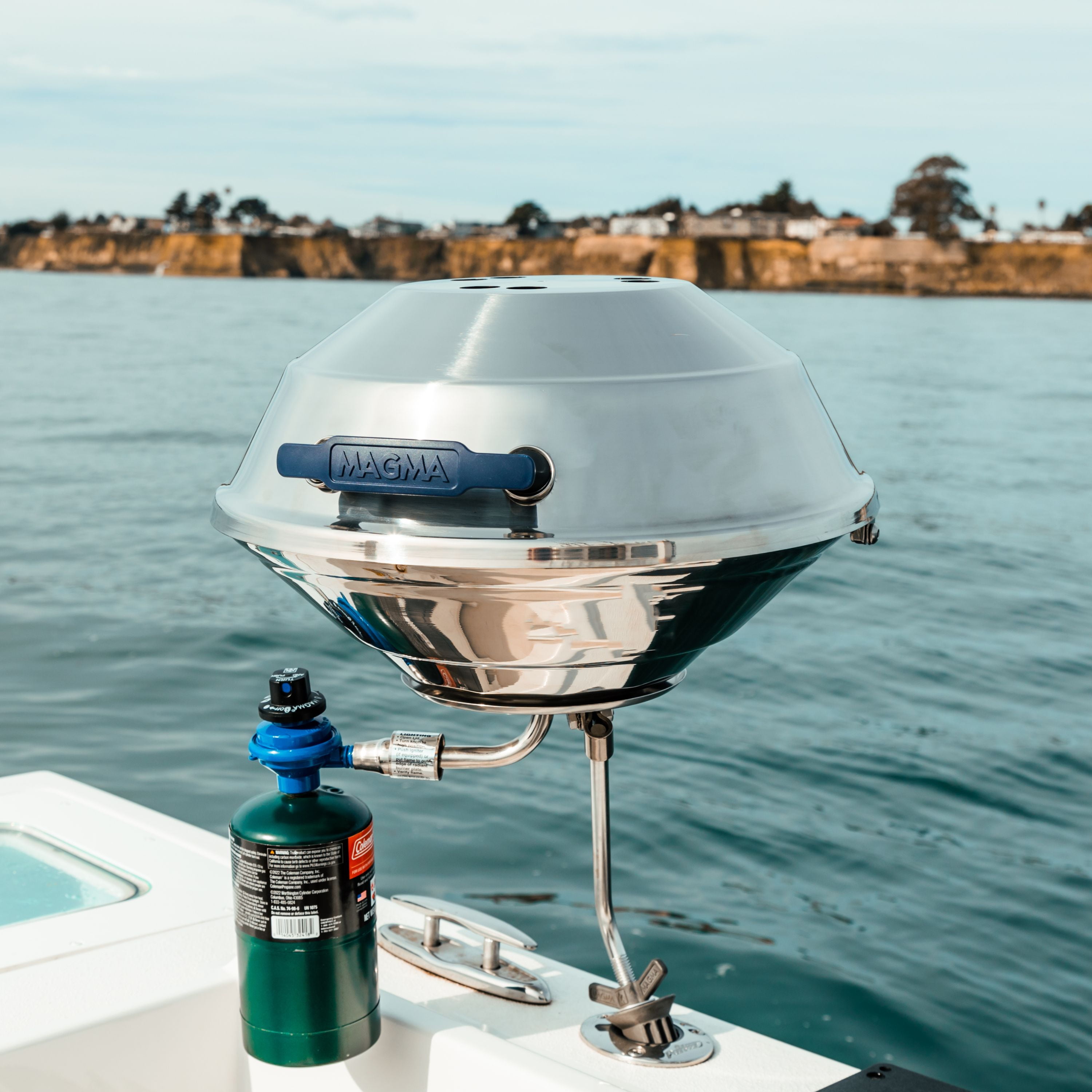 DURABLE AND LONG LASTING: This Magma boat grill is constructed of 100% 304 mirror polished stainless steel to resist corrosion, making it great for marine, camping, and outdoor use. FEATURE RICH: 15″ diameter grilling surface cooks for up to 6, balanced hinged lid (won’t fall overboard), and includes a removable radiant plate for even heat distribution and easy clean up. EFFICIENT AND DEPENDABLE: Powered by 10,700 BTUs, the swiveling turbo venturi tube eliminates blowouts and allows you to adjust the control valve inboard or outboard for any setup. SAFELY AND SECURELY MOUNT TO YOUR BOAT: Magma offers a wide range of mounting options to safely secure your grill to your boat (sold separately)